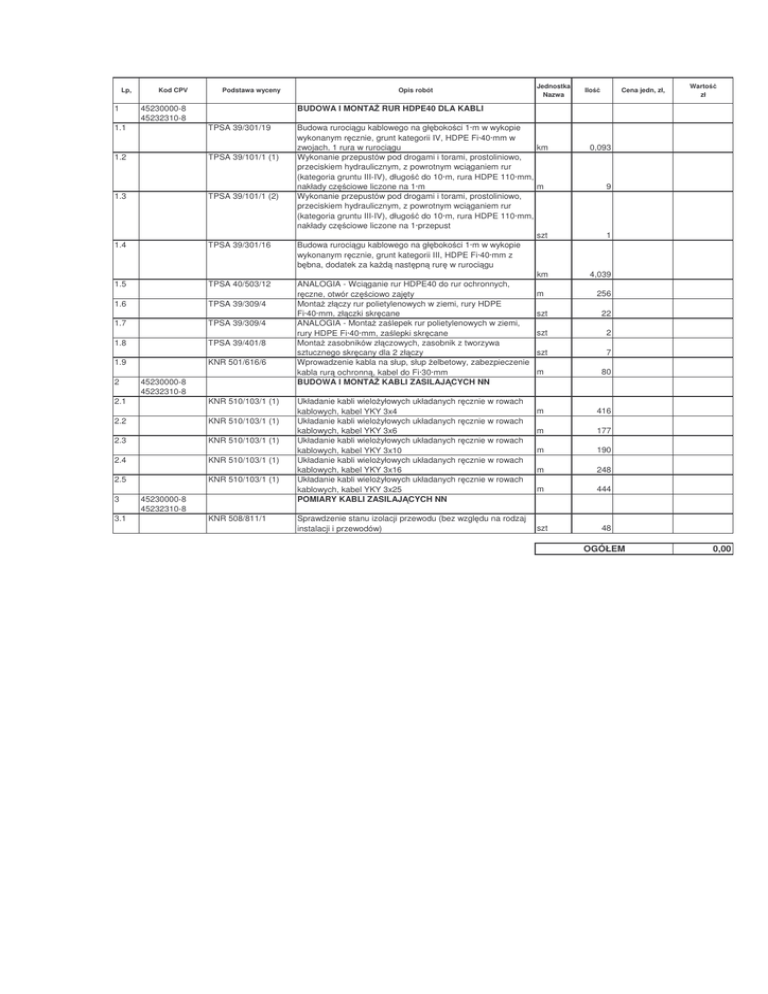 Lp, 1 Kod CPV Podstawa wyceny 45230000-8 45232310-8 TPSA 39/301/19 1.2 TPSA 39/101/1 (1) 1.3 TPSA 39/101/1 (2) 1.4 TPSA 39/301/16 1.5 TPSA 40/503/12 1.6 TPSA 39/309/4 1.7 TPSA 39/309/4 1.8 TPSA 39/401/8 1.9 KNR 501/616/6 45230000-8 45232310-8 2.1 KNR 510/103/1 (1) 2.2 KNR 510/103/1 (1) 2.3 KNR 510/103/1 (1) 2.4 KNR 510/103/1 (1) 2.5 KNR 510/103/1 (1) 3 3.1 Ilo Cena jedn, zł, Warto zł BUDOWA I MONTA RUR HDPE40 DLA KABLI 1.1 2 Jednostka Nazwa Opis robót 45230000-8 45232310-8 KNR 508/811/1 Budowa ruroci gu kablowego na gł boko ci 1·m w wykopie wykonanym r cznie, grunt kategorii IV, HDPE Fi·40·mm w km zwojach, 1 rura w ruroci gu Wykonanie przepustów pod drogami i torami, prostoliniowo, przeciskiem hydraulicznym, z powrotnym wci ganiem rur (kategoria gruntu III-IV), długo do 10·m, rura HDPE 110·mm, m nakłady cz ciowe liczone na 1·m Wykonanie przepustów pod drogami i torami, prostoliniowo, przeciskiem hydraulicznym, z powrotnym wci ganiem rur (kategoria gruntu III-IV), długo do 10·m, rura HDPE 110·mm, nakłady cz ciowe liczone na 1·przepust szt Budowa ruroci gu kablowego na gł boko ci 1·m w wykopie wykonanym r cznie, grunt kategorii III, HDPE Fi·40·mm z b bna, dodatek za ka d nast pn rur w ruroci gu km ANALOGIA - Wci ganie rur HDPE40 do rur ochronnych, m r czne, otwór cz ciowo zaj ty Monta zł czy rur polietylenowych w ziemi, rury HDPE szt Fi·40·mm, zł czki skr cane ANALOGIA - Monta za lepek rur polietylenowych w ziemi, szt rury HDPE Fi·40·mm, za lepki skr cane Monta zasobników zł czowych, zasobnik z tworzywa szt sztucznego skr cany dla 2 zł czy Wprowadzenie kabla na słup, słup elbetowy, zabezpieczenie m kabla rur ochronn , kabel do Fi·30·mm BUDOWA I MONTA KABLI ZASILAJ CYCH NN Układanie kabli wielo yłowych układanych r kablowych, kabel YKY 3x4 Układanie kabli wielo yłowych układanych r kablowych, kabel YKY 3x6 Układanie kabli wielo yłowych układanych r kablowych, kabel YKY 3x10 Układanie kabli wielo yłowych układanych r kablowych, kabel YKY 3x16 Układanie kabli wielo yłowych układanych r kablowych, kabel YKY 3x25 POMIARY KABLI ZASILAJ CYCH NN cznie w rowach cznie w rowach cznie w rowach cznie w rowach cznie w rowach Sprawdzenie stanu izolacji przewodu (bez wzgl du na rodzaj instalacji i przewodów) 0,093 9 1 4,039 256 22 2 7 80 m 416 m 177 m 190 m 248 m 444 szt 48 OGÓŁEM 0,00