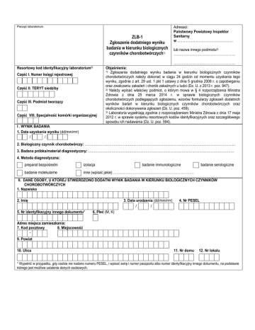 Pieczęć laboratorium ZLB-1 Zgłoszenie dodatniego wyniku badania w kierunku biologicznych czynników chorobotwórczych1) Resortowy kod identyfikacyjny laboratorium3) Część I. Numer księgi rejestrowej Część II. TERYT siedziby Część III. Podmiot tworzący Część VIII. Specjalność komórki organizacyjnej Adresaci: Państwowy Powiatowy Inspektor Sanitarny w ......................................................... lub nazwa innego podmiotu2) …………………………………………….. …………………………………………….. Objaśnienia: 1) Zgłoszenia dodatniego wyniku badania w kierunku biologicznych czynników chorobotwórczych należy dokonać w ciągu 24 godzin od momentu uzyskania tego wyniku, zgodnie z art. 29 ust. 1 pkt 1 ustawy z dnia 5 grudnia 2008 r. o zapobieganiu oraz zwalczaniu zakażeń i chorób zakaźnych u ludzi (Dz. U. z 2013 r. poz. 947). 2) Należy wpisać właściwy podmiot, o którym mowa w § 4 rozporządzenia Ministra Zdrowia z dnia 25 marca 2014 r. w sprawie biologicznych czynników chorobotwórczych podlegających zgłoszeniu, wzorów formularzy zgłoszeń dodatnich wyników badań w kierunku biologicznych czynników chorobotwórczych oraz okoliczności dokonywania zgłoszeń (Dz. U. poz. 459). 3) Laboratoria wypełniają zgodnie z rozporządzeniem Ministra Zdrowia z dnia 17 maja 2012 r. w sprawie systemu resortowych kodów identyfikacyjnych oraz szczegółowego sposobu ich nadawania (Dz. U. poz. 594). I . WYNIK BADANIA 1. Data uzyskania wyniku (dd/mm/rrrr) / / 2. Biologiczny czynnik chorobotwórczy: ………………………………………………………………………………………………………………… 3. Badana próbka/materiał diagnostyczny: ………………………………………………………………………………………………….…………. 4. Metoda diagnostyczna: badanie immunologiczne preparat bezpośredni izolacja badanie molekularne inne (wpisać jakie) …………………………………………………………… badanie serologiczne II. DANE OSOBY, U KTÓREJ STWIERDZONO DODATNI WYNIK BADANIA W KIERUNKU BIOLOGICZNYCH CZYNNIKÓW CHOROBOTWÓRCZYCH 1. Nazwisko 2. Imię 5. Nr identyfikacyjny innego dokumentu* 3. Data urodzenia (dd/mm/rrrr) / / 4. Nr PESEL 6. Płeć (M, K) Adres miejsca zamieszkania: 7. Kod pocztowy 8. Miejscowość 9. Powiat 10. Ulica 11. Nr domu 12. Nr lokalu * Wypełnić w przypadku, gdy osobie nie nadano numeru PESEL, i wpisać serię i numer paszportu albo numer identyfikacyjny innego dokumentu, na podstawie którego jest możliwe ustalenie danych osobowych. III. INNE INFORMACJE 1. Data pobrania próbki (dd/mm/rrrr) / / 2. Badana próbka pochodziła: od chorego hospitalizowanego od chorego leczonego ambulatoryjnie Adres szpitala: ………………………………………………………………… …………………………………………………………………………………… 3. Powód wykonania badania przyjęcie do szpitala diagnostyka kliniczna badanie pracownicze inne badanie przesiewowe inny powód, jaki ............................................................................................................................ ciąża 4. Nazwa i adres podmiotu, do którego wysłano materiał kliniczny lub wyizolowany biologiczny czynnik chorobotwórczy (próbki) w celu przeprowadzenia dalszych badań: …………………………………………………………………………………………………………………………………………………………………. ………………………………………………………………………………………………………………………………………………………………… 5. Oczekiwany kierunek i zakres dalszego badania: ………………………………………………………………………………………………. ………………………………………………………………………………………………………………………………………………………………… 6. Numer identyfikacyjny materiału klinicznego lub wyizolowanego biologicznego czynnika chorobotwórczego (próbki) wysłanego w celu przeprowadzenia dalszych badań: ………………………………………………………………………………………………………………………………………………………………… IV. UWAGI (w tym dodatkowe informacje istotne z punktu widzenia interpretacji uzyskanego dodatniego wyniku badania w kierunku biologicznych czynników chorobotwórczych): V. DANE ZGŁASZAJĄCEGO KIEROWNIKA LABORATORIUM 1. Pieczątka imienna .....................................…… 2. Telefon kontaktowy: ..................................…… 3. Podpis .................................................