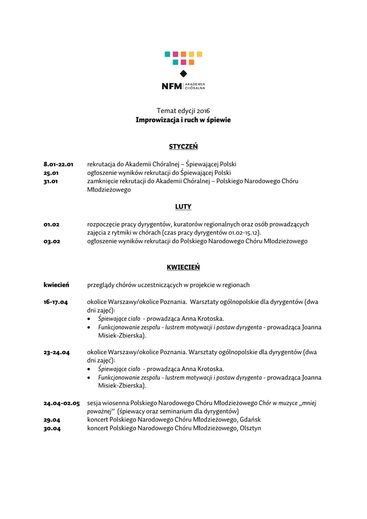 Temat edycji 2016 Improwizacja i ruch w śpiewie STYCZEŃ 8.01-22.01 25.01 31.01 rekrutacja do Akademii Chóralnej – Śpiewającej Polski ogłoszenie wyników rekrutacji do Śpiewającej Polski zamknięcie rekrutacji do Akademii Chóralnej – Polskiego Narodowego Chóru Młodzieżowego LUTY 01.02 03.02 rozpoczęcie pracy dyrygentów, kuratorów regionalnych oraz osób prowadzących zajęcia z rytmiki w chórach (czas pracy dyrygentów 01.02-15.12). ogłoszenie wyników rekrutacji do Polskiego Narodowego Chóru Młodzieżowego KWIECIEŃ kwiecień przeglądy chórów uczestniczących w projekcie w regionach 16-17.04 okolice Warszawy/okolice Poznania. Warsztaty ogólnopolskie dla dyrygentów (dwa dni zajęć): Śpiewające ciało - prowadząca Anna Krotoska. Funkcjonowanie zespołu - lustrem motywacji i postaw dyrygenta - prowadząca Joanna Misiek-Zbierska). 23-24.04 okolice Warszawy/okolice Poznania. Warsztaty ogólnopolskie dla dyrygentów (dwa dni zajęć): Śpiewające ciało - prowadząca Anna Krotoska. Funkcjonowanie zespołu - lustrem motywacji i postaw dyrygenta - prowadząca Joanna Misiek-Zbierska). 24.04-02.05 sesja wiosenna Polskiego Narodowego Chóru Młodzieżowego Chór w muzyce „mniej poważnej” (śpiewacy oraz seminarium dla dyrygentów) koncert Polskiego Narodowego Chóru Młodzieżowego, Gdańsk koncert Polskiego Narodowego Chóru Młodzieżowego, Olsztyn 29.04 30.04 MAJ 01.05 koncert Polskiego Narodowego Chóru Młodzieżowego, Bydgoszcz maj przeglądy chórów uczestniczących w projekcie w regionach – utwór obowiązkowy: J. Krutul – Ping Pong w czterech opracowaniach (jednogłos z fortepianem, dwugłos żeński, trzygłos żeński, czterogłos mieszany) 29.05 ogłoszenie chórów zakwalifikowanych do koncertów finałowych Akademii Chóralnej – Śpiewającej Polski CZERWIEC 4-5.06 Warsztaty dla dyrygentów zakwalifikowanych do koncertów finałowych Akademii Chóralnej – Śpiewającej Polski LIPIEC 11-18.07 15.07 16.07 17.07 sesja letnia Polskiego Narodowego Chóru Młodzieżowego Chór w operze barokowej (śpiewacy oraz seminarium dla dyrygentów) koncert Polskiego Narodowego Chóru Młodzieżowego koncert Polskiego Narodowego Chóru Młodzieżowego koncert Polskiego Narodowego Chóru Młodzieżowego PAŹDZIERNIK 11-12.10 11.10 26-27.10 27.10 26-27.10 pierwsza sesja finałowa Akademii Chóralnej – Śpiewającej Polski (chóry dziecięce) Koncert Finałowy I Śpiewającej Polski, Sala Główna NFM – Opera dziecięca – Jan Krutul (zamówienie Akademii Chóralnej) druga sesja finałowa Akademii Chóralnej – Śpiewającej Polski (chóry młodzieżowe) Koncert Finałowy II Śpiewającej Polski, Sala Główna NFM – Suita chóralna Rytmy Europy Jacek Sykulski (zamówienie Akademii Chóralnej) ogólnopolskie spotkanie kuratorów projektu Akademia Chóralna LISTOPAD listopad koncerty w regionach – jubileusze GRUDZIEŃ grudzień 15.12 koncerty w regionach – jubileusze w tym w Białymstoku: kompozycja Zuzanny Koziej – Pieśń Radości (zamówienie Akademii Chóralnej) oficjalny koniec pracy dyrygentów Śpiewającej Polski Inne działania: Wydawnictwa we współpracy z PWM: - Zbiór ćwiczeń rytmicznych dla chóru – opr. Marcin Wawruk Śpiewnik chóralny 1 – utwory świeckie na dwugłosowy chór żeński/dziecięcy Suita chóralna na chór mieszany i instrumenty perkusyjne Rytmy Europy, komp. Jacek Sykulski Uwagi: W harmonogramie nie zamieszczono dat działań regionalnych obligatoryjnych i fakultatywnych (warsztatów, koncertów i przeglądów, a także spotkań z Kuratorami). Plan pracy w regionach podany zostanie na stronie www oraz bezpośrednio dyrygentom do 15 marca 2016r.