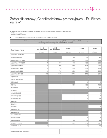 Załącznik cenowy „Cennik telefonów promocyjnych – Frii Biznes na raty” W okresie od dnia 20 marca 2013 roku do wyczerpania zapasów, Polska Telefonia Cyfrowa S.A. w ramach ofert: - „Frii Biznes na raty”, - „Witamy: Frii Biznes na raty” 1. Aparaty telefoniczne w promocyjnych cenach dla taryf: frii 140, frii 110, frii 80: Telefony oznaczone kolorem szarym są niedostępne w ofercie promocyjnej Frii Biznes na raty/ Witamy: Frii Biznes na raty Dostępne są w ofercie promocyjnej Frii Biznes/ Witamy: Frii Biznes. Model telefonu / Taryfa frii 140 (ab. 360 zł netto) frii 110 (ab. 240 zł netto) frii 140 frii 110 frii 80 zł brutto zł brutto zł brutto zł brutto zł brutto Alcatel One Touch 991D Apple iPhone 4 8GB 59 305 920 Apple iPhone 4/4S 16GB 1 1 969 1412 1830 Apple iPhone 4/4S 32GB 1 477 1412 1830 2273 Apple iPhone 4S 64GB 1 920 1830 2273 2691 Apple iPhone 5 16GB 1 59 1215 1658 2076 Apple iPhone 5 32GB 1 723 1658 2076 2519 Apple iPhone 5 64GB 305 1166 2076 2519 2937 1 59 Emporia Click Emporia TALKcomfort HTC Desire X HTC One 1 723 1166 1658 HTC One SV 1 1 1 477 LG Swift L3 LG Swift L5 (E610) 1 LG Swift L7 (P700) 1 1 1 LG Swift L9 (P760) 1 1 108 Nokia 100 Nokia 113 Nokia 603 1 Nokia Asha 203 Nokia Asha 302 1 Nokia C5-00 5MP 1 Nokia Lumia 800 Nokia Lumia 820 1 Nokia 808 PureView PRADA 3.0 od LG Obowiązuje od dnia 2013.03.20 1 1 1 1 1 59 305 846 1 600 1043 1584 1 1 1 969 1 Załącznik cenowy „Cennik telefonów promocyjnych – Frii Biznes na raty” RIM BlackBerry Bold 9790 RIM Blackberry Bold 9900 1 1 1 231 600 1 428 674 1215 1 1 1 1 1 600 1043 1535 RIM Blackberry Curve 9320 Samsung C3520 Samsung C3780 Samsung E2600 Samsung Galaxy Ace 2 (I8160) Samsung Galaxy Note II (N7100) 1 Samsung Galaxy mini 2 (S6500) Samsung Galaxy S III (I9300) 1 1 1 Samsung Galaxy S III mini (I8190N) 354 797 1289 1 1 305 Samsung Galaxy Y (S5360) 1 Samsung S5610 Samsung Solid (B2710) Sony Xperia J 1 Sony Xperia miro Sony Xperia P Sony Xperia T 1 1 1 1 305 231 551 1166 Sony Xperia Tipo Sony Xperia Z 1 1 1 846 Windows Phone 8S by HTC Windows Phone 8X by HTC Obowiązuje od dnia 2013.03.20 1 231 1289 1781 1 182 600 1166 2