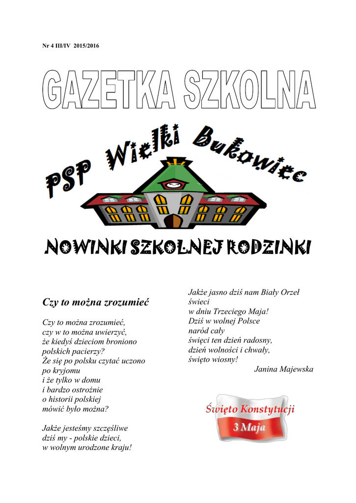 Nr 4 III/IV 2015/2016 NOWINKI SZKOLNEJ RODZINKI Czy to można zrozumieć Czy to można zrozumieć, czy w to można uwierzyć, że kiedyś dzieciom broniono polskich pacierzy? Że się po polsku czytać uczono po kryjomu i że tylko w domu i bardzo ostrożnie o historii polskiej mówić było można? Jakże jesteśmy szczęśliwe dziś my - polskie dzieci, w wolnym urodzone kraju! Jakże jasno dziś nam Biały Orzeł świeci w dniu Trzeciego Maja! Dziś w wolnej Polsce naród cały święci ten dzień radosny, dzień wolności i chwały, święto wiosny! Janina Majewska Wyniki Gminnego Konkursu Walentynkowego W konkursie wzięli udział uczniowie klas IV-VI ze szkół Gminy Skórcz. W tym roku szkolnym udział wzięli uczniowie z Pączewa, Mirotek i Wielkiego Bukowca. Zgodnie z regulaminem każda szkoła dokonała weryfikacji i oddała prace do udziału w konkursie. Celem konkursu było wykonanie kartki walentynkowej symboliką i tradycją obchodzenia święta zakochanych. Komisja konkursowa składająca się z pracowników naszej szkoły dokonała oceny prac, biorąc pod uwagę formę przestrzenno-płaską, estetykę wykonania, przekaz artystyczny, technikę plastyczną i inwencję twórczą. Jury po zliczeniu ilości głosów oceniło prace uczniów. I miejsce - Kinga Kobus - szkoła Pączewo, II miejsce - Wiktoria Bielińska - szkoła Mirotki, III miejsce - Amelia Kozłowska -szkoła Wielki Bukowiec, Wyróżnienia za wykonanie kartki walentynkowej: Agata Piontek - Pączewo, Zuzanna Wiśniewska- Pączewo, Aleksandra Wyczyńska- Pączewo, Karolina Godowska - Pączewo, Beata Janus - Mirotki Julia Szmit - Mirotki Weronika Kośmińska - Wielki Bukowiec Szymon Kośmiński - Wielki Bukowiec, Wystawa prac pokonkursowych znajduje się w naszej szkole. Fundatorem nagród była Rada Sołecka z Wielkiego Bukowca. Dziękujemy p. sołtys Mirosławie Wontka i jej przedstawicielom za ufundowanie nagród dla uczestników gminnego konkursu. Wszyscy, którzy wzięli w nim udział, otrzymali pamiątkowe dyplomy i upominki a zwycięzcy – nagrody. Dziękujemy za udział uczniom, nauczycielom i szkołom za pomoc w realizacji corocznego, gminnego konkursu. Organizatorzy M. Pater i A. Lubawska Misiek w Nowym Jorku Dnia 17.03.2016 r. odbył się wyjazd do kina Cinema City. Pojechaliśmy na bajkę pt. ,,Misiek w Nowym Jorku”. Fabuła filmu: Chciwy przedsiębiorca planuował wybudować sieć centrów handlowych i osiedli mieszkaniowych. Na północy zaczęły się pojawiać tłumy turystów, śmiecąc i zakłócając spokój zwierzakom. Poczciwy niedźwiedź polarny, zwany przez wszystkich Miśkiem, dostał arcytrudne zadanie. Miał wyruszyć do Nowego Jorku – siedziby biznesmena – i zniechęcić ludzi do zasiedlania Arktyki. W niebezpiecznej misji towarzyszyła mu trójka kompletnie nieobliczalnych lemingów. Spotkanie zwierzaków z północy z mieszkańcami wielkiego miasta zaowocowało serią nieporozumień, które rozbawiły wszystkich do białości!! Uczniów film rozbawił, sprawił, że miło spędzili czas. Szkolny Konkurs Polonistyczny w Lubichowie w Celem Konkursu Polonistycznego, który odbył się 18 marca 2016 r. Lubichowie dla klas V-VI, była 2 popularyzacja języka polskiego jako części polskiego dziedzictwa kulturowego, rozwijanie postaw dbałości o piękno i poprawność języka polskiego, rozwijanie zainteresowań i umiejętności polonistycznych. Uczniowie pisali test sprawdzający znajomość polskiej literatury, gramatyki, ortografii i interpunkcji. 1. miejsce zajął uczeń z naszej szkoły Krzyś Gwizdała , 2. miejsce uczeń z Lubichowa , a 3. miejsce uczennica z Bobowa. Gratulujemy zwycięzcom. Kinga Weisbrodt skutki opuszczania lekcji języka polskiego, matematyki i przyrody. Kolejnym zadaniem było wykonanie plakatu reklamującego nadejście wiosny. Ponadto klasy musiały zaprojektować i opisać trzy wiosenne stroje z materiałów recyklingowych: mundurek szkolny, suknia balowa, strój sportowy. Kreacje te Wiosenny turniej klas Dnia 23 marca panie Dorota Ciesielska i Magda Reszka zorganizowały Wiosenny turniej klas 4-6, w którym uczniowie rywalizowali o puchar przechodni. Na początku uczniowie przedstawili swoje stroje wagarowicza. Komisja wybrała trzy najlepsze. Wśród dziewcząt wygrały: Weronika Kośmińska, Kaja Krzewińska, Natalia Karbowska. Spośród chłopców wygrali: Szymon Kośmiński, Maciej Czarnecki, Krzysztof Gwizdała. Wszyscy uczniowie zdobyli dzięki temu punkty dla swoich klas. Następnym etapem były zadania dla klas, które uczniowie wykonywali razem ze swoimi wychowawcami. Pierwszym zadaniem było ułożenie scenki teatralnej pt. „Dlaczego warto chodzić do szkoły?”. przedstawione były podczas pokazu mody ekologicznej. Ostatnią częścią zabawy były rozgrywki sportowe prowadzone przez pana Jarka Wrzałkę. Gdy już wszystkie zadania zostały wykonane, uczniowie klas „0”-3 przyszli obejrzeć, jak ich starsi koledzy poradzili sobie z tymi zadaniami. Klasy były bardzo pomysłowe i jury miało trudności w wyłonieniu zwycięzców, ale jednak małą przewagą punktów wygrała klasa 5. Drugie miejsce przypadło klasie 6, a trzecie klasie - 4. To był bardzo miły i twórczy dzień! Kinga Weisbrodt Piotr Lewandowski Konkurs Recytatorski Dnia 13 i 14 marca 2016 r. odbył się w naszej szkole Szkolny Konkurs Recytatorski. Uczniowie recytowali wiersze w dwóch kategoriach wiekowych I-III i 12 z klas IV-VI. Celem konkursu było rozwijanie zdolności recytatorskich, zainteresowanie uczniów poezją, zachęcenie do występów na scenie, prezentacja umiejętności uczniów, uczenie rywalizacji w przyjaznej atmosferze i wyłonienie przedstawicieli W scence tej uczniowie musieli wykazać 3 naszej szkoły do udziału w Okręgowym Konkursie Recytatorskim w Lubichowie, Komisja konkursowa przyznała miejsca w kategorii uczniów klas I - III. 1 miejsce zajęły: Ewa Kreja, Karolina Fabich. 2. miejsce - Maja Kordowska 3. miejsce - Oliwia Sobisz Wyróż