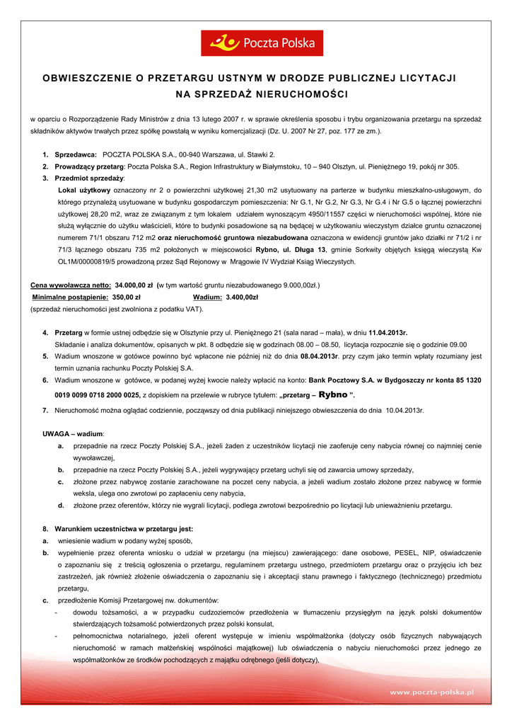 OBWIESZCZENIE O PRZETARGU USTNYM W DRODZE PUBLICZNEJ LI CYTACJI N A SPRZED AŻ NIERUCHOMOŚCI w oparciu o Rozporządzenie Rady Ministrów z dnia 13 lutego 2007 r. w sprawie określenia sposobu i trybu organizowania przetargu na sprzedaż składników aktywów trwałych przez spółkę powstałą w wyniku komercjalizacji (Dz. U. 2007 Nr 27, poz. 177 ze zm.). 1. Sprzedawca: POCZTA POLSKA S.A., 00-940 Warszawa, ul. Stawki 2. 2. Prowadzący przetarg: Poczta Polska S.A., Region Infrastruktury w Białymstoku, 10 – 940 Olsztyn, ul. Pieniężnego 19, pokój nr 305. 3. Przedmiot sprzedaży: Lokal użytkowy oznaczony nr 2 o powierzchni użytkowej 21,30 m2 usytuowany na parterze w budynku mieszkalno-usługowym, do którego przynależą usytuowane w budynku gospodarczym pomieszczenia: Nr G.1, Nr G.2, Nr G.3, Nr G.4 i Nr G.5 o łącznej powierzchni użytkowej 28,20 m2, wraz ze związanym z tym lokalem udziałem wynoszącym 4950/11557 części w nieruchomości wspólnej, które nie służą wyłącznie do użytku właścicieli, które to budynki posadowione są na będącej w użytkowaniu wieczystym działce gruntu oznaczonej numerem 71/1 obszaru 712 m2 oraz nieruchomość gruntowa niezabudowana oznaczona w ewidencji gruntów jako działki nr 71/2 i nr 71/3 łącznego obszaru 735 m2 położonych w miejscowości Rybno, ul. Długa 13, gminie Sorkwity objętych księgą wieczystą Kw OL1M/00000819/5 prowadzoną przez Sąd Rejonowy w Mrągowie IV Wydział Ksiąg Wieczystych. Cena wywoławcza netto: 34.000,00 zł (w tym wartość gruntu niezabudowanego 9.000,00zł.) Minimalne postąpienie: 350,00 zł Wadium: 3.400,00zł (sprzedaż nieruchomości jest zwolniona z podatku VAT). 4. Przetarg w formie ustnej odbędzie się w Olsztynie przy ul. Pieniężnego 21 (sala narad – mała), w dniu 11.04.2013r. Składanie i analiza dokumentów, opisanych w pkt. 8 odbędzie się w godzinach 08.00 – 08.50, licytacja rozpocznie się o godzinie 09.00 5. Wadium wnoszone w gotówce powinno być wpłacone nie później niż do dnia 08.04.2013r. przy czym jako termin wpłaty rozumiany jest termin uznania rachunku Poczty Polskiej S.A. 6. Wadium wnoszone w gotówce, w podanej wyżej kwocie należy wpłacić na konto: Bank Pocztowy S.A. w Bydgoszczy nr konta 85 1320 0019 0099 0718 2000 0025, z dopiskiem na przelewie w rubryce tytułem: „przetarg – Rybno ”. 7. Nieruchomość można oglądać codziennie, począwszy od dnia publikacji niniejszego obwieszczenia do dnia 10.04.2013r. UWAGA – wadium: a. przepadnie na rzecz Poczty Polskiej S.A., jeżeli żaden z uczestników licytacji nie zaoferuje ceny nabycia równej co najmniej cenie wywoławczej, b. przepadnie na rzecz Poczty Polskiej S.A., jeżeli wygrywający przetarg uchyli się od zawarcia umowy sprzedaży, c. złożone przez nabywcę zostanie zarachowane na poczet ceny nabycia, a jeżeli wadium zostało złożone przez nabywcę w formie weksla, ulega ono zwrotowi po zapłaceniu ceny nabycia, d. złożone przez oferentów, którzy nie wygrali licytacji, podlega zwrotowi bezpośrednio po licytacji lub unieważnieniu przetargu. 8. Warunkiem uczestnictwa w przetargu jest: a. wniesienie wadium w podany wyżej sposób, b. wypełnienie przez oferenta wniosku o udział w przetargu (na miejscu) zawierającego: dane osobowe, PESEL, NIP, oświadczenie o zapoznaniu się z treścią ogłoszenia o przetargu, regulaminem przetargu ustnego, przedmiotem przetargu oraz o przyjęciu ich bez zastrzeżeń, jak również złożenie oświadczenia o zapoznaniu się i akceptacji stanu prawnego i faktycznego (technicznego) przedmiotu przetargu, c. przedłożenie Komisji Przetargowej nw. dokumentów: - dowodu tożsamości, a w przypadku cudzoziemców przedłożenia w tłumaczeniu przysięgłym na język polski dokumentów - pełnomocnictwa notarialnego, jeżeli oferent występuje w imieniu współmałżonka (dotyczy osób fizycznych nabywających stwierdzających tożsamość potwierdzonych przez polski konsulat, nieruchomość w ramach małżeńskiej wspólności majątkowej) lub oświadczenia o nabyciu nieruchomości przez jednego ze współmałżonków ze środków pochodzących z majątku odrębnego (jeśli dotyczy), - w przypadku podmiotu gospodarczego aktualnego (nie starszego niż 3 m-ce) odpisu z Krajowego Rejestru Sądowego lub Ewidencji Działalności Gospodarczej oraz komplet dokumentów upoważniających do reprezentowania podmiotu w przetargu, - w przypadku spółek odpis Umowy Spółki i uchwałę Walnego Zgromadzenia Wspólników lub innego właściwego organu o zgodzie na - odpisu decyzji z Urzędu Skarbowego o nadaniu numeru identyfikacji podatkowej NIP, - w przypadku osób prawnych mających siedzibę za granicą lub jednostek organizacyjnych o których mowa w art. 33¹ KC (Ustawa nabycie nieruchomości, z dnia 23.04.1964 r. Kodeks Cywilny, Dz. U 1964 Nr 16, poz. 93 ze zm.), z siedzibą za granicą, dokumentów potwierdzających status prawny i rejestrację. Dokumenty sporządzone w języku innym niż polski powinny być przedłożone wraz z tłumaczeniem przysięgłym na język polski. Zagraniczne dokumenty urzędowe powinny być poświadczone przez właściwy konsulat/ambasadę RP. d. e. Przedłożenie Komisji Przetargowej dowodu wpłaty wadium. Przedłożenie Komisji Przetargowej oświadczenia o numerze rachunku bankowego, na który należy dokonać zwrotu wadium w przypadku niewygrania przez uczestnika przetargu oraz adres do korespondencji, na który należy odesłać inne dokumenty zebrane od oferenta zgodnie z ogłoszeniem o przetargu. 9. 10. Do przeprowadzenia przetargu wystarczy uczestnictwo jednego licytanta. Nabywca, pod rygorem utraty wadium i utraty prawa wynikającego z przybicia, jest obowiązany zapłacić cenę nabycia jednorazowo nie później niż na dwa dni robocze przed podpisaniem warunkowej umowy sprzedaży, przy czym jako termin wpłaty rozumiany jest termin uznania rachunku Poczty Polskiej S.A. 11. Kancelarię notarialną oraz datę akceptacji treści