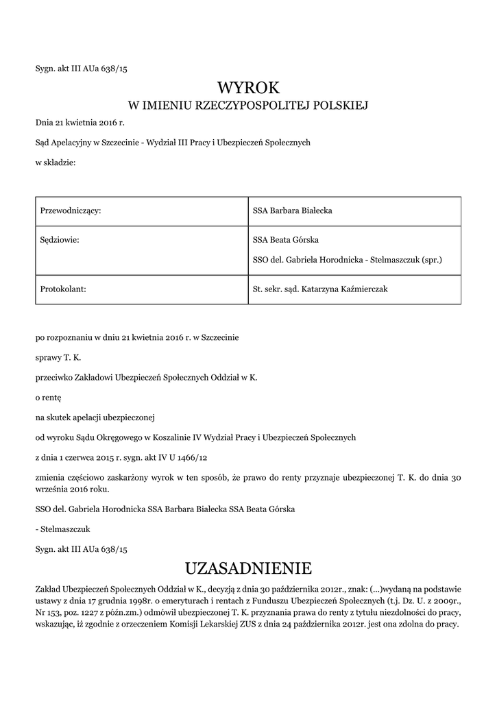Sygn. akt III AUa 638/15 WYROK W IMIENIU RZECZYPOSPOLITEJ POLSKIEJ Dnia 21 kwietnia 2016 r. Sąd Apelacyjny w Szczecinie - Wydział III Pracy i Ubezpieczeń Społecznych w składzie: Przewodniczący: SSA Barbara Białecka Sędziowie: SSA Beata Górska SSO del. Gabriela Horodnicka - Stelmaszczuk (spr.) Protokolant: St. sekr. sąd. Katarzyna Kaźmierczak po rozpoznaniu w dniu 21 kwietnia 2016 r. w Szczecinie sprawy T. K. przeciwko Zakładowi Ubezpieczeń Społecznych Oddział w K. o rentę na skutek apelacji ubezpieczonej od wyroku Sądu Okręgowego w Koszalinie IV Wydział Pracy i Ubezpieczeń Społecznych z dnia 1 czerwca 2015 r. sygn. akt IV U 1466/12 zmienia częściowo zaskarżony wyrok w ten sposób, że prawo do renty przyznaje ubezpieczonej T. K. do dnia 30 września 2016 roku. SSO del. Gabriela Horodnicka SSA Barbara Białecka SSA Beata Górska - Stelmaszczuk Sygn. akt III AUa 638/15 UZASADNIENIE Zakład Ubezpieczeń Społecznych Oddział w K., decyzją z dnia 30 października 2012r., znak: (...)wydaną na podstawie ustawy z dnia 17 grudnia 1998r. o emeryturach i rentach z Funduszu Ubezpieczeń Społecznych (t.j. Dz. U. z 2009r., Nr 153, poz. 1227 z późn.zm.) odmówił ubezpieczonej T. K. przyznania prawa do renty z tytułu niezdolności do pracy, wskazując, iż zgodnie z orzeczeniem Komisji Lekarskiej ZUS z dnia 24 października 2012r. jest ona zdolna do pracy. Ubezpieczona T. K. zaskarżyła powyższą decyzję i wniosła o jej zmianę poprzez przyznanie jej prawa do renty na dalszy okres, albowiem według ubezpieczonej jej stan zdrowia (stopień zaawansowania cukrzycy typu I) nie poprawił się a nawet pogorszył, gdyż pojawiły się dodatkowo nowe schorzenia. Zakład Ubezpieczeń Społecznych Oddział w K. w odpowiedzi na odwołanie wniósł o jego oddalenie powtarzając argumenty użyte w uzasadnieniu decyzji. Wyrokiem z dnia 1 czerwca 2015 r. Sąd Okręgowy w Koszalinie IV Wydział Pracy i Ubezpieczeń Społecznych zmienił decyzję Zakładu Ubezpieczeń Społecznych Oddział w K. z dnia 30 października 2012r. i ustalił, że ubezpieczonej T. K. przysługuje prawo do renty poczynając od 1 października 2012 r. do 31 grudnia 2013 r. Sąd Okręgowy oparł swoje rozstrzygnięcie na następujących ustaleniach faktycznych i rozważaniach prawnych: T. K. urodziła się (...) Posiada wykształcenie podstawowe. Nie ma wyuczonego zawodu. W przeszłości pracowała w gospodarstwie rolnym rodziców i jako salowa w domu małego dziecka i w żłobku. W okresie pobierania świadczeń rentowych zatrudniała się w charakterze pomocy kuchennej w żłobku (3/4 etatu) oraz do chwili obecnej pracuje w obniżonym wymiarze czasu pracy jako opiekunka środowiskowa w MOPS w K. (umowa zlecenie). Z uwagi na pogarszający się stan zdrowia ubezpieczona już w 2001 r. złożyła do organu rentowego wniosek o rentę. Zakład Ubezpieczeń Społecznych Oddział w K., decyzją z dnia 30 kwietnia 2001 r. przyznał T. K. rentę z tytułu częściowej niezdolności do pracy od 1 kwietnia 2001 r. do 30 kwietnia 2002 r. Prawo do renty zostało następnie przedłużone do 30 kwietnia 2004 r. Ponownie ubezpieczona złożyła wniosek o rentę w dniu 1 lipca 2005 r., który został pozytywnie rozpatrzony decyzją organu rentowego z dnia 12 sierpnia 2005 r., na mocy której przyznano jej rentę z tytułu częściowej niezdolności do pracy od 1 lipca 2005 r. do 31 lipca 2006 r. Prawo do renty zostało następnie przedłużone do 30 września 2012 r. Z uwagi na upływ terminu, na jaki świadczenie zostało przyznane, w dniu 26 września 2012 r. T. K. złożyła wniosek o ponowne ustalenie prawa do renty z tytułu niezdolności do pracy. W związku z powyższym, organ rentowy skierował ubezpieczoną na badania lekarskie dla ustalenia aktualnego stanu zdrowia i zdolności do pracy. Lekarz Orzecznik ZUS, po przeprowadzonych badaniach, orzeczeniem z dnia 9 października 2012 r. uznał ubezpieczoną za osobę częściowo niezdolną do pracy, okresowo do 31 października 2013 r. Do w/w orzeczenia zarzut wadliwości zgłosił Główny Lekarz Orzecznik, stąd sprawa stała się przedmiotem rozpoznania przez Komisję Lekarską ZUS. Komisja Lekarska ZUS w orzeczeniu z dnia 24 października 2012 r. stwierdziła, że ubezpieczona nie jest niezdolna do pracy. W oparciu o powyższe orzeczenie Zakład Ubezpieczeń Społecznych Oddział w K., decyzją z dnia 30 października 2012r., odmówił ubezpieczonej przyznania prawa do renty z tytułu niezdolności do pracy, wskazując, iż jest ona zdolna do pracy. W trakcie prowadzonego postępowania Sąd Okręgowy przeprowadził dowód z opinii biegłych lekarzy specjalistów diabetologów na okoliczność ustalenia, czy schorzenia na które cierpi ubezpieczona czynią ją nadal częściowo bądź całkowicie osobą niezdolną do pracy, a jeśli tak, to przez jaki okres. W toku badania u ubezpieczonej stwierdzono następujące schorzenia: - cukrzycę typu I – niewyrównana metabolicznie o chwiejnym przebiegu z hypoglikemiami, - hypercholersterolemię, - nadciśnienie tętnicze, - początki polineuropatii – polineuropatię cukrzycowa kliniczna kończyn dolnych, powikłaną modzelem neuropatycznym wymagająca diagnostyki i leczenia w przebiegu cukrzycy insulinozależnej, - migrenowe bóle głowy. Sąd Okręgowy ustalił, że ubezpieczona jest nadal częściowo niezdolna do pracy po dniu 30 września 2012 r., okresowo, do 31 grudnia 2013 r. i uznał, że odwołanie ubezpieczonej zasługuje na uwzględnienie, podnosząc, iż zgodnie z art. 57 ustawy z dnia 17 grudnia 1998 r. o emeryturach i rentach z Funduszu Ubezpieczeń Społecznych (t.j.Dz. U. z 2009r., Nr 153, poz. 1227 z późn.zm.) renta z tytułu niezdolności do pracy przysługuje ubezpieczonemu, który spełnił łącznie następujące warunki: 1) jest niezdolny do pracy; 2) ma wymagany okres składkowy i nieskładkowy; 3) niezdolność do pracy powstała w okresach, o których mowa w art. 6 ust. 1 pkt 1 i 2, pkt 3 lit. b