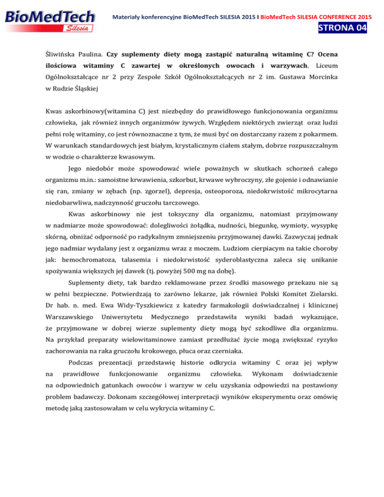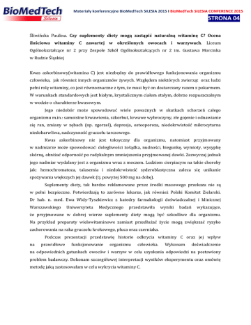 Materiały konferencyjne BioMedTech SILESIA 2015 I BioMedTech SILESIA CONFERENCE 2015 STRONA 042 Śliwińska Paulina. Czy suplementy diety mogą zastąpić naturalną witaminę C? Ocena ilościowa witaminy C zawartej w określonych owocach i warzywach. Liceum Ogólnokształcące nr 2 przy Zespole Szkół Ogólnokształcących nr 2 im. Gustawa Morcinka w Rudzie Śląskiej Kwas askorbinowy(witamina C) jest niezbędny do prawidłowego funkcjonowania organizmu człowieka, jak również innych organizmów żywych. Względem niektórych zwierząt oraz ludzi pełni rolę witaminy, co jest równoznaczne z tym, że musi być on dostarczany razem z pokarmem. W warunkach standardowych jest białym, krystalicznym ciałem stałym, dobrze rozpuszczalnym w wodzie o charakterze kwasowym. Jego niedobór może spowodować wiele poważnych w skutkach schorzeń całego organizmu m.in.: samoistne krwawienia, szkorbut, krwawe wybroczyny, złe gojenie i odnawianie się ran, zmiany w zębach (np. zgorzel), depresja, osteoporoza, niedokrwistość mikrocytarna niedobarwliwa, nadczynność gruczołu tarczowego. Kwas askorbinowy nie jest toksyczny dla organizmu, natomiast przyjmowany w nadmiarze może spowodować: dolegliwości żołądka, nudności, biegunkę, wymioty, wysypkę skórną, obniżać odporność po radykalnym zmniejszeniu przyjmowanej dawki. Zazwyczaj jednak jego nadmiar wydalany jest z organizmu wraz z moczem. Ludziom cierpiacym na takie choroby jak: hemochromatoza, talasemia i niedokrwistość syderoblastyczna zaleca się unikanie spożywania większych jej dawek (tj. powyżej 500 mg na dobę). Suplementy diety, tak bardzo reklamowane przez środki masowego przekazu nie są w pełni bezpieczne. Potwierdzają to zarówno lekarze, jak również Polski Komitet Zielarski. Dr hab. n. med. Ewa Widy-Tyszkiewicz z katedry farmakologii doświadczalnej i klinicznej Warszawskiego Uniwersytetu Medycznego przedstawiła wyniki badań wykazujące, że przyjmowane w dobrej wierze suplementy diety mogą być szkodliwe dla organizmu. Na przykład preparaty wielowitaminowe zamiast przedłużać życie mogą zwiększać ryzyko zachorowania na raka gruczołu krokowego, płuca oraz czerniaka. Podczas prezentacji przedstawię historie odkrycia witaminy C oraz jej wpływ na prawidłowe funkcjonowanie organizmu człowieka. Wykonam doświadczenie na odpowiednich gatunkach owoców i warzyw w celu uzyskania odpowiedzi na postawiony problem badawczy. Dokonam szczegółowej interpretacji wyników eksperymentu oraz omówię metodę jaką zastosowałam w celu wykrycia witaminy C.