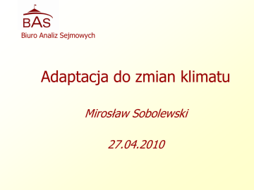 Biuro Analiz Sejmowych Adaptacja do zmian klimatu Mirosław Sobolewski 27.04.2010 Plan prezentacji: Co mówią prognozy nt. zmian klimatu Główne sektory wymagające adaptacji Programy adaptacyjne i ich instrumenty Adaptacja w polityce UE (zobowiązania) Koszty i odpowiedzialność globalna Zmiany klimatu są nieuniknione Protokół z Kioto nie zapewni wystarczającej redukcji emisji gazów szklarniowych. Wg. IPCC stabilizacja klimatu wymaga redukcji emisji o ok. 60-80% do 2050 r. Koncentracja CO2 rośnie o 3 ppm/rok; od 1990 r. globalna emisja wzrosła o ok. 30% (głównie w krajach rozwijających się). Oprócz ograniczania emisji konieczne jest podejmowanie działań adaptacyjnych. ADAPTACJA Adaptacja oznacza przewidywanie skutków zmian klimatu i podejmowanie działań w celu uniknięcia lub zminimalizowania szkód przez nie powodowanych oraz wykorzystania korzyści. Wczesne podjęcie takich działań umożliwi zmniejszenie kosztów szkód poniesionych w przyszłości. - Przykłady: Wyhodowanie nowych odmian roślin odpornych na susze Wzmocnienie infrastruktury przeciwpowodziowej; Efektywne wykorzystywanie zasobów wodnych. Scenariusze zmian klimatu Regiony najbardziej narażone: Afryka i basen Morza Śródziemnego Małe kraje wyspiarskie Delty wielkich rzek Regiony górskie Regiony polarne Co nam przyniosą zmiany klimatu? Problemy: Korzyści: • Fale upałów • Nawalne opady i wichury • Częstsze powodzie • Susze letnie • Wzrost poziomu morza • Brak śniegu • Nowe choroby • Wyższa temperatura Bałtyku • Mniej zachorowań zimą • Oszczędność na opale Główne sektory wymagające adaptacji Rolnictwo i leśnictwo Gospodarka wodna Zdrowie Ochrona wybrzeża Turystyka Budownictwo i infrastruktura Migracje Programy adaptacyjne: Konieczne na różnych szczeblach Duża rola władz publicznych - Instrumenty: Planowanie przestrzenne Programy rozwoju regionalnego Zarządzanie kryzysowe Strategiczne oceny oddziaływania na środowisko Systemy ubezpieczeń Planowanie działań adaptacyjnych: Włączać strony zainteresowane/narażone na konsekwencje zmian. Identyfikować działania priorytetowe. Przypisać konkretnym instytucjom odpowiedzialność za podjęcie działań i monitorować ich wdrażanie. Być elastycznym: dokonywać regularnych przeglądów i rewizji przyjętych strategii. Wytyczne UE w sprawie adaptacji Zielona Księga (2007) Cztery filary polityki adaptacyjnej: - Wczesne działania w obszarach najbardziej narażonych; uwzględnianie zmian klimatu w strategiach sektorowych; - Konieczność intensyfikacji badań naukowych; - Włączanie społeczeństwa, biznesu i sektora publicznego w prace nad tworzeniem skoordynowanych strategii adaptacji; - Wspólnota powinna świadczyć pomoc w adaptacji krajom najbardziej wrażliwym. Biała Księga (Kwiecień 2009) Etap I : - Przegląd i opracowanie sektorowych programów adaptacji m.in. dla gospodarki wodnej, rolnictwa, ochrony zdrowia, gospodarki wybrzeża, obszarów chronionych, obszarów górskich. Na ich podstawie opracowanie strategii adaptacyjnej kraju, która musi być przekazana do Komisji Europejskiej do końca 2012 r. - System wymiany informacji nt. dobrych praktyk, ocen ryzyka i wrażliwości itp. Etap II : - W oparciu o strategie krajowe powstanie strategia UE, która następnie będzie wdrażana Finansowanie działań adaptacyjnych: 5-25% całości kosztów polityki klimatycznej; Brak szacunków dotyczących działań krajowych Potencjalne źródła: przychody z EU ETS i GIS Odpowiedzialność globalna Wielkie potrzeby adaptacyjne w krajach rozwijających się szacunki 8 – 86 mld USD rocznie Fundusz Adaptacyjny UNFCCC (300 mln USD do 2012 r.) Potrzebne nowe źródła finansowania Biuro Analiz Sejmowych Dziękuję za uwagę! Mirosław Sobolewski [email protected]