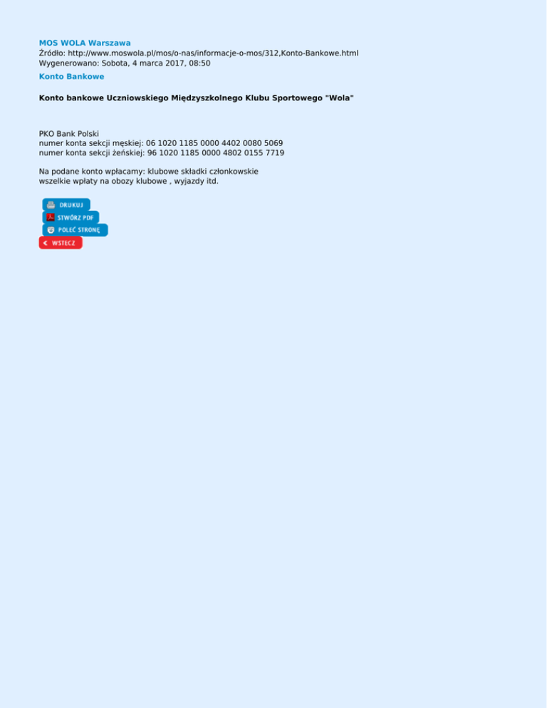 MOS WOLA Warszawa Źródło: http://www.moswola.pl/mos/o-nas/informacje-o-mos/312,Konto-Bankowe.html Wygenerowano: Sobota, 4 marca 2017, 08:50 Konto Bankowe Konto bankowe Uczniowskiego Międzyszkolnego Klubu Sportowego "Wola" PKO Bank Polski numer konta sekcji męskiej: 06 1020 1185 0000 4402 0080 5069 numer konta sekcji żeńskiej: 96 1020 1185 0000 4802 0155 7719 Na podane konto wpłacamy: klubowe składki członkowskie wszelkie wpłaty na obozy klubowe , wyjazdy itd.
