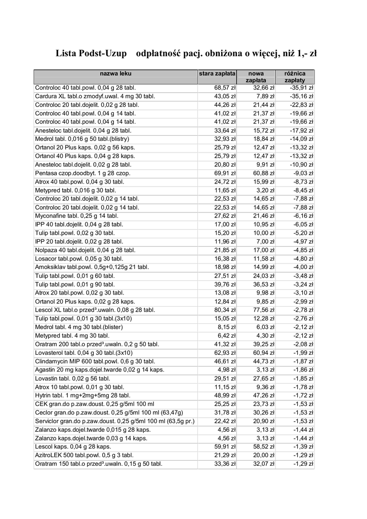 Lista Podst-Uzup odpłatność pacj. obniżona o więcej, niż 1,