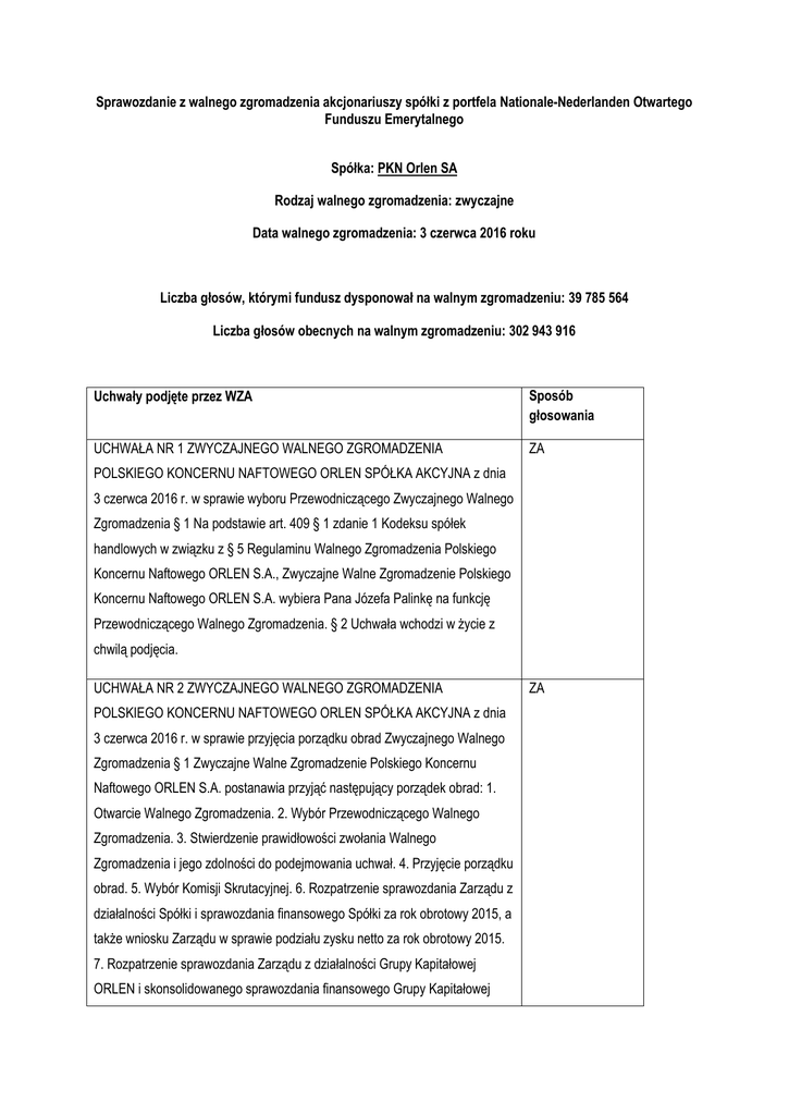 Sprawozdanie z walnego zgromadzenia akcjonariuszy spółki z portfela Nationale-Nederlanden Otwartego Funduszu Emerytalnego Spółka: PKN Orlen SA Rodzaj walnego zgromadzenia: zwyczajne Data walnego zgromadzenia: 3 czerwca 2016 roku Liczba głosów, którymi fundusz dysponował na walnym zgromadzeniu: 39 785 564 Liczba głosów obecnych na walnym zgromadzeniu: 302 943 916 Uchwały podjęte przez WZA Sposób głosowania UCHWAŁA NR 1 ZWYCZAJNEGO WALNEGO ZGROMADZENIA ZA POLSKIEGO KONCERNU NAFTOWEGO ORLEN SPÓŁKA AKCYJNA z dnia 3 czerwca 2016 r. w sprawie wyboru Przewodniczącego Zwyczajnego Walnego Zgromadzenia § 1 Na podstawie art. 409 § 1 zdanie 1 Kodeksu spółek handlowych w związku z § 5 Regulaminu Walnego Zgromadzenia Polskiego Koncernu Naftowego ORLEN S.A., Zwyczajne Walne Zgromadzenie Polskiego Koncernu Naftowego ORLEN S.A. wybiera Pana Józefa Palinkę na funkcję Przewodniczącego Walnego Zgromadzenia. § 2 Uchwała wchodzi w życie z chwilą podjęcia. UCHWAŁA NR 2 ZWYCZAJNEGO WALNEGO ZGROMADZENIA POLSKIEGO KONCERNU NAFTOWEGO ORLEN SPÓŁKA AKCYJNA z dnia 3 czerwca 2016 r. w sprawie przyjęcia porządku obrad Zwyczajnego Walnego Zgromadzenia § 1 Zwyczajne Walne Zgromadzenie Polskiego Koncernu Naftowego ORLEN S.A. postanawia przyjąć następujący porządek obrad: 1. Otwarcie Walnego Zgromadzenia. 2. Wybór Przewodniczącego Walnego Zgromadzenia. 3. Stwierdzenie prawidłowości zwołania Walnego Zgromadzenia i jego zdolności do podejmowania uchwał. 4. Przyjęcie porządku obrad. 5. Wybór Komisji Skrutacyjnej. 6. Rozpatrzenie sprawozdania Zarządu z działalności Spółki i sprawozdania finansowego Spółki za rok obrotowy 2015, a także wniosku Zarządu w sprawie podziału zysku netto za rok obrotowy 2015. 7. Rozpatrzenie sprawozdania Zarządu z działalności Grupy Kapitałowej ORLEN i skonsolidowanego sprawozdania finansowego Grupy Kapitałowej ZA ORLEN za rok obrotowy 2015. 8. Rozpatrzenie sprawozdania Rady Nadzorczej za rok 2015 spełniającego wymogi Kodeksu spółek handlowych i Dobrych Praktyk Spółek Notowanych na Giełdzie Papierów Wartościowych. 9. Podjęcie uchwały w sprawie zatwierdzenia sprawozdania Zarządu z działalności Spółki za rok obrotowy 2015. 10. Podjęcie uchwały w sprawie zatwierdzenia sprawozdania finansowego Spółki za rok obrotowy 2015. 11. Podjęcie uchwały w sprawie zatwierdzenia sprawozdania Zarządu z działalności Grupy Kapitałowej ORLEN za rok obrotowy 2015. 12. Podjęcie uchwały w sprawie zatwierdzenia skonsolidowanego sprawozdania finansowego Grupy Kapitałowej ORLEN za rok obrotowy 2015. 13. Podjęcie uchwały w sprawie podziału zysku netto za rok obrotowy 2015 oraz ustalenia dnia dywidendy i terminu jej wypłaty. 14. Podjęcie uchwał w sprawie udzielenia członkom Zarządu Spółki absolutorium z wykonania przez nich obowiązków w roku 2015. 15. Podjęcie uchwał w sprawie udzielenia członkom Rady Nadzorczej Spółki absolutorium z wykonania przez nich obowiązków w roku 2015. 16. Podjęcie uchwały w sprawie ustalenia liczby członków Rady Nadzorczej. 17. Podjęcie uchwał w sprawie powołania członków Rady Nadzorczej na nową kadencję. 18. Zamknięcie obrad Walnego Zgromadzenia. 3 § 2 Uchwała wchodzi w życie z chwilą podjęcia. UCHWAŁA NR 3 ZWYCZAJNEGO WALNEGO ZGROMADZENIA ZA POLSKIEGO KONCERNU NAFTOWEGO ORLEN SPÓŁKA AKCYJNA z dnia 3 czerwca 2016 r. w sprawie wyboru Komisji Skrutacyjnej § 1 Na podstawie § 8 Regulaminu Walnego Zgromadzenia Polskiego Koncernu Naftowego ORLEN S.A., Zwyczajne Walne Zgromadzenie Polskiego Koncernu Naftowego ORLEN S.A. powołuje w skład Komisji Skrutacyjnej następujące osoby: - Dorota Maćkiewicz, - Agnieszka Milke, - Łukasz Pijanowski. § 2 Uchwała wchodzi w życie z chwilą podjęcia. UCHWAŁA NR 4 ZWYCZAJNEGO WALNEGO ZGROMADZENIA POLSKIEGO KONCERNU NAFTOWEGO ORLEN SPÓŁKA AKCYJNA z dnia 3 czerwca 2016 r. w sprawie zatwierdzenia sprawozdania Zarządu z działalności Spółki za rok obrotowy 2015 § 1 Na podstawie art. 395 § 2 pkt 1 Kodeksu spółek handlowych oraz § 7 ust. 7 pkt 1 Statutu Spółki, Zwyczajne Walne Zgromadzenie Polskiego Koncernu Naftowego ORLEN S.A., po uprzednim rozpatrzeniu i zapoznaniu się z oceną Rady Nadzorczej Spółki, postanawia zatwierdzić sprawozdanie Zarządu Spółki z działalności Polskiego Koncernu Naftowego ORLEN Spółka Akcyjna za rok zakończony 31 grudnia ZA 2015 roku. § 2 Uchwała wchodzi w życie z dniem podjęcia. UCHWAŁA NR 5 ZWYCZAJNEGO WALNEGO ZGROMADZENIA POLSKIEGO KONCERNU NAFTOWEGO ORLEN SPÓŁKA AKCYJNA z dnia ZA 3 czerwca 2016 r. w sprawie zatwierdzenia sprawozdania finansowego Spółki za rok obrotowy 2015 § 1 Na podstawie art. 395 § 2 pkt 1 Kodeksu spółek handlowych oraz art. 45 i art. 53 ust. 1 Ustawy o rachunkowości w związku z § 7 ust. 7 pkt 1 Statutu Spółki, Zwyczajne Walne Zgromadzenie Polskiego Koncernu Naftowego ORLEN S.A., po uprzednim rozpatrzeniu i zapoznaniu się z oceną Rady Nadzorczej Spółki, postanawia zatwierdzić przedłożone przez Zarząd Spółki jednostkowe sprawozdanie finansowe Polskiego Koncernu Naftowego ORLEN Spółka Akcyjna za rok zakończony 31 grudnia 2015 roku zbadane przez biegłego rewidenta, na które składa się: • jednostkowy rachunek zysków lub strat (ujęty w sprawozdaniu z zysków lub strat i innych całkowitych dochodów) za okres od 1 stycznia 2015 roku do 31 grudnia 2015 roku zamykający się zyskiem netto w kwocie 1 047 519 491,84 zł (słownie: jeden miliard czterdzieści siedem milionów pięćset dziewiętnaście tysięcy czterysta dziewięćdziesiąt jeden złotych 84/100); • jednostkowe sprawozdanie z sytuacji finansowej na dzień 31 grudnia 2015 roku wykazujące tak po stronie aktywów jak i pasywów kwotę 36 980 669 667,80 zł (słownie: trzydzieści sześć miliardów dziewięćset osiemdziesiąt milionów sześćset sześćdziesiąt dziewięć tysięcy sześćset sześćdziesiąt siedem złotych 80/100); • jednostkowe sprawozdanie ze 