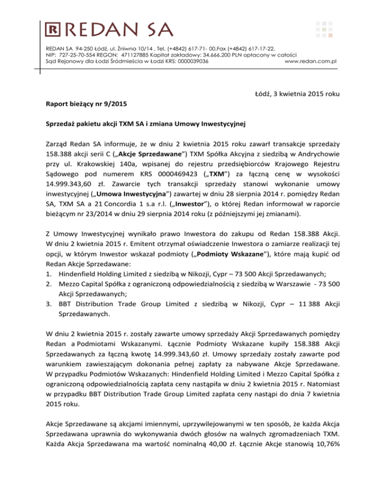 REDAN SA 94-250 Łódź, ul. Żniwna 10/14 , Tel. (+4842) 617-71- 00,Fax (+4842) 617-17-22, NIP: 727-25-70-554 REGON: 471127885 Kapitał zakładowy: 34.666.200 PLN opłacony w całości Sąd Rejonowy dla Łodzi Śródmieścia w Łodzi KRS: 0000039036 www.redan.com.pl Łódź, 3 kwietnia 2015 roku Raport bieżący nr 9/2015 Sprzedaż pakietu akcji TXM SA i zmiana Umowy Inwestycyjnej Zarząd Redan SA informuje, że w dniu 2 kwietnia 2015 roku zawarł transakcje sprzedaży 158.388 akcji serii C („Akcje Sprzedawane”) TXM Spółka Akcyjna z siedzibą w Andrychowie przy ul. Krakowskiej 140a, wpisanej do rejestru przedsiębiorców Krajowego Rejestru Sądowego pod numerem KRS 0000469423 („TXM”) za łączną cenę w wysokości 14.999.343,60 zł. Zawarcie tych transakcji sprzedaży stanowi wykonanie umowy inwestycyjnej („Umowa Inwestycyjna”) zawartej w dniu 28 sierpnia 2014 r. pomiędzy Redan SA, TXM SA a 21 Concordia 1 s.a r.l. („Inwestor”), o której Redan informował w raporcie bieżącym nr 23/2014 w dniu 29 sierpnia 2014 roku (z późniejszymi jej zmianami). Z Umowy Inwestycyjnej wynikało prawo Inwestora do zakupu od Redan 158.388 Akcji. W dniu 2 kwietnia 2015 r. Emitent otrzymał oświadczenie Inwestora o zamiarze realizacji tej opcji, w którym Inwestor wskazał podmioty („Podmioty Wskazane”), które mają kupić od Redan Akcje Sprzedawane: 1. Hindenfield Holding Limited z siedzibą w Nikozji, Cypr – 73 500 Akcji Sprzedawanych; 2. Mezzo Capital Spółka z ograniczoną odpowiedzialnością z siedzibą w Warszawie - 73 500 Akcji Sprzedawanych; 3. BBT Distribution Trade Group Limited z siedzibą w Nikozji, Cypr – 11 388 Akcji Sprzedawanych. W dniu 2 kwietnia 2015 r. zostały zawarte umowy sprzedaży Akcji Sprzedawanych pomiędzy Redan a Podmiotami Wskazanymi. Łącznie Podmioty Wskazane kupiły 158.388 Akcji Sprzedawanych za łączną kwotę 14.999.343,60 zł. Umowy sprzedaży zostały zawarte pod warunkiem zawieszającym dokonania pełnej zapłaty za nabywane Akcje Sprzedawane. W przypadku Podmiotów Wskazanych: Hindenfield Holding Limited i Mezzo Capital Spółka z ograniczoną odpowiedzialnością zapłata ceny nastąpiła w dniu 2 kwietnia 2015 r. Natomiast w przypadku BBT Distribution Trade Group Limited zapłata ceny nastąpi do dnia 7 kwietnia 2015 roku. Akcje Sprzedawane są akcjami imiennymi, uprzywilejowanymi w ten sposób, że każda Akcja Sprzedawana uprawnia do wykonywania dwóch głosów na walnych zgromadzeniach TXM. Każda Akcja Sprzedawana ma wartość nominalną 40,00 zł. Łącznie Akcje stanowią 10,76% REDAN SA 94-250 Łódź, ul. Żniwna 10/14 , Tel. (+4842) 617-71- 00,Fax (+4842) 617-17-22, NIP: 727-25-70-554 REGON: 471127885 Kapitał zakładowy: 34.666.200 PLN opłacony w całości Sąd Rejonowy dla Łodzi Śródmieścia w Łodzi KRS: 0000039036 www.redan.com.pl kapitału zakładowego TXM i uprawniają do wykonywania 10,76% głosów na walnych zgromadzeniach TXM. Łączna wartość Akcji Sprzedawanych w Redan SA wynosiła 16.472.353 zł. Wynikała ona jednak z transakcji nabycia Akcji Sprzedawanych od spółki zależnej (o czym Emitent informował w raport cie bieżącym nr 51/2014 z dnia 19 grudnia 2014 r.), która objęła Akcje Sprzedawane po wartości nominalnej wynoszącej łącznie 6 335 520 zł. Zgodnie z MSSF 10 w skonsolidowanym rachunku zysków i strat Grupy Redan powyższe transakcje nie będą wykazane, gdyż jako sprzedaż udziałów niekontrolujących wpłyną bezpośrednio na zmianę kapitałów własnych Grupy Redan. Pomiędzy Redan a Podmiotami Wskazanymi nie istnieją inne powiązania niż wynikające z Umowy Inwestycyjnej (lub umów zawartych w wykonaniu Umowy Inwestycyjnej). Pomiędzy osobami zarządzającymi lub nadzorującymi Redan a Inwestorem, Podmiotami Wskazanymi lub osobami zarządzającymi lub nadzorującymi Inwestora lub Podmiotów Wskazanych nie występują żadne powiązania. Po zawarciu powyższych transakcji sprzedaży (przy założeniu spełnieniu się warunku zawieszającego w umowie z BBT Distribution Trade Group Limited ) Redan posiada 943 824 akcji TXM, stanowiących 64,12 % kapitału zakładowego TXM i uprawniających do wykonywania 64,12 % głosów na walnych zgromadzeniach TXM. Intencją Redan SA nie jest sprzedawanie kolejnych akcji TXM i zachowanie kontroli nad tą spółką. Jednocześnie w dniu 2 kwietnia 2015 r. zawarty został Aneks nr 5 do Umowy Inwestycyjnej na mocy którego Podmioty Wskazane przystąpiły do Umowy Inwestycyjnej jako jej strony. Sprzedaż Akcji Sprzedawanych została uznana za sprzedaż aktywów o znaczącej wartości z uwagi na fakt, że łączna cena sprzedaży w wysokości 14.999.343,60 zł przekracza wartość 10% kapitałów własnych Redan. Podstawa Prawna: Art. 56 ust. 1 pkt 2 ustawy o ofercie oraz § 5 ust. 1 pkt 1) Rozporządzenia w sprawie informacji bieżących i okresowych Bogusz Kruszyński Wiceprezes Zarządu Redan SA
