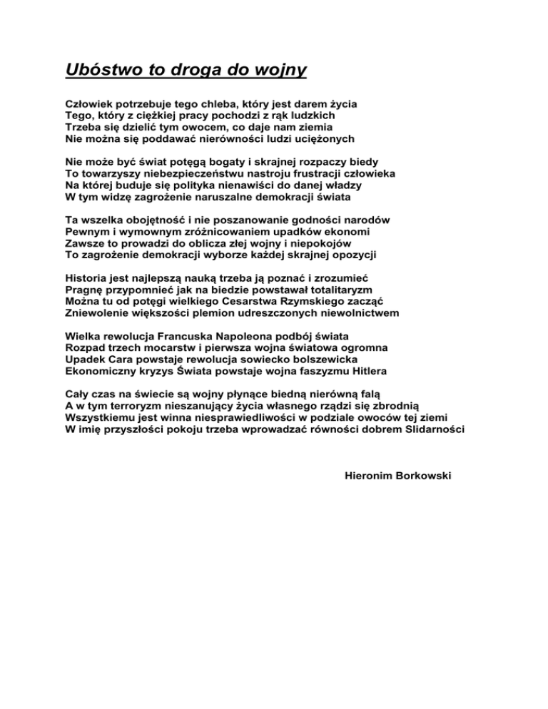 Ubóstwo to droga do wojny Człowiek potrzebuje tego chleba, który jest darem życia Tego, który z ciężkiej pracy pochodzi z rąk ludzkich Trzeba się dzielić tym owocem, co daje nam ziemia Nie można się poddawać nierówności ludzi uciężonych Nie może być świat potęgą bogaty i skrajnej rozpaczy biedy To towarzyszy niebezpieczeństwu nastroju frustracji człowieka Na której buduje się polityka nienawiści do danej władzy W tym widzę zagrożenie naruszalne demokracji świata Ta wszelka obojętność i nie poszanowanie godności narodów Pewnym i wymownym zróżnicowaniem upadków ekonomi Zawsze to prowadzi do oblicza złej wojny i niepokojów To zagrożenie demokracji wyborze każdej skrajnej opozycji Historia jest najlepszą nauką trzeba ją poznać i zrozumieć Pragnę przypomnieć jak na biedzie powstawał totalitaryzm Można tu od potęgi wielkiego Cesarstwa Rzymskiego zacząć Zniewolenie większości plemion udreszczonych niewolnictwem Wielka rewolucja Francuska Napoleona podbój świata Rozpad trzech mocarstw i pierwsza wojna światowa ogromna Upadek Cara powstaje rewolucja sowiecko bolszewicka Ekonomiczny kryzys Świata powstaje wojna faszyzmu Hitlera Cały czas na świecie są wojny płynące biedną nierówną falą A w tym terroryzm nieszanujący życia własnego rządzi się zbrodnią Wszystkiemu jest winna niesprawiedliwości w podziale owoców tej ziemi W imię przyszłości pokoju trzeba wprowadzać równości dobrem Slidarności Hieronim Borkowski