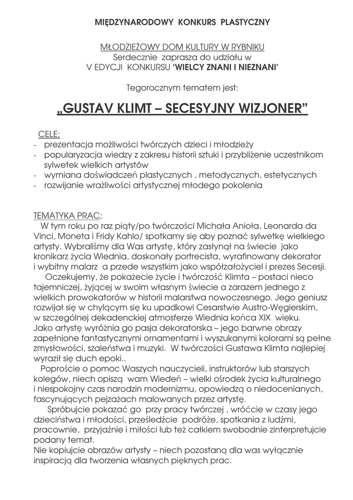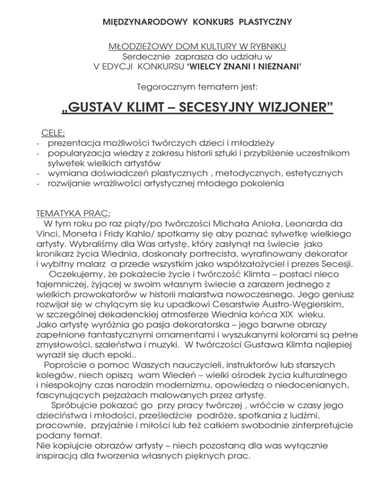 MI DZYNARODOWY KONKURS PLASTYCZNY MŁODZIE OWY DOM KULTURY W RYBNIKU Serdecznie zaprasza do udziału w V EDYCJI KONKURSU ‘WIELCY ZNANI I NIEZNANI’ Tegorocznym tematem jest: „GUSTAV KLIMT – SECESYJNY WIZJONER” CELE; - prezentacja mo liwo ci twórczych dzieci i młodzie y - popularyzacja wiedzy z zakresu historii sztuki i przybli enie uczestnikom sylwetek wielkich artystów - wymiana do wiadcze plastycznych , metodycznych, estetycznych - rozwijanie wra liwo ci artystycznej młodego pokolenia TEMATYKA PRAC; W tym roku po raz pi ty/po twórczo ci Michała Anioła, Leonarda da Vinci, Moneta i Fridy Kahlo/ spotkamy si aby pozna sylwetk wielkiego artysty. Wybrali my dla Was artyst , który zasłyn ł na wiecie jako kronikarz ycia Wiednia, doskonały portrecista, wyrafinowany dekorator i wybitny malarz a przede wszystkim jako współzało yciel i prezes Secesji. Oczekujemy, e poka ecie ycie i twórczo Klimta – postaci nieco tajemniczej, yj cej w swoim własnym wiecie a zarazem jednego z wielkich prowokatorów w historii malarstwa nowoczesnego. Jego geniusz rozwijał si w chyl cym si ku upadkowi Cesarstwie Austro-W gierskim, w szczególnej dekadenckiej atmosferze Wiednia ko ca XIX wieku. Jako artyst wyró nia go pasja dekoratorska – jego barwne obrazy zapełnione fantastycznymi ornamentami i wyszukanymi kolorami s pełne zmysłowo ci, szale stwa i muzyki. W twórczo ci Gustawa Klimta najlepiej wyraził si duch epoki.. Popro cie o pomoc Waszych nauczycieli, instruktorów lub starszych kolegów, niech opisz wam Wiede – wielki o rodek ycia kulturalnego i niespokojny czas narodzin modernizmu, opowiedz o niedocenianych, fascynuj cych pejza ach malowanych przez artyst . Spróbujcie pokaza go przy pracy twórczej , wró cie w czasy jego dzieci stwa i młodo ci, prze led cie podró e, spotkania z lud mi, pracownie, przyja nie i miło ci lub te całkiem swobodnie zinterpretujcie podany temat. Nie kopiujcie obrazów artysty – niech pozostan dla was wył cznie inspiracj dla tworzenia własnych pi knych prac. WIEK UCZESTNIKÓW; 5 – 20 LAT Grupy wiekowe: (DO 7 lat), (8-11 lat) , (12-15 lat), (16-20 lat) FORMAT PRAC; min. 30x42 cm TECHNIKA: malarstwo, - max 70x100 cm rysunek, grafika, techniki mieszane TERMIN SKŁADANIA PRAC; 15 kwietnia 2005 Prace powinny by czytelnie opisane na odwrocie i zawiera nast puj ce dane: - imi i nazwisko autora, wiek autora, - adres i telefon placówki, - imi i nazwisko instruktora lub nauczyciela, - tytuł pracy UROCZYSTE PODSUMOWANIE KONKURSU , ROZDANIE NAGRÓD WYRÓZNIEN I DYPLOMÓW ORAZ OTWARCIE WYSTAWY POKONKURSOWEJ ODB DZIE SI W CZERWCU 2005 WSZYSCY LAUREACI ZOSTAN POWIADOMIENI PRZEZ ORGANIZATORA LISTOWNIE LUB TELEFONICZNIE. Adres: MŁODZIE OWY DOM KULTURY UL. BRONIEWSKIEGO 23, 44-217 RYBNIK, Polska tel. 0-32 4215155, fax: 0-32 4224088, e-mail: [email protected], www.mdk.hg.pl Współorganizatorem Konkursu jest: URZ D MIASTA RYBNIKA Prace nadesłane na konkurs b d mogły by odebrane na wyra ne yczenie i koszt placówki wysyłaj cej prace w przeci gu 10 miesi cy od zako czenia wystawy. Po tym czasie wszystkie prace przechodz na własno organizatora. INFORMACJE NA TEMAT TWÓRCZO CI ARTYSTY: 1. Gilles Neret “Gustaw Klimt“, wyd.Taschen 2. Nathaniel Harris „Klimt“ , wyd. Muza SA 3. Susanna Partsch „Klimt – ycie i twórczo wyd. Arkady “ 4. Wielcy Malarze, nr 29 „Gustaw Klimt” 5. Wieland Schmied „Modernizm na złotym tle” free.ngo.pl/ksk/pob9/ws1.html 6. http://en.wikipedia.org/wiki/Gustav_Klimt 7. http://www.expo-klimt.com/ 8. http://www.gustavklimtcollection.com/cgi-bin/index.cgi 9. http://www.ibiblio.org/wm/paint/auth/klimt/ 10. http://www.laks.com/deutsch/klimtmuseum_main.html