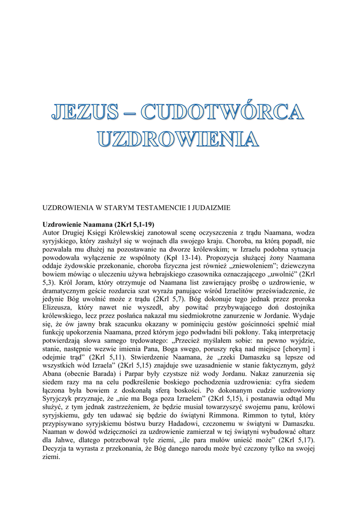UZDROWIENIA W STARYM TESTAMENCIE I JUDAIZMIE Uzdrowienie Naamana (2Krl 5,1-19) Autor Drugiej Księgi Królewskiej zanotował scenę oczyszczenia z trądu Naamana, wodza syryjskiego, który zasłużył się w wojnach dla swojego kraju. Choroba, na którą popadł, nie pozwalała mu dłużej na pozostawanie na dworze królewskim; w Izraelu podobna sytuacja powodowała wyłączenie ze wspólnoty (Kpł 13-14). Propozycja służącej żony Naamana oddaje żydowskie przekonanie, choroba fizyczna jest również „zniewoleniem”; dziewczyna bowiem mówiąc o uleczeniu używa hebrajskiego czasownika oznaczającego „uwolnić” (2Krl 5,3). Król Joram, który otrzymuje od Naamana list zawierający prośbę o uzdrowienie, w dramatycznym geście rozdarcia szat wyraża panujące wśród Izraelitów przeświadczenie, że jedynie Bóg uwolnić może z trądu (2Krl 5,7). Bóg dokonuje tego jednak przez proroka Elizeusza, który nawet nie wyszedł, aby powitać przybywającego doń dostojnika królewskiego, lecz przez posłańca nakazał mu siedmiokrotne zanurzenie w Jordanie. Wydaje się, że ów jawny brak szacunku okazany w pominięciu gestów gościnności spełnić miał funkcję upokorzenia Naamana, przed którym jego podwładni bili pokłony. Taką interpretację potwierdzają słowa samego trędowatego: „Przecież myślałem sobie: na pewno wyjdzie, stanie, następnie wezwie imienia Pana, Boga swego, poruszy ręką nad miejsce [chorym] i odejmie trąd” (2Krl 5,11). Stwierdzenie Naamana, że „rzeki Damaszku są lepsze od wszystkich wód Izraela” (2Krl 5,15) znajduje swe uzasadnienie w stanie faktycznym, gdyż Abana (obecnie Barada) i Parpar były czystsze niż wody Jordanu. Nakaz zanurzenia się siedem razy ma na celu podkreślenie boskiego pochodzenia uzdrowienia: cyfra siedem łączona była bowiem z doskonałą sferą boskości. Po dokonanym cudzie uzdrowiony Syryjczyk przyznaje, że „nie ma Boga poza Izraelem” (2Krl 5,15), i postanawia odtąd Mu służyć, z tym jednak zastrzeżeniem, że będzie musiał towarzyszyć swojemu panu, królowi syryjskiemu, gdy ten udawać się będzie do świątyni Rimmona. Rimmon to tytuł, który przypisywano syryjskiemu bóstwu burzy Hadadowi, czczonemu w świątyni w Damaszku. Naaman w dowód wdzięczności za uzdrowienie zamierzał w tej świątyni wybudować ołtarz dla Jahwe, dlatego potrzebował tyle ziemi, „ile para mułów unieść może” (2Krl 5,17). Decyzja ta wyrasta z przekonania, że Bóg danego narodu może być czczony tylko na swojej ziemi. Uzdrowienie Ezechiasza (2Krl 20,1-7) Tradycja Drugiej Księgi Królewskiej zanotowała jeszcze jedno opowiadanie o uzdrowieniu: dotyczy ono Jedno z hebrajskich imion Boga króla Ezechiasza (2Krl 20,1-7). Uzdrowienie dokonuje zapisanych w Starym Testamencie Rafa, „Ten, który się, zgodnie z przekonaniem Izraelitów, dzięki brzmi: uzdrawia”. modlitwie. Modlitwa zaś zawiera w sobie silne przeświadczenie, że każdy, kto chodzi drogami Przekonanie Izraelitów, że to sam Bożymi, cieszyć się może Jego błogosławieństwem i Bóg Jahwe leczy choroby ludzkie swój wyraz w nie mogą go dotknąć choroby widziane jako znak znalazło przekleństwa z powodu przekroczenia Prawa (Pwt przestrodze zapisanej na kartach 30,15-20). Właśnie powołanie się na życie zgodne ze Księgi Wyjścia: „Jeśli wiernie wskazaniami Prawa staje się dla Ezechiasza motywem będziesz słuchał głosu Boga, jego prośby skierowanej do Boga: „Ach, Panie, Jahwe... nie ukarzę cię żadną z wspomnij na to, proszę, że postępowałem wobec Ciebie plag, jakie zesłałem na Egipt, bo wiernie i z doskonałym sercem, że czyniłem, co jest Ja, Pan, chcę być twoim dobre w Twoich oczach” (2Krl 20,3). Modlitwa ta lekarzem” (Wj 15,26). Zawarto tu doczekuje się natychmiastowej odpowiedzi Jahwe, silne przeświadczenie Izraelitów, który objawia swą wolę uzdrowienia króla prorokowi że uzdrowienie dokonuje się Izajaszowi. Zapewnienie o kolejnych piętnastu latach dzięki modlitwie, a jego autorem panowania zapisane zostało zapewne z perspektywy ex jest zawsze sam Jahwe. eventu (2Krl 20,6). „Placek figowy” (2Krl 20,7) użyty jako środek leczniczy znany jest ze starożytnych tekstów znalezionych w Ugarit. Dziękczynny hymn króla po dokonanym uzdrowieniu, zanotowany w Iz 38,9-20, rozpoczyna się wyrażeniem wiary w to, że Bóg każdemu wyznacza liczbę lat życia: „Mówiłem: w połowie dni moich odejść muszę, w bramach Szeolu odczuję brak reszty lat moich” (Iz 38,10). Liczbę tę dokładniej określa psalmista: „Miarą naszych lat jest siedemdziesiąt, lub osiemdziesiąt, gdy jesteśmy mocni” (Ps 90,10a). Doznane uzdrowienie jest dla Ezechiasza równoznaczne z odpuszczeniem grzechów: „Oto na zdrowie zamienił mi gorycz. Ty zachowałeś mą duszę od dołu unicestwienia, gdyż poza siebie rzuciłeś wszystkie moje grzechy” (Iz 38,17). Obydwie zaprezentowane narracje o uzdrowieniu wyrastają ze sposobu widzenia choroby jako znaku kary Bożej, a uzdrowienia jako znaku Jego łaskawości. Działalność Chaniny ben Dosa Również pozabiblijne teksty hebrajskie wspominają o uzdrowieniach dokonywanych przez Boga za pośrednictwem człowieka. Rabbi Chanina ben Dosa zasłynął jako cudotwórca po zburzeniu przez Rzymian świątyni jerozolimskiej, a więc po roku 70. Uzdrowień dokonywał dzięki modlitwie, o której mówił: „Jeżeli modlitwa płynie swobodnie w moich ustach, wiem, że została przyjęta, a jeżeli nie, to wiem, że została odrzucona”. Prosząc Boga o uzdrowienie, na wzór Eliasza skłaniał głowę między kolana (1Krl 18,42). Uzdrowień mógł dokonywać na odległość. Istnieje duże podobieństwo pomiędzy ewangelicznym zapisem o uzdrowieniu sługi setnika z Kafarnaum (Mt 8,5-13; Łk 7,1-10) a relacją zanotowaną w Talmudzie, z której pochodzi cytowana powyżej wypowiedź o modlitwie:„Stało się, że zachorzał syn rabbana Gamaliela. Wtedy posłał on dwóch 
