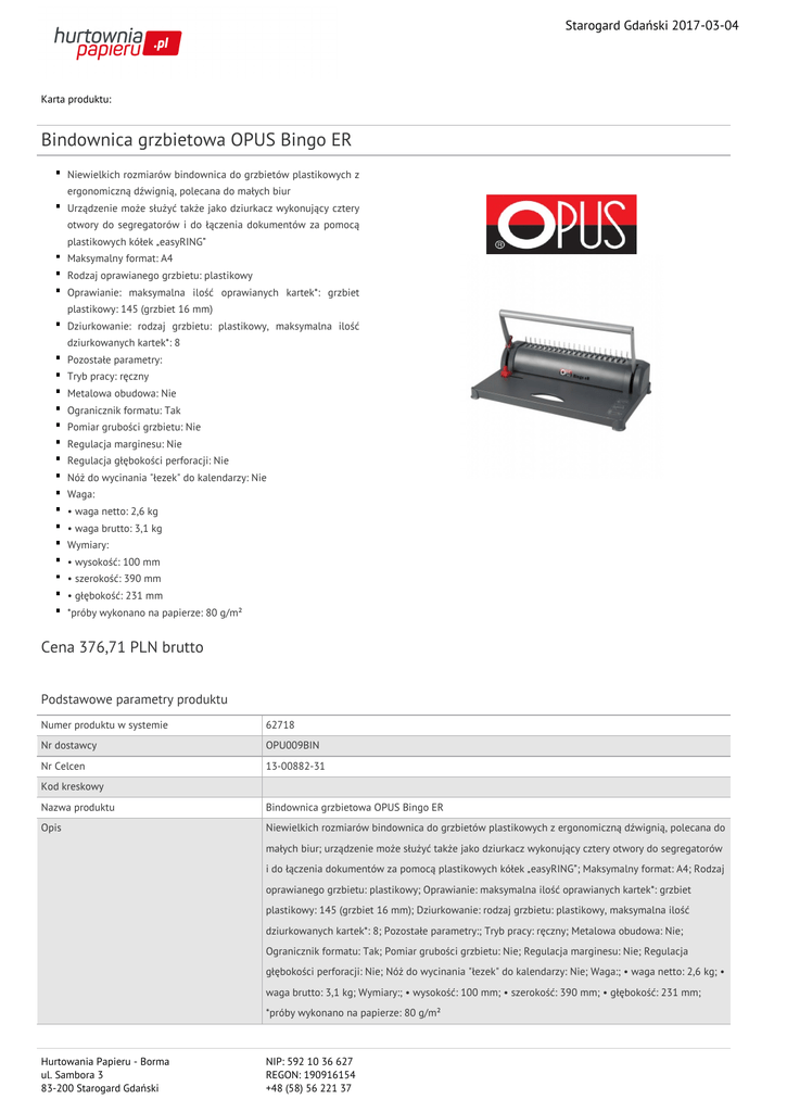Starogard Gdański 2017-03-04 Karta produktu: Bindownica grzbietowa OPUS Bingo ER Niewielkich rozmiarów bindownica do grzbietów plastikowych z ergonomiczną dźwignią, polecana do małych biur Urządzenie może służyć także jako dziurkacz wykonujący cztery otwory do segregatorów i do łączenia dokumentów za pomocą plastikowych kółek „easyRING” Maksymalny format: A4 Rodzaj oprawianego grzbietu: plastikowy Oprawianie: maksymalna ilość oprawianych kartek*: grzbiet plastikowy: 145 (grzbiet 16 mm) Dziurkowanie: rodzaj grzbietu: plastikowy, maksymalna ilość dziurkowanych kartek*: 8 Pozostałe parametry: Tryb pracy: ręczny Metalowa obudowa: Nie Ogranicznik formatu: Tak Pomiar grubości grzbietu: Nie Regulacja marginesu: Nie Regulacja głębokości perforacji: Nie Nóż do wycinania "łezek" do kalendarzy: Nie Waga: • waga netto: 2,6 kg • waga brutto: 3,1 kg Wymiary: • wysokość: 100 mm • szerokość: 390 mm • głębokość: 231 mm *próby wykonano na papierze: 80 g/m² Cena 376,71 PLN brutto Podstawowe parametry produktu Numer produktu w systemie 62718 Nr dostawcy OPU009BIN Nr Celcen 13-00882-31 Kod kreskowy Nazwa produktu Bindownica grzbietowa OPUS Bingo ER Opis Niewielkich rozmiarów bindownica do grzbietów plastikowych z ergonomiczną dźwignią, polecana do małych biur; urządzenie może służyć także jako dziurkacz wykonujący cztery otwory do segregatorów i do łączenia dokumentów za pomocą plastikowych kółek „easyRING”; Maksymalny format: A4; Rodzaj oprawianego grzbietu: plastikowy; Oprawianie: maksymalna ilość oprawianych kartek*: grzbiet plastikowy: 145 (grzbiet 16 mm); Dziurkowanie: rodzaj grzbietu: plastikowy, maksymalna ilość dziurkowanych kartek*: 8; Pozostałe parametry:; Tryb pracy: ręczny; Metalowa obudowa: Nie; Ogranicznik formatu: Tak; Pomiar grubości grzbietu: Nie; Regulacja marginesu: Nie; Regulacja głębokości perforacji: Nie; Nóż do wycinania "łezek" do kalendarzy: Nie; Waga:; • waga netto: 2,6 kg; • waga brutto: 3,1 kg; Wymiary:; • wysokość: 100 mm; • szerokość: 390 mm; • głębokość: 231 mm; *próby wykonano na papierze: 80 g/m² Hurtowania Papieru - Borma ul. Sambora 3 83-200 Starogard Gdański NIP: 592 10 36 627 REGON: 190916154 +48 (58) 56 221 37 Starogard Gdański 2017-03-04 Karta katalogowa produktu cd. Bindownica grzbietowa OPUS Bingo ER Kategoria Laminacja i bindowanie Marka OPUS Cecha Waga (g) 3100 Ilość kartek Max oprawionych kartek: 145 Rodzaj Rodzaj grzbietu: plastikowy Typ Grzbietowa Produkt Bindownica Materiał Metal/plastik Zastosowanie Zastosowanie Do oprawy dokumentów Wymiary Format A4 Certyfikaty Nowy produkt w ofercie Standard Hit Standard Kolor Kolor Szary Serdecznie zapraszamy do współpracy Hurtowania Papieru - Borma zespół. Hurtowania Papieru - Borma ul. Sambora 3 83-200 Starogard Gdański NIP: 592 10 36 627 REGON: 190916154 +48 (58) 56 221 37