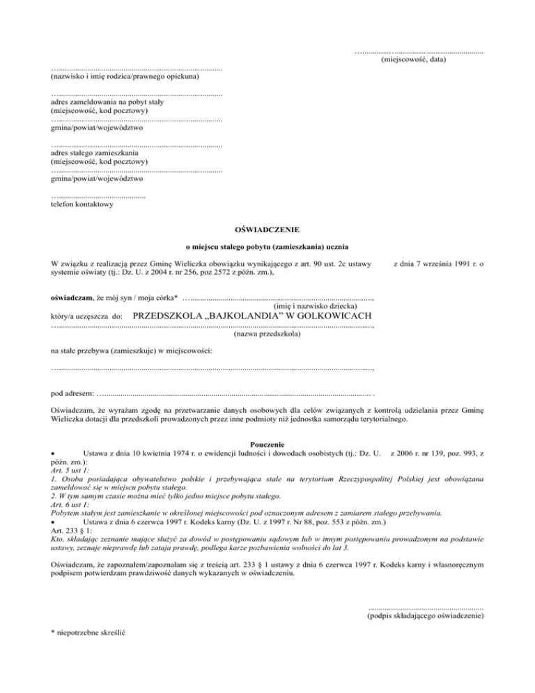 ….............…........................................... (miejscowość, data) …................................................................................. (nazwisko i imię rodzica/prawnego opiekuna) …................................................................................. adres zameldowania na pobyt stały (miejscowość, kod pocztowy) …................................................................................. gmina/powiat/województwo …................................................................................. adres stałego zamieszkania (miejscowość, kod pocztowy) …................................................................................. gmina/powiat/województwo …........................................... telefon kontaktowy OŚWIADCZENIE o miejscu stałego pobytu (zamieszkania) ucznia W związku z realizacją przez Gminę Wieliczka obowiązku wynikającego z art. 90 ust. 2c ustawy systemie oświaty (tj.: Dz. U. z 2004 r. nr 256, poz 2572 z późn. zm.), z dnia 7 września 1991 r. o oświadczam, że mój syn / moja córka* ….........................................................................................., (imię i nazwisko dziecka) który/a uczęszcza do: PRZEDSZKOLA „BAJKOLANDIA” W GOLKOWICACH …..........................................................................................................................................................., (nazwa przedszkola) na stałe przebywa (zamieszkuje) w miejscowości: …..........................................................................................................................................................., pod adresem: ….................................................................................................................................... . Oświadczam, że wyrażam zgodę na przetwarzanie danych osobowych dla celów związanych z kontrolą udzielania przez Gminę Wieliczka dotacji dla przedszkoli prowadzonych przez inne podmioty niż jednostka samorządu terytorialnego. Pouczenie Ustawa z dnia 10 kwietnia 1974 r. o ewidencji ludności i dowodach osobistych (tj.: Dz. U. z 2006 r. nr 139, poz. 993, z późn. zm.): Art. 5 ust 1: 1. Osoba posiadająca obywatelstwo polskie i przebywająca stale na terytorium Rzeczypospolitej Polskiej jest obowiązana zameldować się w miejscu pobytu stałego. 2. W tym samym czasie można mieć tylko jedno miejsce pobytu stałego. Art. 6 ust 1: Pobytem stałym jest zamieszkanie w określonej miejscowości pod oznaczonym adresem z zamiarem stałego przebywania. Ustawa z dnia 6 czerwca 1997 r. Kodeks karny (Dz. U. z 1997 r. Nr 88, poz. 553 z późn. zm.) Art. 233 § 1: Kto, składając zeznanie mające służyć za dowód w postępowaniu sądowym lub w innym postępowaniu prowadzonym na podstawie ustawy, zeznaje nieprawdę lub zataja prawdę, podlega karze pozbawienia wolności do lat 3. Oświadczam, że zapoznałem/zapoznałam się z treścią art. 233 § 1 ustawy z dnia 6 czerwca 1997 r. Kodeks karny i własnoręcznym podpisem potwierdzam prawdziwość danych wykazanych w oświadczeniu. ......................................................... (podpis składającego oświadczenie) * niepotrzebne skreślić