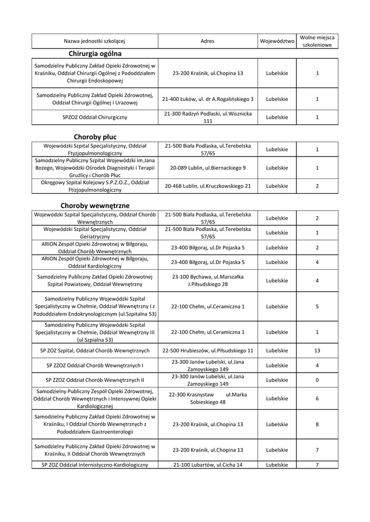 Adres Województwo Wolne miejsca szkoleniowe Samodzielny Publiczny Zakład Opieki Zdrowotnej w Kraśniku, Oddział Chirurgii Ogólnej z Pododdziałem Chirurgii Endoskopowej 23-200 Kraśnik, ul.Chopina 13 Lubelskie 1 Samodzielny Publiczny Zakład Opieki Zdrowotnej, Oddział Chirurgii Ogólnej i Urazowej 21-400 Łuków, ul. dr A.Rogalińskiego 3 Lubelskie 1 SPZOZ Oddział Chirurgiczny 21-300 Radzyń Podlaski, ul.Wisznicka 111 Lubelskie 1 21-500 Biała Podlaska, ul.Terebelska 57/65 Lubelskie 1 20-089 Lublin, ul.Biernackiego 9 Lubelskie 1 20-468 Lublin, ul.Kruczkowskiego 21 Lubelskie 2 Lubelskie 2 Lubelskie 1 23-400 Biłgoraj, ul.Dr Pojaska 5 Lubelskie 2 Nazwa jednostki szkolącej Chirurgia ogólna Choroby płuc Wojewódzki Szpital Specjalistyczny, Oddział Ftyzjopulmonologiczny Samodzielny Publiczny Szpital Wojewódzki im.Jana Bożego, Wojewódzki Ośrodek Diagnostyki i Terapii Gruźlicy i Chorób Płuc Okręgowy Szpital Kolejowy S.P.Z.O.Z., Oddział Ftizjopulmonologiczny Choroby wewnętrzne Wojewódzki Szpital Specjalistyczny, Oddział Chorób Wewnętrznych Wojewódzki Szpital Specjalistyczny, Oddział Geriatryczny ARION Zespół Opieki Zdrowotnej w Biłgoraju, Oddział Chorób Wewnętrznych ARION Zespół Opieki Zdrowotnej w Biłgoraju, Oddział Kardiologiczny 21-500 Biała Podlaska, ul.Terebelska 57/65 21-500 Biała Podlaska, ul.Terebelska 57/65 23-400 Biłgoraj, ul.Dr Pojaska 5 Lubelskie 4 Samodzielny Publiczny Zakład Opieki Zdrowotnej Szpital Powiatowy, Oddział Wewnętrzny 23-100 Bychawa, ul.Marszałka J.Piłsudskiego 28 Lubelskie 4 Samodzielny Publiczny Wojewódzki Szpital Specjalistyczny w Chełmie, Oddział Wewnętrzny I z Pododdziałem Endokrynologicznym (ul.Szpitalna 53) 22-100 Chełm, ul.Ceramiczna 1 Lubelskie 5 Samodzielny Publiczny Wojewódzki Szpital Specjalistyczny w Chełmie, Oddział Wewnętrzny III (ul.Szpialna 53) 22-100 Chełm, ul.Ceramiczna 1 Lubelskie 1 SP ZOZ Szpital, Oddział Chorób Wewnętrznych 22-500 Hrubieszów, ul.Piłsudskiego 11 Lubelskie 13 Lubelskie 4 Lubelskie 0 SP ZZOZ Oddział Chorób Wewnętrznych I SP ZZOZ Oddział Chorób Wewnętrznych II 23-300 Janów Lubelski, ul.Jana Zamoyskiego 149 23-300 Janów Lubelski, ul.Jana Zamoyskiego 149 Samodzielny Publiczny Zespół Opieki Zdrowotnej, Oddział Chorób Wewnętrznych i Intensywnej Opieki Kardiologicznej 22-300 Krasnystaw ul.Marka Sobieskiego 48 Lubelskie 6 Samodzielny Publiczny Zakład Opieki Zdrowotnej w Kraśniku, I Oddział Chorób Wewnętrznych z Pododdziałem Gastroenterologii 23-200 Kraśnik, ul.Chopina 13 Lubelskie 8 Samodzielny Publiczny Zakład Opieki Zdrowotnej w Kraśniku, II Oddział Chorób Wewnętrznych 23-200 Kraśnik, ul.Chopina 13 Lubelskie 7 SP ZOZ Oddział Internistyczno-Kardiologiczny 21-100 Lubartów, ul.Cicha 14 Lubelskie 7 Szpital Neuropsychiatryczny im. Prof. M.Kaczyńskiego SPZOZ, Oddział Chorób Wewnętrznych z Pododdziałem Intensywnej Terapii 20-442 Lublin, ul.Abramowicka 2 Lubelskie 3 Wojewódzki Szpital Specjalistyczny im.Stefana Kardynała Wyszyńskiego SPZOZ, Oddział Kardiologii z Pododdziałem Kardiologii Inwazyjnej 20-718 Lublin, Al.Kraśnicka 100 Lubelskie 1 Wojewódzki Szpital Specjalistyczny im. Stefana Kardynała Wyszyńskiego, Oddział Gastroenterologii 20-718 Lublin, Al.Kraśnicka 100 Lubelskie 4 20-718 Lublin, Al.Kraśnicka 100 Lubelskie 1 20-718 Lublin, Al.Kraśnicka 100 Lubelskie 0 20-089 Lublin, ul.Biernackiego 9 Lubelskie 4 20-950 Lublin, ul.Jaczewskiego 2 Lubelskie 7 20-954 Lublin, ul.Jaczewskiego 8 Lubelskie 0 20-954 Lublin, ul.Jaczewskiego 8 Lubelskie 5 20-954 Lublin, ul.Jaczewskiego 8 Lubelskie 3 20-954 Lublin, ul.Jaczewskiego 8 Lubelskie 7 20-954 Lublin, ul.Jaczewskiego 8 Lubelskie 5 20-468 Lublin, ul.Kruczkowskiego 21 Lubelskie 2 20-081 Lublin, ul.Staszica 11 Lubelskie 9 SP ZOZ, Oddział Wewnętrzno-Kardiologiczny 21-400 Łuków, ul. dr A.Rogalińskiego 3 Lubelskie 7 SPZOZ Szpital Powiatowy, Oddział Chorób Wewnętrznych SP ZOZ Szpital Powiatowy, Oddział Chorób Wewnętrznych w Poniatowej 21-560 Międzyrzec Podlaski, ul.Warszawska 2-4 24-300 Opole Lubelskie, ul.Przemysłowa 4a Lubelskie 0 Lubelskie 6 Samodzielny Publiczny Zakład Opieki Zdrowotnej w Parczewie, Oddział Internistyczno-Kardiologiczny 21-200 Parczew, ul.Kościelna 124 Lubelskie 8 SP ZOZ Szpital Specjalistyczny, Oddział Wewnętrzny 24-100 Puławy, ul.Bema 1 Lubelskie 4 SP ZOZ Szpital Specjalistyczny, Oddział Kardiologii 24-100 Puławy, ul.Bema 1 Lubelskie 1 SPZOZ Szpital Rejonowy im. Prof. F.Skubiszewskiego, Oddział Chorób Wewnętrznych i Kardiologii 21-300 Radzyń Podlaski, ul.Wisznicka 111 Lubelskie 5 Lubelskie 1 21-040 Świdnik, ul.B.Leśmiana 4 Lubelskie 3 21-040 Świdnik, ul.B.Leśmiana 4 Lubelskie 6 Wojewódzki Szpital Specjalistyczny im.Stefana Kardynała Wyszyńskiego SPZOZ, Oddział Nefrologii i Nadciśnienia Tętniczego Wojewódzki Szpital Specjalistyczny im. Stefana Kardynała Wyszyńskiego SPZOZ, Oddział Toksykologiczno-Kardiologiczny Samodzielny Publiczny Szpital Wojewódzki im. Jana Bożego, Oddział Internistyczny Instytut Medycyny Wsi, Klinika Chorób Wewnętrznych, Zawodowych i Toksykologii Samodzielny Publiczny Szpital Kliniczny nr 4, Katedra i Klinika Endokrynologii SP Szpital Kliniczny nr 4 AM , Katedra i Klinika Nefrologii, Oddział Kliniczny Samodzielny Publiczny Szpital Kliniczny nr 4 AM, Katedra i Klinika Reumatologii Samodzielny Publiczny Szpital Kliniczny nr 4 AM, I Katedra i Klinika Kardiologii Samodzielny Publiczny Szpital Kliniczny nr 4, Klinika Pneumonologii, Onkologii i Alergologii Okręgowy Szpital Kolejowy SPZOZ, Oddział Internistyczno-Kardiologiczny z Intensywną Opieką Kardiologiczną SP Szpital Kliniczny nr 1 AM, Katedra i Klinika Hematoonkologii i Transplantacji Szpiku Samodzielny Publiczny Zespół Opieki Zdrowotnej, Oddział Wewnętrzny Samodzielny Publiczny Zakład Opieki Zdrowotnej w Świdniku, I Oddział Chorób Wewnetrznych (Al. Lotników Polskich 18) Samodzielny Publiczny Zakład Opieki Zdrowotnej w Świdniku, II Oddział Chorób Wewnęt
