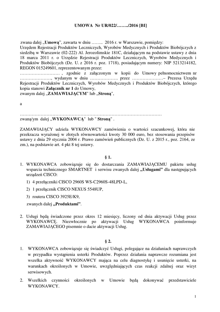 UMOWA Nr UR/022/……../2016 [BI] zwana dalej „Umową”, zawarta w dniu …….. 2016 r. w Warszawie, pomiędzy: Urzędem Rejestracji Produktów Leczniczych, Wyrobów Medycznych i Produktów Biobójczych z siedzibą w Warszawie (02-222) Al. Jerozolimskie 181C, działającym na podstawie ustawy z dnia 18 marca 2011 r. o Urzędzie Rejestracji Produktów Leczniczych, Wyrobów Medycznych i Produktów Biobójczych (Dz. U. z 2016 r. poz. 1718), posiadającym numery: NIP 5213214182, REGON 015249601, reprezentowanym przez: ……………………… , zgodnie z załączonym w kopii do Umowy pełnomocnictwem nr …………………, wydanym w dniu ………………. przez …………………– Prezesa Urzędu Rejestracji Produktów Leczniczych, Wyrobów Medycznych i Produktów Biobójczych, którego kopia stanowi Załącznik nr 1 do Umowy, zwanym dalej „ZAMAWIAJĄCYM" lub „Stroną", a …………………………………………………………………………………… zwaną/ym dalej „WYKONAWCĄ" lub " Stroną" . ZAMAWIAJĄCY udziela WYKONAWCY zamówienia o wartości szacunkowej, która nie przekracza wyrażonej w złotych równowartości kwoty 30 000 euro, bez stosowania przepisów ustawy z dnia 29 stycznia 2004 r. Prawo zamówień publicznych (Dz. U. z 2015 r., poz. 2164, ze zm.), na podstawie art. 4 pkt 8 tej ustawy. § 1. 1. WYKONAWCA zobowiązuje się do dostarczania ZAMAWIAJĄCEMU pakietu usług wsparcia technicznego SMARTNET i serwisu zwanych dalej „Usługami” dla następujących urządzeń CISCO: 1) 4 przełączniki CISCO 2960S WS-C2960S-48LPD-L, 2) 1 przełącznik CISCO NEXUS 5548UP, 3) routera CISCO 3925E/K9, zwanych dalej „Produktami”. 2. Usługi będą świadczone przez okres 12 miesięcy, liczony od dnia aktywacji Usług przez WYKONAWCĘ. Niezwłocznie po aktywacji Usług WYKONAWCA poinformuje ZAMAWIAJĄCEGO pisemnie o dacie aktywacji Usług. § 2. 1. WYKONAWCA zobowiązuje się świadczyć Usługi, polegające na działaniach naprawczych w przypadku wystąpienia usterki Produktów. Poprzez działania naprawcze rozumiana jest wszelka aktywność WYKONAWCY mająca na celu diagnostykę i usunięcie usterki, na warunkach określonych w Umowie, uwzględniających czas reakcji zdalnej oraz wizyt serwisowych. 2. Wszelkich czynności WYKONAWCY. określonych w Umowie będą dokonywać przedstawiciele 1 3. WYKONAWCA oświadcza, że podczas realizacji Umowy, ZAMAWIAJĄCY nie będzie zobowiązany do nabywania żadnych usług ani uprawnień innych niż wyraźnie zdefiniowane Umową. W szczególności zobowiązanie WYKONAWCY oznacza, że nie jest konieczne nabycie przez ZAMAWIAJĄCEGO żadnych dodatkowych licencji ani uprawnień poza opisanymi Umową i objętymi wynagrodzeniem za jej wykonanie. 4. WYKONAWCA zobowiązuje się do świadczenia Usług w sposób zapobiegający utracie danych ZAMAWIAJĄCEGO, w tym także tych, do których będzie miał dostęp w trakcie wykonywania Usług. W przypadku gdy wykonanie danej czynności przez WYKONAWCĘ lub przez ZAMAWIAJĄCEGO w oparciu o rekomendację WYKONAWCY wiąże się z ryzykiem utraty danych, WYKONAWCA zobowiązany jest poinformować o tym ZAMAWIAJĄCEGO przed przystąpieniem do wykonania takiej czynności lub z chwilą przekazania takiej rekomendacji ZAMAWIAJĄCEMU. § 3. 1. Zgłoszenia o usterkach lub innych problemach dotyczących Produktów będą przekazywane przez przedstawiciela ZAMAWIAJĄCEGO przez serwis „CISCO TAC” równocześnie telefonicznie i pisemnie: 1) telefonicznie na numer …………………………………… 2) pisemnie na fax o nr ……………………………… lub wysłane pocztą elektroniczną na adres ……………………………………………………….. 2. Zgłoszenie powinno zawierać nazwę ZAMAWIAJĄCEGO, osobę zgłaszającą, opis zaistniałego problemu oraz istotność, a w szczególności czy problem jest krytyczny dla dalszego przetwarzania danych. 3. Przedstawiciel WYKONAWCY skontaktuje się z przedstawicielem ZAMAWIAJĄCEGO w celu zdiagnozowania problemu i podjęcia próby naprawy. 4. Naprawa będzie wykonana przez przedstawicieli ZAMAWIAJĄCEGO przy asyście telefonicznej przedstawiciela WYKONAWCY lub zdalnie. 5. W przypadku braku możliwości naprawy zdalnej, przedstawiciel WYKONAWCY w porozumieniu z przedstawicielem ZAMAWIAJĄCEGO ustalą sposób przeprowadzenia naprawy w miejscu lokalizacji Produktów, z uwzględnieniem. 6. Osobą upoważnioną do kontaktów ze strony ZAMAWIAJĄCEGO jest Pan …………………. tel. ……………… e- mail ………………………… § 4. Usługi będą w szczególności wykonywane w następujący sposób: 1) dostępność/gotowość serwisu w dni robocze co najmniej w godz. 8÷15:00, 2) czas reakcji serwisu – maksymalnie 24h od zgłoszenia, 3) usługi serwisowe świadczone w miejscu instalacji Produktu oraz możliwość szybkiego zgłaszania usterek przez portal internetowy, 4) naprawy realizowane są zdalnie lub na miejscu w siedzibie ZAMAWIAJĄCEGO, 2 5) gwarantowana wymiana uszkodzonego Produktu w miejscu instalacji (on-site) w następnym dniu roboczym, 6) bezpośredni dostęp do ekspertów technicznych Cisco przy centrum pomocy technicznej Cisco (TAC), lub pośrednictwo w kontakcie z ekspertami technicznymi Cisco przy centrum pomocy technicznej Cisco (TAC) lub zaoferowanie pomocy technicznej przez wykwalifikowany personel na poziomie Cisco TAC (poziom CCIE), 7) bezpośredni dostęp do serwisu on-line Centrum Pomocy Technicznej Cisco (TAC) w tym w szczególności: − − − bezpłatny dostęp do kolejnych wersji oprogramowania (firmware), poprawek, aktualizacji; dostęp do narzędzi konfiguracyjnych i diagnostycznych; dostęp do bazy wiedzy, dokumentacji technicznej oraz specyfikacji Produktów. § 5. 1. W ramach wykonania Umowy WYKONAWCA zobowiązuje się w szczególności do: 1) świadczenia Usług na warunkach określonych w Umowie; 2) wykonywania Usług z należytą starannością; 3) zapewni