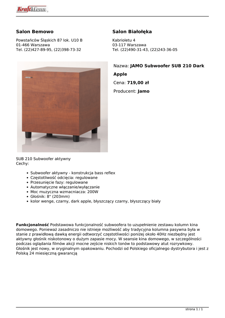 Salon Bemowo Salon Białołęka Powstańców Śląskich 87 lok. U10 B 01-466 Warszawa Tel. (22)427-89-95, (22)398-73-32 Kabrioletu 4 03-117 Warszawa Tel. (22)490-31-43, (22)243-36-05 Nazwa: JAMO Subwoofer SUB 210 Dark Apple Cena: 719,00 zł Producent: Jamo SUB 210 Subwoofer aktywny Cechy: Subwoofer aktywny - konstrukcja bass reflex Częstotliwość odcięcia: regulowane Przesunięcie fazy: regulowane Automatyczne włączanie/wyłączanie Moc muzyczna wzmacniacza: 200W Głośnik: 8" (203mm) kolor wenge, czarny, dark apple, błyszczący czarny, błyszczący biały Funkcjonalność Podstawowa funkcjonalność subwoofera to uzupełnienie zestawu kolumn kina domowego. Ponieważ zasadniczo nie istnieje możliwość aby tradycyjna kolumna pasywna była w stanie z prawidłową dawką energii odtworzyć częstotliwości poniżej około 40Hz niezbędny jest aktywny głośnik niskotonowy o dużym zapasie mocy. W seansie kina domowego, w szczególności podczas oglądania filmów akcji mocne zejście niskich tonów to podstawowy atut rozrywkowy. Głośnik jest nowy, w oryginalnym opakowaniu. Pochodzi od Polskiego oficjalnego dystrybutora i jest z Polską 24 miesięczną gwarancją strona 1 / 1 Powered by TCPDF (www.tcpdf.org)