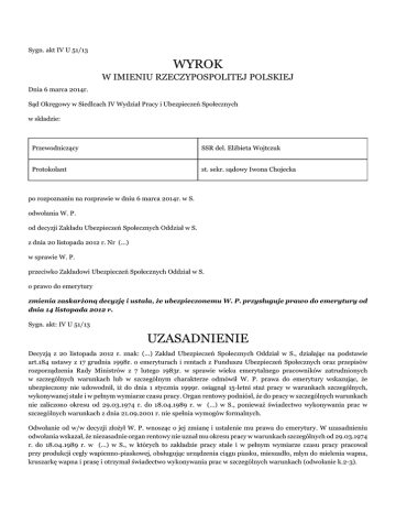 Sygn. akt IV U 51/13 WYROK W IMIENIU RZECZYPOSPOLITEJ POLSKIEJ Dnia 6 marca 2014r. Sąd Okręgowy w Siedlcach IV Wydział Pracy i Ubezpieczeń Społecznych w składzie: Przewodniczący SSR del. Elżbieta Wojtczuk Protokolant st. sekr. sądowy Iwona Chojecka po rozpoznaniu na rozprawie w dniu 6 marca 2014r. w S. odwołania W. P. od decyzji Zakładu Ubezpieczeń Społecznych Oddział w S. z dnia 20 listopada 2012 r. Nr (...) w sprawie W. P. przeciwko Zakładowi Ubezpieczeń Społecznych Oddział w S. o prawo do emerytury zmienia zaskarżoną decyzję i ustala, że ubezpieczonemu W. P. przysługuje prawo do emerytury od dnia 14 listopada 2012 r. Sygn. akt: IV U 51/13 UZASADNIENIE Decyzją z 20 listopada 2012 r. znak: (...) Zakład Ubezpieczeń Społecznych Oddział w S., działając na podstawie art.184 ustawy z 17 grudnia 1998r. o emeryturach i rentach z Funduszu Ubezpieczeń Społecznych oraz przepisów rozporządzenia Rady Ministrów z 7 lutego 1983r. w sprawie wieku emerytalnego pracowników zatrudnionych w szczególnych warunkach lub w szczególnym charakterze odmówił W. P. prawa do emerytury wskazując, że ubezpieczony nie udowodnił, iż do dnia 1 stycznia 1999r. osiągnął 15-letni staż pracy w warunkach szczególnych, wykonywanej stale i w pełnym wymiarze czasu pracy. Organ rentowy podniósł, że do pracy w szczególnych warunkach nie zaliczono okresu od 29.03.1974 r. do 18.04.1989 r. w (...) w S., ponieważ świadectwo wykonywania prac w szczególnych warunkach z dnia 21.09.2001 r. nie spełnia wymogów formalnych. Odwołanie od w/w decyzji złożył W. P. wnosząc o jej zmianę i ustalenie mu prawa do emerytury. W uzasadnieniu odwołania wskazał, że niezasadnie organ rentowy nie uznał mu okresu pracy w warunkach szczególnych od 29.03.1974 r. do 18.04.1989 r. w (...) w S., w których to zakładzie pracy stale i w pełnym wymiarze czasu pracy pracował przy produkcji cegły wapienno-piaskowej, obsługując urządzenia ciągu piasku, mieszadło, młyn do mielenia wapna, kruszarkę wapna i prasę i otrzymał świadectwo wykonywania prac w szczególnych warunkach (odwołanie k.2-3). W odpowiedzi na odwołanie organ rentowy wniósł o jego oddalenie powołując się na przepisy prawa i uzasadnienie zawarte w zaskarżonej decyzji (odpowiedź organu rentowego na odwołanie k.4). Sąd ustalił, co następuje: Ubezpieczony W. P. w dniu (...). ukończył 60-ty rok życia. W dniu 1 października 2012 r. wystąpił do Zakładu Ubezpieczeń Społecznych z wnioskiem o ustalenie prawa do emerytury. Na podstawie przedłożonych do wniosku dokumentów organ rentowy ustalił, że na dzień 1 stycznia 1999r. ubezpieczony udowodnił staż ubezpieczeniowy w wymiarze 25 lat, z czego okresy składkowe wynoszą 22 lata, 2 miesiące i 27 dni, a okresy nieskładkowe 2 lata, 9 miesięcy i 3 dni. Ponadto organ rentowy ustalił, że do dnia 1 stycznia 1999r. ubezpieczony nie udowodnił staż pracy w warunkach szczególnych w wymiarze 15 lat. Z uwagi na brak wymaganego ustawą stażu pracy w warunkach szczególnych decyzją z 20 listopada 2012 r. organ rentowy odmówił ubezpieczonemu przyznania emerytury (decyzja z 20.11.2012 r. – k.15 akt emerytalnych ubezpieczonego). Ubezpieczony w okresie od 29 marca 1974 r. do 18 kwietnia 1989 r. zatrudniony był w Wojewódzkim Związku Gminnych Spółdzielni (...) w S. w Zakładzie Produkcji (...) w S.. W. P. na początku zgodnie z dokumentacją zawartą w aktach osobowych pracował jako traktorzysta w dziale – (...), a z dniem 27 sierpnia 1976 r. został przeniesiony na produkcję. Ubezpieczony pracował przy produkcji cegły wapienno-piaskowej obsługując urządzenia ciągu piasku, mieszadło, młyn do mielenia wapna, kruszarkę wapna, prasę jako pracownik fizyczny produkcji, a następnie od 01.01.1984 r. powierzono mu obowiązki operatora mieszadła F-4 (dowód: akta osobowego ubezpieczonego, świadectwo wykonywania prac w szczególnych warunkach k.2). Praca ubezpieczonego polegała na przygotowaniu na hali produkcyjnej mieszanki do produkcji cegły silikatowej, co związane było z rozdrobnieniem wapna, które sprowadzane było wagonami następnie jego zmieleniem, obsługą mieszadła F-4, które mieszało wapno z wodą i piaskiem. Podczas pracy było duże zapylenie i wysoki poziom hałasu. Ubezpieczony pracując jako traktorzysta przywoził piach do produkcji cegły. W. P. w wymienionym zakładzie pracy pracował w pełnym wymiarze czasu pracy i stale pracując najpierw jako traktorzysta co również związane było w profilem produkcyjnym (...) w S. Zakładem Produkcji (...), a następnie przy produkcji cegły (zeznania świadków: T. C. – k.13v, S. R. – k.14, zeznania ubezpieczonego k. 14-14v). Ubezpieczony nie przystąpił do otwartego funduszu emerytalnego, nie pozostaje w stosunku pracy (okoliczności niesporna, oświadczenie zawarte we wniosku o emeryturę -k.1v -2 akt emerytalnych ubezpieczonego). Sąd zważył, co następuje: Odwołanie W. P. okazało się uzasadnione. Zgodnie z art.184 ust.1 i 2 ustawy z 17 grudnia 1998r. o emeryturach i rentach z Funduszu Ubezpieczeń Społecznych (Dz.U. z 2009r. Nr 153, poz.1227 ze zm.) ubezpieczonym urodzonym po dniu 31 grudnia 1948r. przysługuje emerytura po osiągnięciu wieku emerytalnego przewidzianego w art.32, jeżeli w dniu wejścia w życie ustawy ,tj. w dniu 1 stycznia 1999r. osiągnęli okres zatrudnienia w szczególnych warunkach lub w szczególnym charakterze wymaganym w przepisach dotychczasowych do nabycia prawa do emerytury w wieku niższym niż 60 lat dla kobiet i 65 lat dla mężczyzn oraz osiągnęli okres składkowy i nieskładkowy, o którym mowa w art.27 ustawy, a także nie przystąpili do otwartego funduszu emerytalnego albo złożyli wniosek o przekazanie środków zgromadzonych na rachunku w otwartym funduszu emerytalnym, za pośrednictwem Zakładu, na dochody budżetu państwa. Ponadto przed 01.01.2013 r. obowiązywał również wymóg wobec ubezpieczonego będącego praco