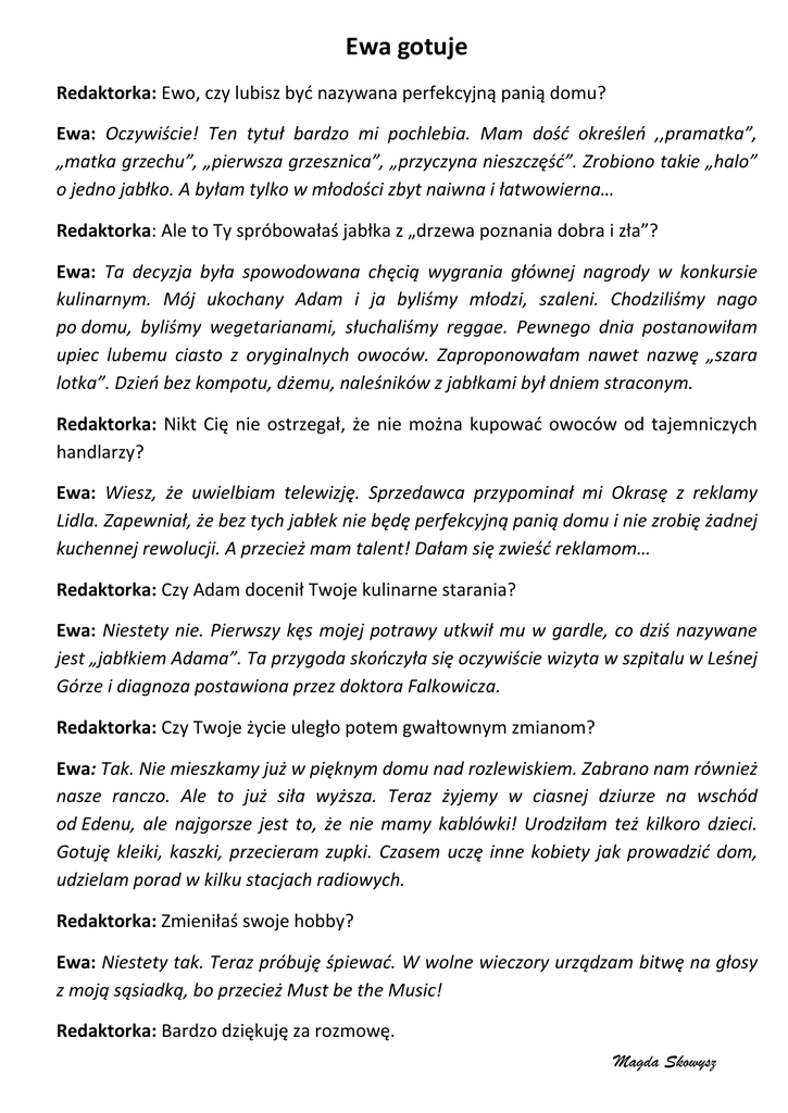 Ewa gotuje Redaktorka: Ewo, czy lubisz być nazywana perfekcyjną panią domu? Ewa: Oczywiście! Ten tytuł bardzo mi pochlebia. Mam dość określeń ,,pramatka”, „matka grzechu”, „pierwsza grzesznica”, „przyczyna nieszczęść”. Zrobiono takie „halo” o jedno jabłko. A byłam tylko w młodości zbyt naiwna i łatwowierna… Redaktorka: Ale to Ty spróbowałaś jabłka z „drzewa poznania dobra i zła”? Ewa: Ta decyzja była spowodowana chęcią wygrania głównej nagrody w konkursie kulinarnym. Mój ukochany Adam i ja byliśmy młodzi, szaleni. Chodziliśmy nago po domu, byliśmy wegetarianami, słuchaliśmy reggae. Pewnego dnia postanowiłam upiec lubemu ciasto z oryginalnych owoców. Zaproponowałam nawet nazwę „szara lotka”. Dzień bez kompotu, dżemu, naleśników z jabłkami był dniem straconym. Redaktorka: Nikt Cię nie ostrzegał, że nie można kupować owoców od tajemniczych handlarzy? Ewa: Wiesz, że uwielbiam telewizję. Sprzedawca przypominał mi Okrasę z reklamy Lidla. Zapewniał, że bez tych jabłek nie będę perfekcyjną panią domu i nie zrobię żadnej kuchennej rewolucji. A przecież mam talent! Dałam się zwieść reklamom… Redaktorka: Czy Adam docenił Twoje kulinarne starania? Ewa: Niestety nie. Pierwszy kęs mojej potrawy utkwił mu w gardle, co dziś nazywane jest „jabłkiem Adama”. Ta przygoda skończyła się oczywiście wizyta w szpitalu w Leśnej Górze i diagnoza postawiona przez doktora Falkowicza. Redaktorka: Czy Twoje życie uległo potem gwałtownym zmianom? Ewa: Tak. Nie mieszkamy już w pięknym domu nad rozlewiskiem. Zabrano nam również nasze ranczo. Ale to już siła wyższa. Teraz żyjemy w ciasnej dziurze na wschód od Edenu, ale najgorsze jest to, że nie mamy kablówki! Urodziłam też kilkoro dzieci. Gotuję kleiki, kaszki, przecieram zupki. Czasem uczę inne kobiety jak prowadzić dom, udzielam porad w kilku stacjach radiowych. Redaktorka: Zmieniłaś swoje hobby? Ewa: Niestety tak. Teraz próbuję śpiewać. W wolne wieczory urządzam bitwę na głosy z moją sąsiadką, bo przecież Must be the Music! Redaktorka: Bardzo dziękuję za rozmowę. Magda Skowysz