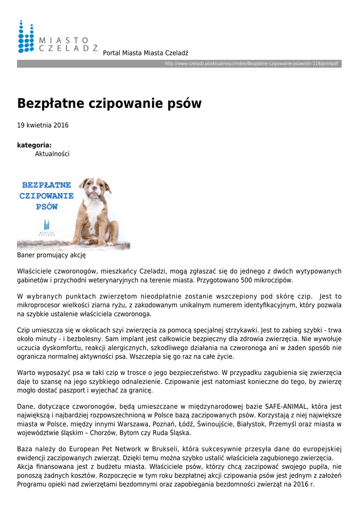 Portal Miasta Miasta Czeladź http://www.czeladz.pl/aktualnosci/index/Bezplatne-czipowanie-psow/idn:118/printpdf Bezpłatne czipowanie psów 19 kwietnia 2016 kategoria: Aktualności Baner promujący akcję Właściciele czworonogów, mieszkańcy Czeladzi, mogą zgłaszać się do jednego z dwóch wytypowanych gabinetów i przychodni weterynaryjnych na terenie miasta. Przygotowano 500 mikroczipów. W wybranych punktach zwierzętom nieodpłatnie zostanie wszczepiony pod skórę czip. Jest to mikroprocesor wielkości ziarna ryżu, z zakodowanym unikalnym numerem identyfikacyjnym, który pozwala na szybkie ustalenie właściciela czworonoga. Czip umieszcza się w okolicach szyi zwierzęcia za pomocą specjalnej strzykawki. Jest to zabieg szybki - trwa około minuty - i bezbolesny. Sam implant jest całkowicie bezpieczny dla zdrowia zwierzęcia. Nie wywołuje uczucia dyskomfortu, reakcji alergicznych, szkodliwego działania na czworonoga ani w żaden sposób nie ogranicza normalnej aktywności psa. Wszczepia się go raz na całe życie. Warto wyposażyć psa w taki czip w trosce o jego bezpieczeństwo. W przypadku zagubienia się zwierzęcia daje to szansę na jego szybkiego odnalezienie. Czipowanie jest natomiast konieczne do tego, by zwierzę mogło dostać paszport i wyjechać za granicę. Dane, dotyczące czworonogów, będą umieszczane w międzynarodowej bazie SAFE-ANIMAL, która jest największą i najbardziej rozpowszechnioną w Polsce bazą zaczipowanych psów. Korzystają z niej największe miasta w Polsce, między innymi Warszawa, Poznań, Łódź, Świnoujście, Białystok, Przemyśl oraz miasta w województwie śląskim – Chorzów, Bytom czy Ruda Śląska. Baza należy do European Pet Network w Brukseli, która sukcesywnie przesyła dane do europejskiej ewidencji zaczipowanych zwierząt. Dzięki temu można szybko ustalić właściciela zagubionego zwierzęcia. Akcja finansowana jest z budżetu miasta. Właściciele psów, którzy chcą zaczipować swojego pupila, nie ponoszą żadnych kosztów. Rozpoczęcie w tym roku bezpłatnej akcji czipowania psów jest jednym z założeń Programu opieki nad zwierzętami bezdomnymi oraz zapobiegania bezdomności zwierząt na 2016 r. PUNKTY REALIZUJĄCE BEZPŁATNE CZIPOWANIE PSÓW: 1. Przychodnia Weterynaryjna BAFIR, M. Zając, ul. Szpitalna 9A, 41-250 Czeladź 2. Przychodnia Weterynaryjna EVAN, Ł. Gątkiewicz, ul. Zwycięstwa 36, 41-253 Czeladź Źródło: Referat Rozwoju Miasta