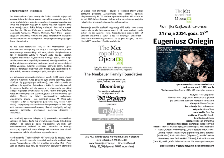 O nowojorskiej Met i transmisjach The Metropolitan Opera należy do ścisłej czołówki najlepszych teatrów świata. Jej siłą są przede wszystkim wspaniałe głosy. Od ponad stu lat nie było prawdziwie wielkiej śpiewaczki czy śpiewaka, którzy nie pragnęliby wystąpić na scenie Met (tak nazywają swój teatr nowojorczycy). Także Polacy – obecnie Aleksandra Kurzak, Piotr Beczała, Mariusz Kwiecień, a wcześniej Teresa Żylis-Gara, Małgorzata Walewska, Wiesław Ochman, Adam Didur i przede wszystkim wyjątkowo ubóstwiana przez Amerykanów Marcelina Sembrich-Kochańska – występowali i wciąż regularnie występują na deskach tego teatru. w jakości High Definition i dźwięk w formacie Dolby Digital Surround; pokazano „Zaczarowany flet” Mozarta. Spektakl obejrzało wtedy 30.000 widzów zgromadzonych w 150 salach na terenie USA. Sukces kasowy i frekwencyjny sprawił, że do projektu natychmiast przyłączyły się ośrodki z całego świata. Transmisje swoich spektakli organizują dziś także inne słynne teatry, ale to Met była prekursorem i tylko ona realizuje swoje pokazy na tak ogromną skalę. Przedstawienia sezonu 2013–14 obejrzeli widzowie w ponad 2 tys. sal kinowych, teatralnych i filharmonicznych 66 krajów świata. Do tej pory na cykl „The Met: Live in HD” sprzedano 15 milionów biletów. Piotr Iljicz Czajkowski (1840–1893) 24 maja 2014, godz. 1700 Eugeniusz Oniegin Do dziś budzi rozbawienie fakt, że The Metropolitan Opera powstała nie z artystycznej potrzeby, a z urażonych ambicji. Otóż żona pewnego nowojorskiego milionera, gdy nie zdobyła miejsca w loży w działającej wtedy w Nowym Jorku operze, nakazała swojemu małżonkowi wybudowanie nowego teatru, aby mogła godnie prezentować się w loży honorowej. Wynajęty architekt, nie bardzo wiedząc, co właściwie projektuje, skupił się na ociekającej złotem widowni, zupełnie lekceważąc potrzeby sceny. Podczas spektakli dekoracje składować więc trzeba było bezpośrednio na ulicy, a chór, nie mając własnej sali prób, ćwiczył w toalecie... Met zainaugurowała swoją działalność w roku 1883 operą „Faust” Charles’a Gounoda. Choć początki były trudne (pierwszy sezon zakończył się gigantycznym deficytem), teatr miał szczęście do wybitnych dyrygentów i śpiewaków, a także do przedsiębiorczych dyrektorów. Szybko stał się sceną, o występowanie na której zabiegali najwięksi, z Marią Callas na czele. Poziom artystyczny Met pozostawał na najwyższym poziomie, jednak warunki lokalowe były fatalne. Dlatego po latach postanowiono wybudować profesjonalny gmach i tam przenieść zespół. W 1966 roku otworzono jeden z największych (widownia liczy blisko 4.000 miejsc) i najlepiej wyposażonych teatrów operowych na świecie (w pełni zautomatyzowana wielka scena, kilkanaście sal prób, parkingi, wygodne garderoby, przestronne magazyny dekoracji i kostiumów). Met to dzisiaj operowa fabryka, a jej pracownicy pieszczotliwie nazywani są armią. Teatr ma w swoim repertuarze kilkadziesiąt tytułów – od klasyki po dzieła współczesne. Gra blisko 300 monumentalnych spektakli w roku. Wszystko to wymaga precyzyjnej organizacji pracy, dlatego też repertuar oraz obsady planowane są z około pięcioletnim wyprzedzeniem. Przedsięwzięcie „The Met: Live in HD” nawiązuje do bogatej, ponad 80-letniej tradycji słynnych transmisji radiowych spektakli tego teatru. Pomysłodawcą cyklu jest dyrektor generalny Met – Peter Gelb. 30 grudnia 2006 roku po raz pierwszy popłynął w eter obraz opera (sceny liryczne) w trzech aktach, siedmiu obrazach (1879), op. 24 The Metropolitan Opera 2013, 183 min. (plus przerwy) WWW.NAZYWOWKINACH.PL kino REJS Młodzieżowe Centrum Kultury w Słupsku aleja 3 Maja 22, 59 8435 434 www.kinorejs.emcek.pl [email protected] bilety: 35,00 (ulgowe), 40,00 (normalne) muzyka: Piotr Czajkowski libretto: Piotr Czajkowski i Konstantin Szyłowski (na podstawie poematu Aleksandra Puszkina) dyrygent: Valery Gergiev inscenizacja: Deborah Warner reżyseria: Fiona Shaw scenografia: Tom Pye kostiumy: Chloe Obolensky światło: Jean Kalman choreografia: Kim Brandstrup prowadzenie podczas transmisji: Deborah Voigt obsada: Mariusz Kwiecień (Eugeniusz Oniegin), Anna Netrebko (Tatiana), Oksana Volkova (Olga), Piotr Beczała (Włodzimierz Leński), Alexei Tanovitsky (książę Griemin), Elena Zaremba (pani Łarina), Larissa Diadkova (Filipiewna), David Crawford (Rotmistrz), John Graham-Hall (Triquet), Richard Bernstein (Zarecki), soliści, chór, balet i orkiestra The Metropolitan Opera przedstawienie w języku rosyjskim z polskimi napisami Akt pierwszy Akt drugi Akt trzeci Jesień. Osiadła na wsi pani Łarina wspomina czas, zanim wyszła za mąż. Kochała pewnego mężczyznę, ale zmuszono ją do małżeństwa z innym. Teraz, kiedy jest wdową, opiekuje się majątkiem ziemskim, który pozostał jej w spadku po mężu i wychowuje dwie prawie dorosłe córki: Tatianę i Olgę. Tatiana spędza czas na rozmyślaniach, czytaniu powieści i zbytnim przejmowaniu się losami ich bohaterów, Olga natomiast cieszy się każdym dniem, jest wesoła i beztroska. O rękę Olgi zabiega sąsiad Łarinych – poeta Leński. Pewnego dnia Włodzimierz odwiedza po raz kolejny swoją ukochaną, ale tym razem przywozi ze sobą niespodziewanego gościa. Jest nim Eugeniusz Oniegin, wytworny młody mężczyzna, w którym rozmarzona Tatiana natychmiast się zakochuje. Styczeń. Okoliczni sąsiedzi zostali zaproszeni do majątku Łarinych na bal z okazji imienin Tatiany. Przybywa także Oniegin, który niechętnie zgodził się towarzyszyć Leńskiemu, ponieważ prowincjonalne uroczystości rodzinne strasznie go nudzą. Dodatkowo zirytowany faktem, że goście, plotkując, coraz śmielej łączą jego osobę z Tatianą, mści się na Leńskim: zaczyna ostentacyjnie flirtować z Olgą. Leński nie rozumie powodów zachowania swego przyjaciela, zazdrość zaślepia go na tyle