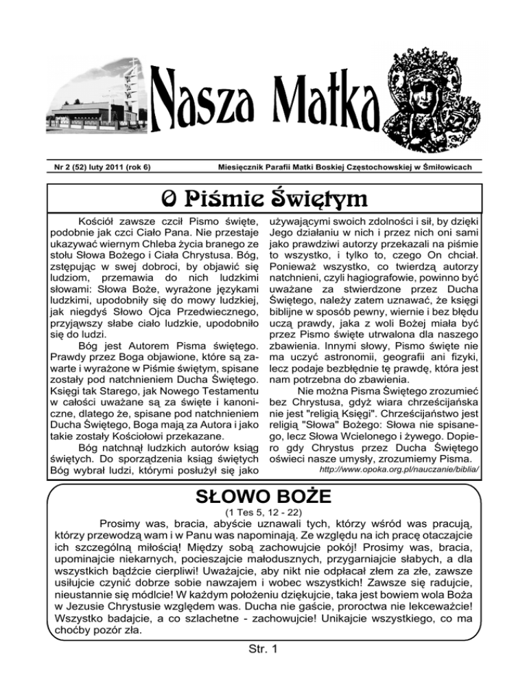 Nr 2 (52) luty 2011 (rok 6) Miesięcznik Parafii Matki Boskiej Częstochowskiej w Śmiłowicach Kościół zawsze czcił Pismo święte, podobnie jak czci Ciało Pana. Nie przestaje ukazywać wiernym Chleba życia branego ze stołu Słowa Bożego i Ciała Chrystusa. Bóg, zstępując w swej dobroci, by objawić się ludziom, przemawia do nich ludzkimi słowami: Słowa Boże, wyrażone językami ludzkimi, upodobniły się do mowy ludzkiej, jak niegdyś Słowo Ojca Przedwiecznego, przyjąwszy słabe ciało ludzkie, upodobniło się do ludzi. Bóg jest Autorem Pisma świętego. Prawdy przez Boga objawione, które są zawarte i wyrażone w Piśmie świętym, spisane zostały pod natchnieniem Ducha Świętego. Księgi tak Starego, jak Nowego Testamentu w całości uważane są za święte i kanoniczne, dlatego że, spisane pod natchnieniem Ducha Świętego, Boga mają za Autora i jako takie zostały Kościołowi przekazane. Bóg natchnął ludzkich autorów ksiąg świętych. Do sporządzenia ksiąg świętych Bóg wybrał ludzi, którymi posłużył się jako używającymi swoich zdolności i sił, by dzięki Jego działaniu w nich i przez nich oni sami jako prawdziwi autorzy przekazali na piśmie to wszystko, i tylko to, czego On chciał. Ponieważ wszystko, co twierdzą autorzy natchnieni, czyli hagiografowie, powinno być uważane za stwierdzone przez Ducha Świętego, należy zatem uznawać, że księgi biblijne w sposób pewny, wiernie i bez błędu uczą prawdy, jaka z woli Bożej miała być przez Pismo święte utrwalona dla naszego zbawienia. Innymi słowy, Pismo święte nie ma uczyć astronomii, geografii ani fizyki, lecz podaje bezbłędnie tę prawdę, która jest nam potrzebna do zbawienia. Nie można Pisma Świętego zrozumieć bez Chrystusa, gdyż wiara chrześcijańska nie jest "religią Księgi". Chrześcijaństwo jest religią "Słowa" Bożego: Słowa nie spisanego, lecz Słowa Wcielonego i żywego. Dopiero gdy Chrystus przez Ducha Świętego oświeci nasze umysły, zrozumiemy Pisma. http://www.opoka.org.pl/nauczanie/biblia/ SŁOWO BOŻE (1 Tes 5, 12 - 22) Prosimy was, bracia, abyście uznawali tych, którzy wśród was pracują, którzy przewodzą wam i w Panu was napominają. Ze względu na ich pracę otaczajcie ich szczególną miłością! Między sobą zachowujcie pokój! Prosimy was, bracia, upominajcie niekarnych, pocieszajcie małodusznych, przygarniajcie słabych, a dla wszystkich bądźcie cierpliwi! Uważajcie, aby nikt nie odpłacał złem za złe, zawsze usiłujcie czynić dobrze sobie nawzajem i wobec wszystkich! Zawsze się radujcie, nieustannie się módlcie! W każdym położeniu dziękujcie, taka jest bowiem wola Boża w Jezusie Chrystusie względem was. Ducha nie gaście, proroctwa nie lekceważcie! Wszystko badajcie, a co szlachetne - zachowujcie! Unikajcie wszystkiego, co ma choćby pozór zła. Str. 1 Przedstawiam Państwu bardzo ciekawą ekspertyzę naukową autorstwa ks. dra hab. Jerzego Dadaczyńskiego na temat czy istnieje język śląski, czemu niektóre tzw “autorytety” zaprzeczają. Ekspertyza pochodzi ze strony: http://www.silesiana.org.pl. Ks. dr hab. Jerzy Dadaczyński jest Kierownikiem Katedry Filozofii Logiki, Wydziału Filozoficznego, Uniwersytetu Papieskiego Jana Pawła II w Krakowie. gmb Kilka lat temu ukazała się w sprzedaży “Biblia Ślązoka” Marka Szołtyska. Ci, którzy przeglądali jej tekst wiedzą, że nie chodzi w tym wypadku o pełny przekład na język śląski tekstów biblijnych. Autor dokonał przekładu tylko nielicznych fragmentów głównie o charakterze epickim. Zaś całość uzupełniona jest wieloma tekstami i ilustracjami ukazującymi historię, tradycję i kulturę Górnego Śląska. Nie chcę podejmować kwestii wartości samej książki. Trzeba się przede wszystkim zająć dyskusją, którą sprowokowało ukazanie się Biblii Ślązoka. Dyskusja ta dotyczyła przede wszystkim wartości, walorów języka śląskiego. Wśród kilku wypowiedzi uderzyło mnie twierdzenie, które w dalszym ciągu analizy będę nazywał tezą Miodka. Otóż wrocławski, znany z wielu wystąpień telewizyjnych, językoznawca stwierdził, że gwara śląska nie nadaje się do wyrażania treści abstrakcyjnych, a więc również w konsekwencji do wyrażania treści religijnych. Zatem w tezie tej kryła się negacja wartości przekładu dokonanego przez Marka Szołtyska. Na pierwszy rzut oka wydaje się, że teza pana profesora Miodka jest tezą dość obojętną. Wydaje się, że rzeczywiście można by twierdzić za nim, że język śląski jest zbyt ubogi do wyrażania treści, znaczeń, sensów abstrakcyjnych. Jednak znaczenie tezy Miodka okazuje się dopiero w zestawieniu z pewnymi innymi twierdzeniami. Wiadomo, że refleksja filozoficzna może dotyczyć wielu dziedzin naszego życia: matematyki, poznania, również języka. Filozofia języka jest równie stara jak cała filozofia, jej początek związany jest z osobą Platona. Ten starożytny filozof, jeden z najwybitniejszych w dziejach, wypowiedział między innymi następujące twierdzenie: myślenie zależne jest od języka. Ta teza, która uznawana jest za klasyczną, była podtrzymywana przez Leibniza, Cassirera i Humboldta. Tymi którzy dokonali w tej dziedzinie wyłomu byli intuicjoniści holenderscy, którzy zajmowali się filozofią matematyki i którzy twierdzili, że myślenie jest niezależne od języka matematyki. Osiągali w ten sposób ważną dla siebie konkluzję, że matematyka jest niezależna od logiki, więcej, że logika jest zależna od matematyki. Ale intuicjonizm jest zjawiskiem mimo wszystko marginalnym, izolowanym. Matematyka intuicjonistyczna i cała intuicjonistyczna filozofia nie zyskały sobie zbyt wielu zwolenników. Zatem można przyjąć jako obowiązującą tezę Platona: myślenie zależne jest od języka. Co mówi to twierdzenie? Ano to, że tylko o tym jesteśmy w stanie myśleć, co jest w stanie wyrazić język, którym się posł