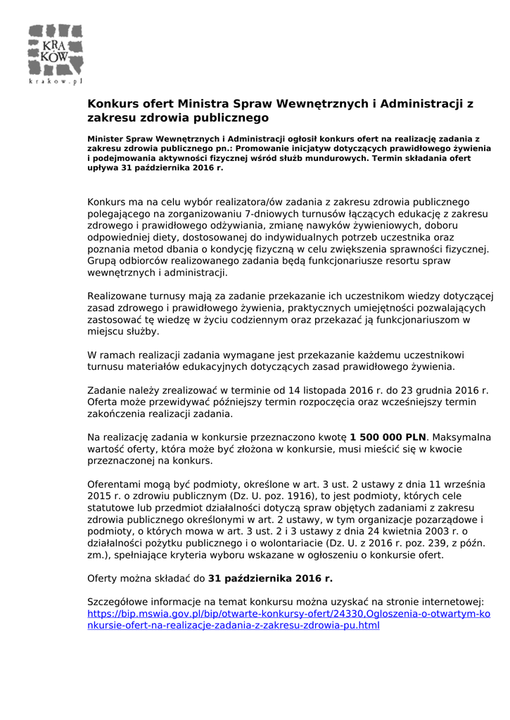 Konkurs ofert Ministra Spraw Wewnętrznych i Administracji z zakresu zdrowia publicznego Minister Spraw Wewnętrznych i Administracji ogłosił konkurs ofert na realizację zadania z zakresu zdrowia publicznego pn.: Promowanie inicjatyw dotyczących prawidłowego żywienia i podejmowania aktywności fizycznej wśród służb mundurowych. Termin składania ofert upływa 31 października 2016 r. Konkurs ma na celu wybór realizatora/ów zadania z zakresu zdrowia publicznego polegającego na zorganizowaniu 7-dniowych turnusów łączących edukację z zakresu zdrowego i prawidłowego odżywiania, zmianę nawyków żywieniowych, doboru odpowiedniej diety, dostosowanej do indywidualnych potrzeb uczestnika oraz poznania metod dbania o kondycję fizyczną w celu zwiększenia sprawności fizycznej. Grupą odbiorców realizowanego zadania będą funkcjonariusze resortu spraw wewnętrznych i administracji. Realizowane turnusy mają za zadanie przekazanie ich uczestnikom wiedzy dotyczącej zasad zdrowego i prawidłowego żywienia, praktycznych umiejętności pozwalających zastosować tę wiedzę w życiu codziennym oraz przekazać ją funkcjonariuszom w miejscu służby. W ramach realizacji zadania wymagane jest przekazanie każdemu uczestnikowi turnusu materiałów edukacyjnych dotyczących zasad prawidłowego żywienia. Zadanie należy zrealizować w terminie od 14 listopada 2016 r. do 23 grudnia 2016 r. Oferta może przewidywać późniejszy termin rozpoczęcia oraz wcześniejszy termin zakończenia realizacji zadania. Na realizację zadania w konkursie przeznaczono kwotę 1 500 000 PLN. Maksymalna wartość oferty, która może być złożona w konkursie, musi mieścić się w kwocie przeznaczonej na konkurs. Oferentami mogą być podmioty, określone w art. 3 ust. 2 ustawy z dnia 11 września 2015 r. o zdrowiu publicznym (Dz. U. poz. 1916), to jest podmioty, których cele statutowe lub przedmiot działalności dotyczą spraw objętych zadaniami z zakresu zdrowia publicznego określonymi w art. 2 ustawy, w tym organizacje pozarządowe i podmioty, o których mowa w art. 3 ust. 2 i 3 ustawy z dnia 24 kwietnia 2003 r. o działalności pożytku publicznego i o wolontariacie (Dz. U. z 2016 r. poz. 239, z późn. zm.), spełniające kryteria wyboru wskazane w ogłoszeniu o konkursie ofert. Oferty można składać do 31 października 2016 r. Szczegółowe informacje na temat konkursu można uzyskać na stronie internetowej: https://bip.mswia.gov.pl/bip/otwarte-konkursy-ofert/24330,Ogloszenia-o-otwartym-ko nkursie-ofert-na-realizacje-zadania-z-zakresu-zdrowia-pu.html Powered by TCPDF (www.tcpdf.org)