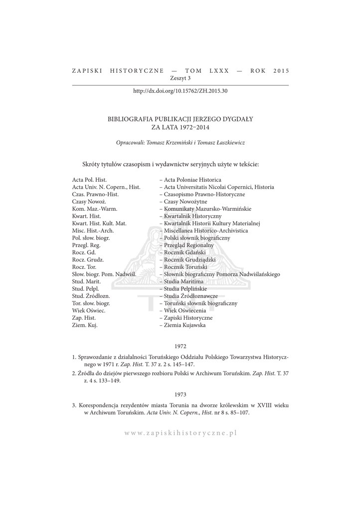 ZAPISKI HISTORYCZNE — TOM Zeszyt 3 LXXX — ROK 2015 http://dx.doi.org/10.15762/ZH.2015.30 BIBLIOGRAFIA PUBLIKACJI JERZEGO DYGDAŁY ZA LATA 1972–2014 Opracowali: Tomasz Krzemiński i Tomasz Łaszkiewicz Skróty tytułów czasopism i wydawnictw seryjnych użyte w tekście: Acta Pol. Hist. Acta Univ. N. Copern., Hist. Czas. Prawno-Hist. Czasy Nowoż. Kom. Maz.-Warm. Kwart. Hist. Kwart. Hist. Kult. Mat. Misc. Hist.-Arch. Pol. słow. biogr. Przegl. Reg. Rocz. Gd. Rocz. Grudz. Rocz. Tor. Słow. biogr. Pom. Nadwiśl. Stud. Marit. Stud. Pelpl. Stud. Źródłozn. Tor. słow. biogr. Wiek Oświec. Zap. Hist. Ziem. Kuj. – Acta Poloniae Historica – Acta Universitatis Nicolai Copernici, Historia – Czasopismo Prawno-Historyczne – Czasy Nowożytne – Komunikaty Mazursko-Warmińskie – Kwartalnik Historyczny – Kwartalnik Historii Kultury Materialnej – Miscellanea Historico-Archivistica – Polski słownik biograficzny – Przegląd Regionalny – Rocznik Gdański – Rocznik Grudziądzki – Rocznik Toruński – Słownik biograficzny Pomorza Nadwiślańskiego – Studia Maritima – Studia Pelplińskie – Studia Źródłoznawcze – Toruński słownik biograficzny – Wiek Oświecenia – Zapiski Historyczne – Ziemia Kujawska 1972 1. Sprawozdanie z działalności Toruńskiego Oddziału Polskiego Towarzystwa Historycznego w 1971 r. Zap. Hist. T. 37 z. 2 s. 145–147. 2. Źródła do dziejów pierwszego rozbioru Polski w Archiwum Toruńskim. Zap. Hist. T. 37 z. 4 s. 133–149. 1973 3. Korespondencja rezydentów miasta Torunia na dworze królewskim w XVIII wieku w Archiwum Toruńskim. Acta Univ. N. Copern., Hist. nr 8 s. 85–107. w w w. z a p i s k i h i s t o r y c z n e . p l 12 O p r a c o w a l i : To m a s z K r z e m i ń s k i i To m a s z Ł a s z k i e w i c z [376] 4. Prusy Królewskie a konfederacja barska w Wielkopolsce 1768–1770. Zap. Hist. T. 38 z. 2 s. 109–120. [W związku z pracą: Szczygielski Wacław: Konfederacja barska w Wielkopolsce 1768–1770. Warszawa 1970] 5. Sprawozdanie z działalności Toruńskiego Oddziału Polskiego Towarzystwa Historycznego w 1972 r. Zap. Hist. T. 38 z. 2 s. 147–148. 6. Toruńska sesja naukowa z okazji 200 rocznicy pierwszego rozbioru Polski i aneksji przez Prusy Pomorza Gdańskiego. Zap. Hist. T. 38 z. 2 s. 148–150. 1976 7. Jeszcze o Prusach Królewskich i konfederacji barskiej w Wielkopolsce. Zap. Hist. T. 41 z. 1 s. 149–152. [W związku z repliką: Szczygielski Wacław: Toruń i Prusy Królewskie a konfederacja barska w Wielkopolsce. Zap. Hist. T. 41: 1976 z. 1 s. 129–148] 8. Próby wykorzystania mennicy toruńskiej przez dwór i władze Rzeczypospolitej w drugiej połowie XVIII wieku. Rocz. Tor. T. 11 s. 181–198. 9. Scenariusz wystawy // In: Dorobek stulecia Towarzystwa Naukowego w Toruniu. Katalog wystawy jubileuszowej / red. Tadeusz Zakrzewski. – Toruń: Tow. Nauk. w Toruniu. – s. 49–75. 10. Stulecie Towarzystwa Naukowego w Toruniu. Kwart. Hist. R. 83 nr 3 s. 738–739. 11. Wielkie miasta Prus Królewskich wobec reformy menniczej z lat 1765–1766. Zap. Hist. T. 41 z. 3 s. 105–123. 1977 12. Nałęcz Michał h. Nałęcz (1691–1761), burmistrz Torunia. // In: Pol. słow. biogr. T. 22 – Wrocław. – s. 493. 13. O genealogiach patrycjatu toruńskiego XVI–XVIII wieku. Zap. Hist. T. 42 z. 3 s. 85– –106. [Wspólnie ze Stanisławem Salmonowiczem; w związku z pracą: Marian Gumowski: Herbarz patrycjatu toruńskiego. Toruń 1970] 14. Opozycja Prus Królewskich wobec cła generalnego w latach 1764–1766. Zap. Hist. T. 42 z. 2 s. 25–44. 15. Polityka Torunia wobec władz Rzeczypospolitej w latach 1764–1772. – Warszawa: PWN. – 211, [1] s. 16. Sprawozdanie z działalności Oddziału Polskiego Towarzystwa Historycznego w Toruniu w 1975 r. Zap. Hist. T. 42 z. 1 s. 171–173. 17. Toruń wobec unifikacji miar i wag Rzeczypospolitej w latach 1764–1766. Acta Univ. N. Copern., Hist. nr 11 s. 99–111. 18. Udział Gotfryda Lengnicha w toruńskiej konferencji dysydenckiej w 1767 roku. (Z problematyki stosunku Gdańska do kwestii różnowierczej w XVIII wieku). Zap. Hist. T. 42 z. 4 s. 9–30. w w w. z a p i s k i h i s t o r y c z n e . p l [377] Bibliografia publikacji Jerzego Dygdały za lata 1972–2014 13 1978 19. Oloff Efraim (1715–1766), rajca toruński. // In: Pol. słow. biogr. T. 23 – Wrocław. – s. 826–827. 20. Toruńskie czasopismo „Thornische Wöchentliche Nachrichten und Anzeigen”. (Problemy redakcji, zasięgu oddziaływania i profilu politycznego). Zap. Hist. T. 43 z. s. 67– –87. 21. Rec. – Błażejewicz Olena: Samuel Bogumił Linde: bibliotekarz i bibliograf. Wrocław, 1975. – Zap. Hist. T. 43 z. 1 s. 142–145. 1979 22. Uwagi o magnaterii Prus Królewskich w XVIII stuleciu. Zap. Hist. T. 44 z. 3 s. 57–91. 23. Rec. – Zienkowska Krystyna: Sławetni i urodzeni. Ruch polityczny mieszczaństwa w dobie Sejmu Czteroletniego. Warszawa, 1976. – Zap. Hist. T. 44 z. 2 s. 123–125. 1980 24. Na marginesie badań nad magnaterią epoki saskiej. Rocz. Gd. T. 40 z. 1 s. 187–198. 25. Synteza Pomorza Nadwiślańskiego. Kom. Maz.-Warm. R. 24 nr 2 s. 230–239. [Wspólnie z Maksymilianem Grzegorzem i Wojciechem Wrzesińskim] 26. Rec. – Metcalf Michael F.: Russia, England and Swedish party politics 1762–1766. The interplay between great power diplomacy and domestic politics during Sweden’s age of liberty. Stockholm, 1977. – Zap. Hist. T. 45 z. 3 s. 160–163. 1981 27. Kwestia dopuszczenia małych miast Prus Królewskich do sejmiku generalnego w latach 1764–1768. Zap. Hist. T. 46 z. 1 s. 47–75. 28. Piwnicki Jan Franciszek h. Lubicz (I. poł. XVIII w.), poseł na sejmy, podwojewodzi chełmiński. // In: Pol. słow. biogr. T. 26. Wrocław. – s. 602–603. 29. Piwnicki Kazimierz h. Lubicz (zm. 1749), poseł na sejmy, miecznik inflancki, sędzia ziemski chełmiński. // In: Pol. słow. biogr. T. 26. Wrocław. – s. 603–604. 30. Piwnicki Konstanty Kazimierz (używał czasem wy