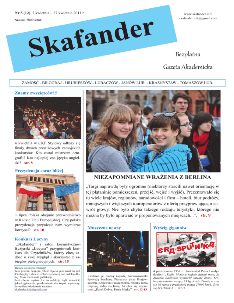 Nr 5 (12), 7 kwietnia – 27 kwietnia 2011 r. r e d n a f a k S Nakład: 5000 sztuk www.skafander.info [email protected] Bezpłatna Gazeta Akademicka ZAMOŚĆ - BIŁGORAJ - HRUBIESZÓW - LUBACZÓW - JANÓW LUB. - KRASNYSTAW - TOMASZÓW LUB. Znamy zwycięzców!!! 4 kwietnia w CKF Stylowy odbyły się finały dwóch prestiżowych zamojskich konkursów. Kto został mistrzem ortografii? Kto najlepiej zna języka angielski? str. 8 Prezydencja coraz bliżej NIEZAPOMNIANE WRAŻENIA Z BERLINA 1 lipca Polska obejmie przewodnictwo w Radzie Unii Europejskiej. Czy polska prezydencja przyniesie nam wymierne korzyści? str. 10 „Targi naprawdę były ogromne (niektórzy stracili nawet orientację w tej plątaninie pomieszczeń, przejść, wejść i wyjść). Prezentowało się tu wiele krajów, regionów, narodowości i firm – hoteli, biur podróży, mniejszych i większych touroperatorów z ofertą przyprawiającą o zawrót głowy. Nie było chyba takiego rodzaju turystyki, którego nie można by było uprawiać w proponowanych miejscach...”. str. 9 Muzyczne newsy Wyścig gigantów Konkurs Lucyny „Skafander” i salon kosmetycznofryzjerski „Lucyna” przygotowali konkurs dla Czytelników, którzy chcą zadbać o swój wygląd i skorzystać z zabiegów pielęgnacyjnych. str. 15 Dołącz do naszej redakcji! Jeśli piszesz, rysujesz, robisz zdjęcia, jeśli świat nie jest Ci obojętny i chcesz zrobić coś więcej, nie zwlekaj dłużej. Masz możliwość publikacji. Jeśli chcesz napisać list do redakcji, bądź zamieścić jakieś ogłoszenie, pozdrowienie dla kogoś, wystarczy, że wyślesz wiadomość na adres: [email protected] Grubson je modrą kapustę, tomaszowianki śpiewają Stachurę, Piaseczny pisze Krajewskiemu, Krajewski Piasecznemu, Stforky robią imprezę, radio ma fonię. Aż chce się zaśpiewać: „Dzień Dobry, Panie Marku” str. 12-13 4 października 1957 r., Associated Press Londyn doniósł: „Radio Moskwa nadało dzisiaj nocy, że Związek Radziecki wystrzelił satelitę Ziemi. Srebrzysty satelita ważący 83 kg okrąża Ziemię w czasie 96 minut z prędkością ponad 27000 km/h. Zwie się SPUTNIK-1”. str. 7 2 www.skafander.info Duszpasterstwo akademickie | Nie wstydź się krzyża W dniach 28-30 marca 2011r przeżywaliśmy Wielkopostne Rekolekcje Akademickie miejscem naszych spotkań był Kościół Rektoralny św. Katarzyny. Duchowym przewodnikiem był ksiądz Jacek Rak, proboszcz Parafii św. Stanisława w Żdanowie. Rekolekcje przebiegały pod hasłem: „Nie wstydź się krzyża – Pozwól się odnaleźć”. Pierwszego dnia mogliśmy przejść Drogą Krzyżową, a swoimi rozważaniami towarzyszył nam Sługa Boży Papież Jan Paweł II. Drugiego dnia podczas Eucharystii rekolekcjonista wskazał nam, jak powinniśmy odkrywać prawdę w Bogu, człowieku i świecie, który nas otacza. Później spotkaliśmy się w sali duszpasterskiej „Betejemce”, by przy herbacie porozmawiać o sprawach duszpasterstwa akademickiego w naszym mieście, jak i o tym „co leży nam na sercu” . W trzeci dzień mieliśmy okazję do rachunku sumienia, mogliśmy skorzystać z Sakramentu Pokuty i Pojednania, by na nowo odkryć Miłość Miłosierną Boga względem każdego z nas. A na zakoń- Pierwsze przedszkole specjalne w Zamościu czenie naszych rekolekcji podczas środowej Eucharystii ksiądz rekolekcjonista wskazywał nam, jak na nowo mamy odkryć, że „w krzyżu tkwi: piękno, prawda, życie, świętość, dobroć – że to twoje i moje życie”. Dziękuję księdzu Jackowi Rakowi za czas poświęcony dla ludzi młodych i Tym Wszystkim, którzy skorzystali z zaproszenia i przyszli na rekolekcje. Serdecznie zapraszam studentów, pracowników naukowych, pracowników administracji na pielgrzymkę akademicką na Jasną Górę w dniach 6-8 maja 2011r. Szczegóły wkrótce na stronie duszpasterstwa akademickiego i stronach naszych uczelni. ks. Jacek Kania duszpasterz akademicki w Zamościu klimatyczna muzyka, ogień i chłopaki z „bractwa” legionu rzymskiego. To trzeba zobaczyć na własne oczy! Niesamowity klimat. Wszystko jest organizowane na boisku przy Parafii Świętej Bożej Opatrzność na Karolówce! MISTERIUM MĘKI PAŃSKIEJ 16 kwietnia o godz. 20 na osiedlu Karolówka Grupa Teatralna „Warto” wystawi Misterium Męki Pańskiej. To będzie wydarzenie! Nie ma co ukrywać, jest to największe przedsięwzięcie teatralne w Zamościu poza Zamojskim Latem Teatralnym! Gra świateł, Artur Harasim Specjalny Ośrodek Szkolno-Wychowawczy w Zamościu od września uruchamia Przedszkole nr 3 Specjalne dla dzieci z upośledzeniem umysłowym w stopniu umiarkowanym lub znacznym oraz autyzmem. SOSW zapewniać będzie 5godzinną bezpłatną opiekę i wychowanie przedszkolne dla dzieci w wieku 3 lat. W ramach przedszkola przewidziane są zajęcia polisensoryczne w sali doświadczania świata, integracja sensoryczna, alternatywne metody komunikacji, zajęcia logopedyczne. Dzieci otrzymają pomoc pedagogiczną, psychologiczną, medyczną i opiekuńczą. Ponadto będą mogły korzystać z zajęć wczesnego wspomagania rozwoju na podstawie opinii o potrzebie takich zajęć wydanej przez poradnię psycholo- giczno-pedagogiczną. Dla dzieci z niepełnosprawnością intelektualną w stopniu umiarkowanym lub znacznym przewidziane są grupy od 6 do 10 osób, natomiast dla dzieci autystycznych grupy od 2 do 4 osób. Zapisy do przedszkola już trwają. Dodatkowe informacje w siedzibie Specjalnego Ośrodka SzkolnoWychowawczego, ul. Śląska 45A lub pod numerem telefonu 84-639-67-60 Mas najlepszych logopedów i psychologów z ośrodków w Zamościu, Lublinie i Warszawie. Oprócz tego dzieci, będące pod opieką Stowarzyszenia, mogą uczestniczyć w zajęciach grupowych, które odbywają się w Przedszkolu nr 7 przy ul. Asnyka. Pieniądze z obecnej zbiórki zostaną przeznaczone na rehabilitację i terapię dzieci oraz na wyposażenie sali ćwiczeń. Zbiórce patronuje Prezydent Miasta Zam
