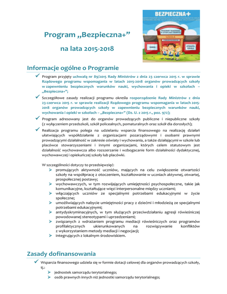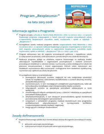 Program „Bezpieczna+” na lata 2015-2018 Informacje ogólne o Programie Program przyjęty uchwałą nr 89/2015 Rady Ministrów z dnia 23 czerwca 2015 r. w sprawie Rządowego programu wspomagania w latach 2015-2018 organów prowadzących szkoły w zapewnieniu bezpiecznych warunków nauki, wychowania i opieki w szkołach – „Bezpieczna+”; Szczegółowe zasady realizacji programu określa rozporządzenie Rady Ministrów z dnia 23 czerwca 2015 r. w sprawie realizacji Rządowego programu wspomagania w latach 20152018 organów prowadzących szkoły w zapewnieniu bezpiecznych warunków nauki, wychowania i opieki w szkołach – „Bezpieczna+” (Dz. U. z 2015 r., poz. 972); Program adresowany jest do organów prowadzących publiczne i niepubliczne szkoły (z wyłączeniem przedszkoli, szkół policealnych, pomaturalnych oraz szkół dla dorosłych); Realizacja programu polega na udzielaniu wsparcia finansowego na realizację działań ułatwiających współdziałanie z organizacjami pozarządowymi i osobami prawnymi prowadzącymi działalność w zakresie oświaty i wychowania, a także działającymi w szkole lub placówce stowarzyszeniami i innymi organizacjami, których celem statutowym jest działalność wychowawcza albo rozszerzanie i wzbogacanie form działalności dydaktycznej, wychowawczej i opiekuńczej szkoły lub placówki. W szczególności dotyczy to przedsięwzięć: promujących aktywność uczniów, mających na celu zwiększenie otwartości szkoły na współpracę z otoczeniem, kształtowanie w uczniach aktywnej, otwartej, prospołecznej postawy; wychowawczych, w tym rozwijających umiejętności psychospołeczne, takie jak komunikacyjne, kształtujące więzi interpersonalne między uczniami; włączających uczniów ze specjalnymi potrzebami edukacyjnymi w życie społeczne; umożliwiających nabycie umiejętności pracy z dziećmi i młodzieżą ze specjalnymi potrzebami edukacyjnymi; antydyskryminacyjnych, w tym służących przeciwdziałaniu agresji rówieśniczej powodowanej stereotypami i uprzedzeniami; związanych z wdrażaniem programu mediacji rówieśniczych oraz programów profilaktycznych ukierunkowanych na rozwiązywanie konfliktów z wykorzystaniem metody mediacji i negocjacji; integrujących z lokalnym środowiskiem. Zasady dofinansowania Wsparcia finansowego udziela się w formie dotacji celowej dla organów prowadzących szkoły, tj.: jednostek samorządu terytorialnego; osób prawnych innych niż jednostki samorządu terytorialnego; osób fizycznych; Wysokość udzielonego dofinansowania nie może przekroczyć 80% kosztów realizacji zadania; Organ prowadzący szkołę może otrzymać wsparcie finansowe jeden raz w odniesieniu do danej szkoły, przy czym w przypadku szkoły posiadającej organizacyjnie podporządkowaną szkołę filialną również jeden raz w odniesieniu do szkoły filialnej. Występowanie z wnioskiem o dofinansowanie Organ prowadzący szkołę występuje do wojewody z wnioskiem o udzielenie wsparcia finansowego (wg wzoru określonego w § 5 ust. 2 rozporządzenie Rady Ministrów z dnia 23 czerwca 2015 r. w sprawie realizacji Rządowego programu wspomagania w latach 2015-2018 organów prowadzących szkoły w zapewnieniu bezpiecznych warunków nauki, wychowania i opieki w szkołach – „Bezpieczna+”) w terminach: w roku szkolnym 2015/2016 – do dnia 15 września 2015r.; w latach szkolnych 2016/2017 oraz 2017/2018 – odpowiednio do dnia 1 czerwca 2016 r. oraz do dnia 1 czerwca 2017 r.; Zadanie w zakresie naboru wniosków w imieniu wojewody realizuje kurator oświaty. Wybór wniosków o dofinansowanie Wybór wniosków przedstawionych przez organy prowadzące szkoły dokonywany jest na podstawie oceny przeprowadzonej przez zespół wojewódzki powołany przez wojewodę; Niezwłocznie po podjęciu przez wojewodę decyzji o wyborze wniosków o udzielenie wsparcia finansowego wyniki podawane są do publicznej wiadomości wraz z informacją o organach prowadzących szkoły, którym udzielono dofinansowania oraz o wysokości przyznanego wsparcia finansowego; Zadanie w zakresie ogłoszenia wyników w imieniu wojewody realizuje kurator oświaty. Realizacja zadania Przekazanie organom prowadzącym szkoły środków budżetu państwa w ramach wsparcia finansowego następuje na podstawie umowy zawartej między wojewodą a tym organem prowadzącym, zgodnie z art. 150 ustawy z dnia 27 sierpnia 2009 r. o finansach publicznych (j. t. Dz. U. z 2013 r., poz. 885 ze zm.); Rozliczenie przez organ prowadzący szkołę otrzymanych środków następuje w terminie i w sposób określony w umowie zawartej z wojewodą, na podstawie przedłożonego wojewodzie zestawienia dowodów poniesienia wydatków; Organ prowadzący szkołę, w terminie do dnia 15 stycznia roku następującego po roku otrzymania wsparcia finansowego, przedkłada wojewodzie sprawozdanie dotyczące realizacji programu w poprzednim roku, zawierające: zestawienie ilościowo-wartościowe wydatków dokonanych w ramach programu, z wyszczególnieniem poniesionych wydatków; wnioski z realizacji programu.