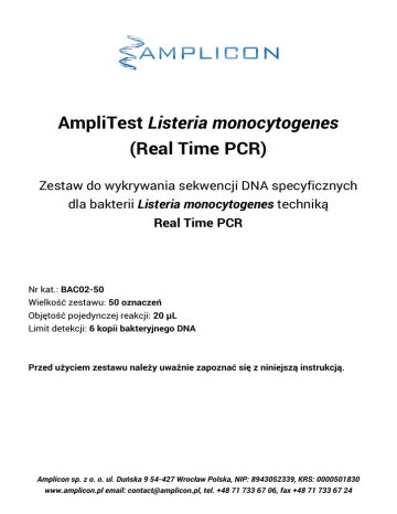 AmpliTest Listeria monocytogenes (Real Time PCR) Zestaw do wykrywania sekwencji DNA specyficznych dla bakterii Listeria monocytogenes techniką Real Time PCR Nr kat.: BAC02-50 Wielkość zestawu: 50 oznaczeń Objętość pojedynczej reakcji: 20 µL Limit detekcji: 6 kopii bakteryjnego DNA Przed użyciem zestawu należy uważnie zapoznać się z niniejszą instrukcją. Amplicon sp. z o. o. ul. Duńska 9 54-427 Wrocław Polska, NIP: 8943052339, KRS: 0000501830 www.amplicon.pl email: [email protected], tel. +48 71 733 67 06, fax +48 71 733 67 24 ZASTOSOWANIE Zestaw AmpliTest Listeria monocytogenes (Real Time PCR) jest przeznaczony do wykrywania sekwencji DNA specyficznych dla bakterii Listeria monocytogenes w próbkach uzyskanych z żywności lub tkanek zakażonego zwierzęcia. W celu uniknięcia problemów z wydajnością reakcji Real Time PCR próbki DNA powinny być przygotowane przy użyciu metod pozwalających otrzymać wysokiej jakości DNA pozbawiony inhibitorów reakcji PCR. Zalecane są zestawy do izolacji DNA oparte o złoża krzemionkowe (tzw. zestawy kolumienkowe). ZAKRES STOSOWANIA Diagnostyka weterynaryjna in vitro Badania i rozwój (B+R) Badania żywności na obecność zanieczyszczeń mikrobiologicznych SKŁADNIKI ZESTAWU Nazwa Opis Ilość Kolor wieczka RM Mieszanina reakcyjna 2 × 300 µL Zielony PC Kontrola pozytywna 2 × 50 µL Czerwony NC Kontrola negatywna 2 × 50 µL Niebieski Woda Woda 2 × 300 µL Biały TRANSPORT i PRZECHOWYWANIE Transport odbywa się w suchym lodzie. Po otrzymaniu przesyłki należy ją natychmiast rozpakować. Składniki testu przechowywać -20°C. UNIKAĆ EKSPOZYCJI SKŁADNIKA RM NA ŚWIATŁO; Unikać wielokrotnego zamrażania i rozmrażania składników testu w szczególności składnika RM. Trzy cykle zamrożenia i rozmrożenia składnika RM nie wpływają znacząco na jakość wyników. WSKAZÓWKA: na etykietach probówek zawierających składnik RM znajdują się pola, w których można zaznaczać ilość rozmrożeń danej porcji. Nie używać składników testu po upływie daty przydatności do użycia. 2 ZASADA DZIAŁANIA Zestaw AmpliTest Listeria monocytogenes (Real Time PCR) zawiera startery namnażające fragment genomu bakterii Listeria monocytogenes. Detekcja obecności bakteryjnego DNA następuje dzięki specyficznej sondzie typu TaqMan®, która przyłączając się do powstającego amplikonu (powielanego fragmentu bakteryjnego DNA) ulega hydrolizie. Podczas hydrolizy z sondy jest uwalniany barwnik fluorescencyjny FAM, który jest następnie wykrywany przez układ optyczny aparatu do Real Time PCR. Odpowiednio dobrane sekwencje starterów i sondy zapewniają wysoką specyficzność reakcji. W celu zwiększenia wiarygodności wyników Zestaw AmpliTest Listeria monocytogenes (Real Time PCR) zawiera kontrolę wewnętrzną (egzogenny fragment DNA) oraz układ starterów i sondy do jej namnożenia i detekcji. Detekcja kontroli wewnętrznej odbywa się dzięki uwalnianiu przez sondę barwnika fluorescencyjnego HEX. Obecność kontroli wewnętrznej pozwala na monitorowanie prawidłowego przebiegu reakcji Real Time PCR. Amplifikacja kontroli wewnętrznej nie wpływa na wydajność wykrywania sekwencji specyficznej dla Listeria monocytogenes. Pozytywny wynik kontroli wewnętrznej stanowi potwierdzenie prawidłowego przebiegu reakcji Real Time PCR. 3 POTRZEBNY SPRZĘT I DODATKOWE MATERIAŁY Aparat do Real Time PCR: LightCycler 480 (Roche) LightCycler 96 (Roche) LightCycler 2.0 (Roche) RotorGene 3000/6000 (Qiagen) Inne urządzenia umożliwiające detekcję barwników fluorescencyjnych FAM i HEX. Zestaw AmpliTest Listeria monocytogenes (Real Time PCR) nie zawiera barwnika normalizacyjnego ROX. W przypadku urządzeń wymagających takiej normalizacji należy do mieszaniny reakcyjnej dodać barwnik ROX do odpowiedniego stężenia. Barwnik ROX nie jest dołączony do zestawu. Probówki reakcyjne (próbówki PCR, płytki PCR, kapilary w zależności od posiadanego urządzenia do Real Time PCR) Wirówka do probówek reakcyjnych Wirówka stołowa Pipety automatyczne w zakresie 1-1000 µL Sterylne końcówki z filtrami do pipet automatycznych Zestaw do izolacji DNA W zależności od użytego zestawu do izolacji DNA może być potrzeby dodatkowy sprzęt i materiały. IZOLACJA DNA Z poszczególnych osobników pobrać fragmenty tkanek, a następnie wyizolować DNA. Ilość potrzebnego materiału zależy od użytej metody izolacji DNA. Do izolacji DNA zaleca się stosowanie zestawów opartych o złoża krzemionkowe (tzw. zestawów kolumienkowych), gdyż zapewniają one uzyskanie próbek DNA o odpowiedniej jakości pozbawionych inhibitorów reakcji PCR. W przypadku innych metod izolacji preparat DNA może zawierać związki, które istotnie zmniejszają wydajność reakcji PCR. Prowadzi to do obniżenia czułości testu, a w skrajnych przypadkach do braku amplifikacji DNA. Próbki DNA należy przechowywać w +4°C (krótki okres przechowywania) lub w -20°C (długi okres przechowywania). 4 REAKCJA REAL TIME PCR 1. Określić liczbę próbek DNA poddawanych analizie (n). 2. Rozmrozić składniki testu. Po rozmrożeniu składników dokładnie wymieszać zawartość probówek i krótko je zwirować. Składniki po rozmrożeniu przechowywać w +4°C lub na lodzie. UNIKAĆ EKSPOZYCJI składnika RM NA ŚWIATŁO; 3. Określić ilość DNA dodawanego do reakcji (x µL). Optymalna ilość DNA w reakcji wynosi 100-200 ng. Ilość DNA dodawanego do reakcji nie powinna przekroczyć 500 ng. Duże ilości DNA dodanego do reakcji PCR hamują aktywność polimerazy DNA i obniżają czułość testu. Typowo 100-200 ng DNA jest zawarte w 1-5 µL próbki DNA uzyskanej przy użyciu zestawu kolumienkowego. 4. Dokładnie wymieszać ze sobą (n + 3) × 12 µL mieszaniny reakcyjnej RM oraz (n + 3) × (8 - x) µL wody. 5. Do n + 2 probówek reakcyjnych (probówek PCR, kapilar, studzienek na płytce) nanieść po (20 – x) µL przygotowanej mieszaniny. 6. Do n probówek reakcyjnych