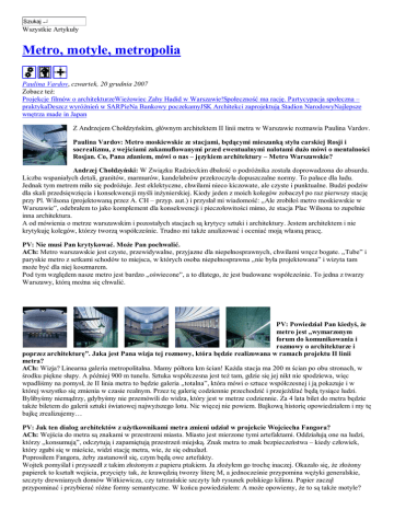 Szukaj Wszystkie Artykuły Metro, motyle, metropolia Paulina Vardov, czwartek, 20 grudnia 2007 Zobacz też: Projekcje filmów o architekturzeWieżowiec Zahy Hadid w Warszawie!Społeczność ma rację. Partycypacja społeczna – praktykaDeszcz wyróżnień w SARPieNa Bankowy poczekamyJSK Architekci zaprojektują Stadion NarodowyNajlepsze wnętrza made in Japan Z Andrzejem Chołdzyńskim, głównym architektem II linii metra w Warszawie rozmawia Paulina Vardov. Paulina Vardov: Metro moskiewskie ze stacjami, będącymi mieszanką stylu carskiej Rosji i socrealizmu, z wejściami zakamuflowanymi przed ewentualnymi nalotami dużo mówi o mentalności Rosjan. Co, Pana zdaniem, mówi o nas – językiem architektury – Metro Warszawskie? Andrzej Chołdzyński: W Związku Radzieckim dbałość o podróżnika została doprowadzona do absurdu. Liczba wspaniałych detali, granitów, marmurów, kandelabrów przekroczyła dopuszczalne normy. To pałace dla ludu. Jednak tym metrem miło się podróżuje. Jest eklektyczne, chwilami nieco kiczowate, ale czyste i punktualne. Budzi podziw dla skali przedsięwzięcia i konsekwencji myśli inżynierskiej. Kiedy jeden z moich kolegów zobaczył po raz pierwszy stację przy Pl. Wilsona (projektowaną przez A. CH – przyp. aut.) i przysłał mi wiadomość: „Ale zrobiłeś metro moskiewskie w Warszawie”, odebrałem to jako komplement dla konsekwencji i pieczołowitości mimo, że stacja Plac Wilsona to zupełnie inna architektura. A od mówienia o metrze warszawskim i pozostałych stacjach są krytycy sztuki i architektury. Jestem architektem i nie krytykuję kolegów, którzy tworzą współcześnie. Trudno mi także analizować i oceniać moją własną pracę. PV: Nie musi Pan krytykować. Może Pan pochwalić. ACh: Metro warszawskie jest czyste, przewidywalne, przyjazne dla niepełnosprawnych, chwilami wręcz bogate. „Tube” i paryskie metro z setkami schodów to miejsca, w których osoba niepełnosprawna „nie była projektowana” i wizyta tam może być dla niej koszmarem. Pod tym względem nasze metro jest bardzo „oświecone”, a to dlatego, że jest budowane współcześnie. To jedna z twarzy Warszawy, którą można się chwalić. PV: Powiedział Pan kiedyś, że metro jest „wymarzonym forum do komunikowania i rozmowy o architekturze i poprzez architekturę”. Jaka jest Pana wizja tej rozmowy, która będzie realizowana w ramach projektu II linii metra? ACh: Wizja? Linearna galeria metropolitalna. Mamy półtora km ścian! Każda stacja ma 200 m ścian po obu stronach, w środku piękne słupy. A później 900 m tunelu. Sztuka współczesna jest też tam, gdzie się jej nikt nie spodziewa, więc wpadliśmy na pomysł, że II linia metra to będzie galeria „totalna”, która mówi o sztuce współczesnej i ją pokazuje i w której wszystko się zmienia w czasie realnym. Przez tę galerię codziennie przechodzić i przejeżdżać będą tysiące ludzi. Bylibyśmy niemądrzy, gdybyśmy nie przemówili do widza, który jest w metrze codziennie. Za 4 lata bilet do metra będzie także biletem do galerii sztuki światowej najwyższego lotu. Nic więcej nie powiem. Bajkową historię opowiedziałem i my tę bajkę zrealizujemy… PV: Jak ten dialog architektów z użytkownikami metra zmieni udział w projekcie Wojciecha Fangora? ACh: Wejścia do metra są znakami w przestrzeni miasta. Miasto jest mierzone tymi artefaktami. Oddziałują one na ludzi, którzy „konsumują”, odczytują i zapamiętują przestrzeń miejską. Znak metra to znak bezpieczeństwa – kiedy człowiek, który zgubi się w mieście, widzi stację metra, wie, że się odnalazł. Poprosiłem Fangora, żeby zastanowił się, czym będą owe artefakty. Wojtek pomyślał i przyszedł z takim złożonym z papieru ptakiem. Ja złożyłem go trochę inaczej. Okazało się, że złożony papierek to kształt wejścia, przycięty tak, że krawędzią tworzy literę M, a jednocześnie przypomina wężyki generalskie, szczyty drewnianych domów Witkiewicza, czy tatrzańskie szczyty lub rysunek polskiego kilimu. Papier zaczął przypominać i przybierać różne formy semantyczne. W końcu powiedziałem: A może opowiemy, że to są także motyle? PV: I stanęło na motylach? Brzmi surrealistycznie… ACh: Przy jednej stacji będzie rój żółtych motyli, 900 metrów dalej rój niebieskich motyli, na kolejnym skrzyżowaniu stadko zielonych… a oczywiście pozostałe skojarzenia tatrzańskie , generalskie i Witkiewiczowskie pozostają ważne… Motyle ze szkła, o ostrych kontrastowych kolorach, nocą podświetlane od dołu, pojawią się w mieście. Pracujemy teraz nad tym, aby motyle nie dotykały ziemi, żeby – jak jest dużo mokrego śniegu z solą – nóżek im nie zżarło. Będą umieszczane wyżej, od metra wzwyż nad ziemią. Fangor do każdego z kolorowych rojów dopasował chromatyczny cykl dla poszczególnych stacji. PV: Niektóre z nowych stacji metra będą zlokalizowane w charakterystycznych dla Warszawy miejscach (Praga). Rozumiem, że nie przewidywał Pan wystylizowania tych stacji zgodnie z charakterem otoczenia, w ramach dialogu metra z miastem (np. w innych krajach, w chińskich dzielnicach zdarzają się wejścia w kształcie pagody…) ACh: Nie chcemy kształtować wejść do metra na zasadzie działania „kameleona”, który się upodabnia do otoczenia. Tym razem nie. Nie chcemy też być takimi jak Zelig, bohater filmu Woody Allena. Wydaje mi się, że tak jak w metrze paryskim czy londyńskim, to wydarzenie metropolitalne, którym jest kolejka podziemna (czy też naziemna) ma swoją własną estetykę, ma swój sposób przemawiania do widza i komunikowania z nim i to jest taka indywidualna seria archetypów. W swoim stylu zrobiona. Oczywiście można zrobić kiedyś wyjście ze stacji metra, podporządkowując się otoczeniu… PV: A może po prostu wkomponowując się…? ACh: To nie jest nasze myślenie. Oczywiście ja jestem wciąż architekte