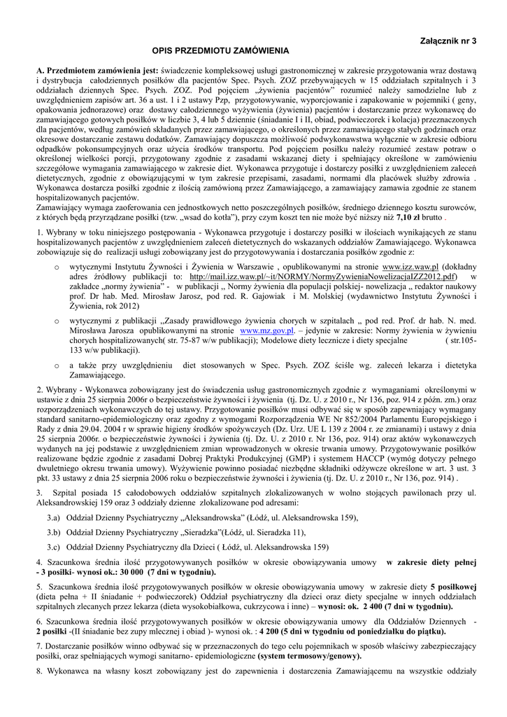 Załącznik nr 3 OPIS PRZEDMIOTU ZAMÓWIENIA A. Przedmiotem zamówienia jest: świadczenie kompleksowej usługi gastronomicznej w zakresie przygotowania wraz dostawą i dystrybucja całodziennych posiłków dla pacjentów Spec. Psych. ZOZ przebywających w 15 oddziałach szpitalnych i 3 oddziałach dziennych Spec. Psych. ZOZ. Pod pojęciem „żywienia pacjentów” rozumieć należy samodzielne lub z uwzględnieniem zapisów art. 36 a ust. 1 i 2 ustawy Pzp, przygotowywanie, wyporcjowanie i zapakowanie w pojemniki ( geny, opakowania jednorazowe) oraz dostawy całodziennego wyżywienia (żywienia) pacjentów i dostarczanie przez wykonawcę do zamawiającego gotowych posiłków w liczbie 3, 4 lub 5 dziennie (śniadanie I i II, obiad, podwieczorek i kolacja) przeznaczonych dla pacjentów, według zamówień składanych przez zamawiającego, o określonych przez zamawiającego stałych godzinach oraz okresowe dostarczanie zestawu dodatków. Zamawiający dopuszcza możliwość podwykonawstwa wyłącznie w zakresie odbioru odpadków pokonsumpcyjnych oraz użycia środków transportu. Pod pojęciem posiłku należy rozumieć zestaw potraw o określonej wielkości porcji, przygotowany zgodnie z zasadami wskazanej diety i spełniający określone w zamówieniu szczegółowe wymagania zamawiającego w zakresie diet. Wykonawca przygotuje i dostarczy posiłki z uwzględnieniem zaleceń dietetycznych, zgodnie z obowiązującymi w tym zakresie przepisami, zasadami, normami dla placówek służby zdrowia . Wykonawca dostarcza posiłki zgodnie z ilością zamówioną przez Zamawiającego, a zamawiający zamawia zgodnie ze stanem hospitalizowanych pacjentów. Zamawiający wymaga zaoferowania cen jednostkowych netto poszczególnych posiłków, średniego dziennego kosztu surowców, z których będą przyrządzane posiłki (tzw. „wsad do kotła”), przy czym koszt ten nie może być niższy niż 7,10 zł brutto . 1. Wybrany w toku niniejszego postępowania - Wykonawca przygotuje i dostarczy posiłki w ilościach wynikających ze stanu hospitalizowanych pacjentów z uwzględnieniem zaleceń dietetycznych do wskazanych oddziałów Zamawiającego. Wykonawca zobowiązuje się do realizacji usługi zobowiązany jest do przygotowywania i dostarczania posiłków zgodnie z: o wytycznymi Instytutu Żywności i Żywienia w Warszawie , opublikowanymi na stronie www.izz.waw.pl (dokładny adres źródłowy publikacji to: http://mail.izz.waw.pl/~it/NORMY/NormyZywieniaNowelizacjaIZZ2012.pdf) w zakładce „normy żywienia” - w publikacji ,, Normy żywienia dla populacji polskiej- nowelizacja „ redaktor naukowy prof. Dr hab. Med. Mirosław Jarosz, pod red. R. Gajowiak i M. Molskiej (wydawnictwo Instytutu Żywności i Żywienia, rok 2012) o wytycznymi z publikacji ,,Zasady prawidłowego żywienia chorych w szpitalach „ pod red. Prof. dr hab. N. med. Mirosława Jarosza opublikowanymi na stronie www.mz.gov.pl. – jedynie w zakresie: Normy żywienia w żywieniu chorych hospitalizowanych( str. 75-87 w/w publikacji); Modelowe diety lecznicze i diety specjalne ( str.105133 w/w publikacji). o a także przy uwzględnieniu Zamawiającego. diet stosowanych w Spec. Psych. ZOZ ściśle wg. zaleceń lekarza i dietetyka 2. Wybrany - Wykonawca zobowiązany jest do świadczenia usług gastronomicznych zgodnie z wymaganiami określonymi w ustawie z dnia 25 sierpnia 2006r o bezpieczeństwie żywności i żywienia (tj. Dz. U. z 2010 r., Nr 136, poz. 914 z późn. zm.) oraz rozporządzeniach wykonawczych do tej ustawy. Przygotowanie posiłków musi odbywać się w sposób zapewniający wymagany standard sanitarno-epidemiologiczny oraz zgodny z wymogami Rozporządzenia WE Nr 852/2004 Parlamentu Europejskiego i Rady z dnia 29.04. 2004 r w sprawie higieny środków spożywczych (Dz. Urz. UE L 139 z 2004 r. ze zmianami) i ustawy z dnia 25 sierpnia 2006r. o bezpieczeństwie żywności i żywienia (tj. Dz. U. z 2010 r. Nr 136, poz. 914) oraz aktów wykonawczych wydanych na jej podstawie z uwzględnieniem zmian wprowadzonych w okresie trwania umowy. Przygotowywanie posiłków realizowane będzie zgodnie z zasadami Dobrej Praktyki Produkcyjnej (GMP) i systemem HACCP (wymóg dotyczy pełnego dwuletniego okresu trwania umowy). Wyżywienie powinno posiadać niezbędne składniki odżywcze określone w art. 3 ust. 3 pkt. 33 ustawy z dnia 25 sierpnia 2006 roku o bezpieczeństwie żywności i żywienia (tj. Dz. U. z 2010 r., Nr 136, poz. 914) . 3. Szpital posiada 15 całodobowych oddziałów szpitalnych zlokalizowanych w wolno stojących pawilonach przy ul. Aleksandrowskiej 159 oraz 3 oddziały dzienne zlokalizowane pod adresami: 3.a) Oddział Dzienny Psychiatryczny „Aleksandrowska” (Łódź, ul. Aleksandrowska 159), 3.b) Oddział Dzienny Psychiatryczny „Sieradzka”(Łódź, ul. Sieradzka 11), 3.c) Oddział Dzienny Psychiatryczny dla Dzieci ( Łódź, ul. Aleksandrowska 159) 4. Szacunkowa średnia ilość przygotowywanych posiłków w okresie obowiązywania umowy - 3 posiłki- wynosi ok.: 30 000 (7 dni w tygodniu). w zakresie diety pełnej 5. Szacunkowa średnia ilość przygotowywanych posiłków w okresie obowiązywania umowy w zakresie diety 5 posiłkowej (dieta pełna + II śniadanie + podwieczorek) Oddział psychiatryczny dla dzieci oraz diety specjalne w innych oddziałach szpitalnych zlecanych przez lekarza (dieta wysokobiałkowa, cukrzycowa i inne) – wynosi: ok. 2 400 (7 dni w tygodniu). 6. Szacunkowa średnia ilość przygotowywanych posiłków w okresie obowiązywania umowy dla Oddziałów Dziennych 2 posiłki -(II śniadanie bez zupy mlecznej i obiad )- wynosi ok. : 4 200 (5 dni w tygodniu od poniedziałku do piątku). 7. Dostarczanie posiłków winno odbywać się w przeznaczonych do tego celu pojemnikach w sposób właściwy zabezpieczający posiłki, oraz spełniających wymogi sanitarno- epidemiologiczne (system termosowy/genowy). 8. Wykonawca na własny koszt zobowiązany jest do zapewnienia i dostarczenia Zamawiającemu 