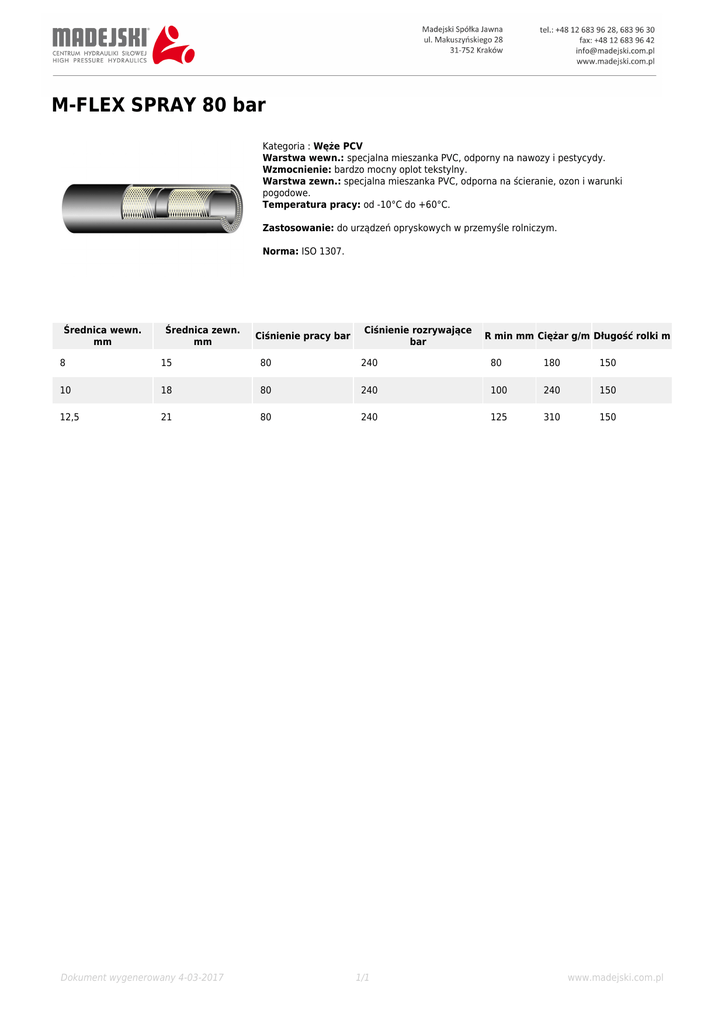 M-FLEX SPRAY 80 bar Kategoria : Węże PCV Warstwa wewn.: specjalna mieszanka PVC, odporny na nawozy i pestycydy. Wzmocnienie: bardzo mocny oplot tekstylny. Warstwa zewn.: specjalna mieszanka PVC, odporna na ścieranie, ozon i warunki pogodowe. Temperatura pracy: od -10°C do +60°C. Zastosowanie: do urządzeń opryskowych w przemyśle rolniczym. Norma: ISO 1307. Średnica wewn. mm Średnica zewn. mm Ciśnienie pracy bar Ciśnienie rozrywające bar R min mm Ciężar g/m Długość rolki m 8 15 80 240 80 180 150 10 18 80 240 100 240 150 12,5 21 80 240 125 310 150 Dokument wygenerowany 4-03-2017 1/1 www.madejski.com.pl