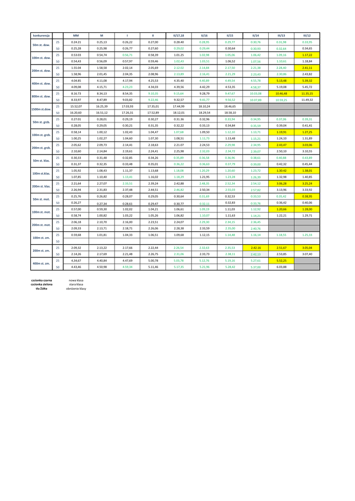 konkurencja 50m st. dow. 100m st. dow. 200m st. dow. 400m st. dow. 800m st. dow. 1500m st.dow. 50m st. grzb. 100m st. grzb. 200m st. grzb. 50m st. klas. 100m st.klas. 200m st. klas. 50m st. mot. 100m st. mot. 200m st. mot. 100m st. zm. MM M I II II/17,18 II/16 II/15 II/14 III/13 III/12 25 0.24.21 0.25,13 0.26,22 0.27,00 0.28.40 0.28,95 0.29,77 0.30,76 0.31,98 0.33,95 50 0.25,28 0.25,98 0.26,77 0.27,60 0.29,02 0.29,44 0.30,64 0.30,93 0.32,64 0.34,65 25 0.53.03 0.54,74 0.56,71 0.58,39 1.01.25 1.02,98 1.05,06 1.06,42 1.09,16 1.17,22 50 0.54,43 0.56,09 0.57,97 0.59,46 1.02,43 1.03,51 1.06,52 1.07,56 1.10,61 1.18,84 25 1.55.04 1.58,58 2.02,14 2.05,69 2.12.02 2.14,84 2.17,50 2.21,38 2.28,40 2.41,11 50 1.58,96 2.01,45 2.04,35 2.08,96 2.13,89 2.16,41 2.21,29 2.23,43 2.30,86 2.43,82 25 4.04.85 4.11,08 4.17,94 4.25,53 4.35.40 4.40,89 4.49,54 4.55,78 5.13,48 5.39,32 50 4.09,08 4.15,71 4.23,23 4.34,03 4.39,56 4.42,29 4.53,35 4.58,37 5.19,08 5.45,72 25 8.16.73 8.34,13 8.54,35 9.10,35 9.15,64 9.28,79 9.47,67 10.03,08 10.46,48 11.35,15 10.07,89 10.59,25 11.49,32 50 8.33,97 8.47,89 9.03,82 9.22,46 9.32,57 9.41,77 9.56,52 25 15.52,07 16.25,39 17.03,93 17.35,01 17.44,99 18.10,24 18.46,65 50 16.20,60 16.51,12 17.26,31 17.52,89 18.12,01 18.29,54 18.58,10 25 0.27.01 0.28,01 0.29,19 0.30,27 0.31.36 0.32,96 0.33,94 0.34,95 0.37,06 0.39,31 50 0.28,05 0.29,05 0.30,21 0.31,35 0.32,22 0.33,13 0.34,84 0.35,59 0.39,04 0.41,41 25 0.58,14 1.00,12 1.02,43 1.04,47 1.07,68 1.09,50 1.12,10 1.13,71 1.19,91 1.27,25 50 1.00,25 1.02,27 1.04,60 1.07,30 1.08,51 1.11,73 1.13,48 1.15,21 1.24,10 1.31,89 25 2.05,62 2.09,73 2.14,41 2.18,63 2.21.07 2.24,53 2.29,98 2.34,95 2.43,47 3.03,06 50 2.10,60 2.14,84 2.19,61 2.24,41 2.25,98 2.32,03 2.34,72 2.39,07 2.50,10 3.10,55 25 0.30,33 0.31,48 0.32,85 0.34,26 0.35,89 0.36,58 0.36,96 0.38,61 0.40,88 0.43,89 50 0.31,37 0.32,35 0.33,48 0.35,01 0.36,22 0.36,63 0.37,79 0.39,00 0.42,32 0.45,44 25 1.05,92 1.08,43 1.11,37 1.13,68 1.18,08 1.20,29 1.20,60 1.23,72 1.30.42 1.38,01 50 1.07,85 1.10,40 1.13,41 1.16,02 1.18,29 1.21,95 1.23,28 1.26,39 1.32,98 1.40,85 25 2.21,64 2.27,07 2.33,51 2.39,24 2.42,88 2.48,35 2.52,34 2.54,12 3.06,28 3.25,24 50 2.26,94 2.31,83 2.37,48 2.44,51 2.46,82 2.50,34 2.55,03 2.57,82 3.13,96 3.33,92 25 0.25,76 0.26,82 0.28,07 0.29,05 0.30,64 0.31,69 0.32,53 0.33,53 0.35,42 0.38,95 50 0.26,27 0.27,34 0.28,61 0.29,47 0.30,77 0.32,11 0.32,83 0.33,76 0.36,42 0.40,06 25 0.57,00 0.59,30 1.02,02 1.04,21 1.06,61 1.09,19 1.11,03 1.12,92 1.20,66 1.28,00 50 0.58,74 1.00,82 1.03,22 1.05,26 1.06,82 1.10,07 1.11,63 1.14,21 1.22,21 1.29,71 25 2.06,18 2.10,70 2.16,00 2.23,51 2.24,07 2.29,30 2.34,15 2.36,45 50 2.09,33 2.13,71 2.18,71 2.26,06 2.28,38 2.33,59 2.35,00 2.40,76 25 0.59,68 1.01,81 1.04,33 1.06,51 1.09,68 1.12,15 1.14,48 1.16,14 1.18,55 1.25,33 25 2.09,32 2.13,22 2.17,66 2.22,44 2.26,54 2.32,63 2.35,53 2.42.16 2.51,67 3.05,04 50 2.14,26 2.17,69 2.21,48 2.26,75 2.31,06 2.33,73 2.38,11 2.42,13 2.53,85 3.07,40 25 4,34,67 4.40,84 4.47,69 5.00,78 5.03,78 5.12,76 5.19,16 5.27,61 5.52,25 50 4.43,46 4.50,98 4.59,34 5.11,46 5.17,35 5.21,96 5.28,42 5.37,00 6.03,88 50 200m st. zm. 400m st. zm. czcionka czarna czcionka zielona tło Żółte nowa klasa stara klasa obniżenie klasy