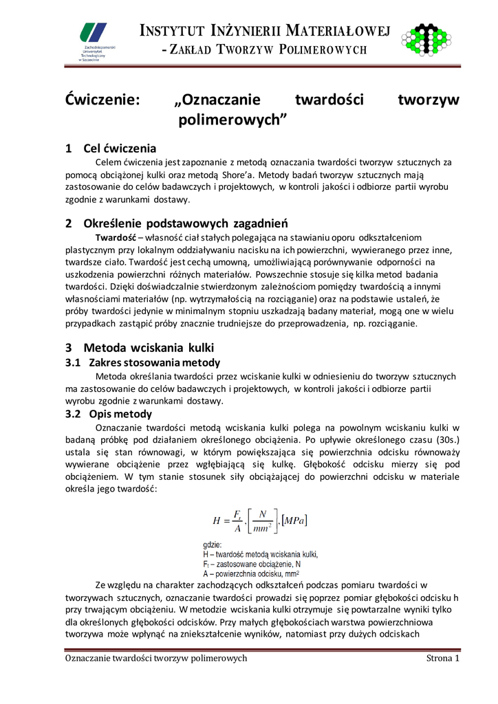 INSTYTUT INŻYNIERII MATERIAŁOWEJ - ZAKŁAD TWORZYW OLIMERO WYCH crosoft Word P - 22.doc Ćwiczenie: „Oznaczanie twardości polimerowych” tworzyw 1 Cel ćwiczenia Celem ćwiczenia jest zapoznanie z metodą oznaczania twardości tworzyw sztucznych za pomocą obciążonej kulki oraz metodą Shore’a. Metody badań tworzyw sztucznych mają zastosowanie do celów badawczych i projektowych, w kontroli jakości i odbiorze partii wyrobu zgodnie z warunkami dostawy. 2 Określenie podstawowych zagadnień Twardość – własność ciał stałych polegająca na stawianiu oporu odkształceniom plastycznym przy lokalnym oddziaływaniu nacisku na ich powierzchni, wywieranego przez inne, twardsze ciało. Twardość jest cechą umowną, umożliwiającą porównywanie odporności na uszkodzenia powierzchni różnych materiałów. Powszechnie stosuje się kilka metod badania twardości. Dzięki doświadczalnie stwierdzonym zależnościom pomiędzy twardością a innymi własnościami materiałów (np. wytrzymałością na rozciąganie) oraz na podstawie ustaleń, że próby twardości jedynie w minimalnym stopniu uszkadzają badany materiał, mogą one w wielu przypadkach zastąpić próby znacznie trudniejsze do przeprowadzenia, np. rozciąganie. 3 Metoda wciskania kulki 3.1 Zakres stosowania metody Metoda określania twardości przez wciskanie kulki w odniesieniu do tworzyw sztucznych ma zastosowanie do celów badawczych i projektowych, w kontroli jakości i odbiorze partii wyrobu zgodnie z warunkami dostawy. 3.2 Opis metody Oznaczanie twardości metodą wciskania kulki polega na powolnym wciskaniu kulki w badaną próbkę pod działaniem określonego obciążenia. Po upływie określonego czasu (30s.) ustala się stan równowagi, w którym powiększająca się powierzchnia odcisku równoważy wywierane obciążenie przez wgłębiającą się kulkę. Głębokość odcisku mierzy się pod obciążeniem. W tym stanie stosunek siły obciążającej do powierzchni odcisku w materiale określa jego twardość: Ze względu na charakter zachodzących odkształceń podczas pomiaru twardości w tworzywach sztucznych, oznaczanie twardości prowadzi się poprzez pomiar głębokości odcisku h przy trwającym obciążeniu. W metodzie wciskania kulki otrzymuje się powtarzalne wyniki tylko dla określonych głębokości odcisków. Przy małych głębokościach warstwa powierzchniowa tworzywa może wpłynąć na zniekształcenie wyników, natomiast przy dużych odciskach Oznaczanie twardości tworzyw polimerowych Strona 1 INSTYTUT INŻYNIERII MATERIAŁOWEJ - ZAKŁAD TWORZYW OLIMERO WYCH crosoft Word P - 22.doc wgłębiająca się kulka rozszerza tylko powstały już odcisk. Wyniki oblicza się ze wzoru: 3.3 Przyrząd Przyrząd do pomiaru twardości metodą wciskania kulki składa się z ramy z regulowanym stolikiem pomiarowym podtrzymującym próbkę, wgłębnika (tu: hartowana polerowana kulka o średnicy 5,0mm ± 0,05mm) z dopasowaną końcówką i urządzenia umożliwiającego zastosowanie obciążenia w sposób płynny. Przyrząd wyposażony jest w urządzenie do pomiaru głębokości odcisku z dokładnością ± 0,005 mm w zakresie 0,4 mm. Odkształcenie ramy pod działaniem maksymalnego obciążenia, mierzone wzdłuż głównej osi siły, nie powinno przekraczać 0,05 mm. Przyrząd po pomiaru twardości metodą wciskania kulki powinien zapewniać obciążenie wstępne o wartości 9,8 N, oraz obciążenia pomiarowe o następujących wartościach: 49,0 N – 132 N – 358 N – 961 N Próbka do badań powinna być gładką i płaską płytką o odpowiednich wymiarach, takich aby zredukować do minimum wpływ krawędzi na wyniki pomiaru, np. 50 x 50 mm. Powierzchnie próbki do badań powinny być równoległe. Zalecana minimalna grubość próbki – 4 mm 4 Przebieg ćwiczenia Umieścić próbką na stoliku pomiarowym i przyłożyć obciążenie wstępne, aby punkt styku kulki był oddalony co najmniej 10 mm od krawędzi próbki i ustawić czujnik pomiaru głębokości na zero.Przyłożyć obciążenie pomiarowe (należy tak dobrać obciążenie, aby głębokość odcisku mieściła się w zakresie 0,15 — 0,35 mm). Po upływie 30 sekund od zastosowania obciążenia zmierzyć pod obciążeniem głębokość odcisku z dokładnością ±0,005 mm. Następne pomiary wykonać należy w odległości nie mniejszej niż 10 mm od innych punktów i krawędzi próbki. Oznaczenia wykonywać w taki sposób, aby pęcherze lub pęknięcia w badanej próbce nie miały wpływu na wyniki badań. Wykonać 10 oznaczeń na jednej lub wielu próbkach do badań0. Wartości twardości większe niż 250 N/mm2 należy zaokrąglić do wielokrotności 1 N/mm2. natomiast wartości mniejsze od 250 N/mm2 należy zaokrąglić do wielokrotności 10 N/mm2. 5 Metoda Shore`a 5.1 Zakres stosowania metody Metodę oznaczania twardości wg Shore’a stosuje się do badania wszystkich rodzajów gumy oraz tworzyw pełnych jak i mikrokomórkowych stosowanych na spody obuwia, z wyjątkiem gumy porowatej. Do materiałów o twardości poniżej 90 jednostek Shore’a A należy stosować twardościomierz Shore’a typ A, a do materiałów o twardości powyżej 90 jednostek Shore’a A należy stosować twardościomierz Shore’a typ C lub typ D. Wyniki uzyskane przy stosowaniu różnych typów twardościomierzy nie są porównywalne. 5.2 Opis metody Oznaczanie twardości według metody Shore’a polega na pomiarze oporu jaki stawia badana Oznaczanie twardości tworzyw polimerowych Strona 2 INSTYTUT INŻYNIERII MATERIAŁOWEJ - ZAKŁAD TWORZYW OLIMERO WYCH crosoft Word P - 22.doc próbka podczas zagłębiania w niej iglicy o określonym kształcie i wymiarach. Opór ten mierzy się za pomocą sprężyny o znanej charakterystyce i wyraża się w umownych jednostkach twardości Shore’a A, C lub D. Twardość jest odwrotnie proporcjonalna do wielkości zagłębienia iglicy. Umownych jednostek twardości Shore’a nie można porównywać z innymi jednostkam