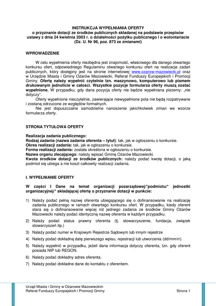 INSTRUKCJA WYPEŁNIANIA OFERTY o przyznanie dotacji ze środków publicznych składanej na podstawie przepisów ustawy z dnia 24 kwietnia 2003 r. o działalności poŜytku publicznego i o wolontariacie (Dz. U. Nr 96, poz. 873 ze zmianami) WPROWADZENIE W celu wypełnienia oferty niezbędna jest znajomość, właściwego dla danego otwartego konkursu ofert, odpowiedniego Regulaminu otwartego konkursu ofert na realizacje zadań publicznych, który dostępny jest na stronie internetowej www.ozarow-mazowiecki.pl oraz w Urzędzie Miasta i Gminy OŜarów Mazowiecki, Referat Funduszy Europejskich i Promocji Gminy. Ofertę naleŜy wypełnić czytelnie tzn. maszynowo, komputerowo lub pismem drukowanym jednolicie w całości. Wszystkie pozycje formularza oferty muszą zostać wypełnione. W przypadku, gdy dana pozycja oferty nie będzie wypełniana piszemy: „nie dotyczy”. Oferty wypełnione nieczytelnie, zawierające niewypełnione pola nie będą rozpatrywane i zostaną odrzucone ze względów formalnych. Nie jest dopuszczalne samodzielne nanoszenie jakichkolwiek zmian we wzorze formularza oferty. STRONA TYTUŁOWA OFERTY Realizacja zadania publicznego: Rodzaj zadania (nazwa zadania oferenta – tytuł): tak, jak w ogłoszeniu o konkursie. Okres realizacji zadania: tak, jak w ogłoszeniu o konkursie. Forma realizacji zadania: została określona w ogłoszeniu o konkursie. Nazwa organu zlecającego: naleŜy wpisać Gminę OŜarów Mazowiecki. Kwota środków dotacji ze środków publicznych: naleŜy podać kwotę dotacji, o jaką podmiot się ubiega a nie koszt całkowity realizacji zadania. I. WYPEŁNIANIE OFERTY W części I Dane na temat organizacji pozarządowej/*podmiotu/* organizacyjnej/* składającej ofertę o przyznanie dotacji w punkcie: jednostki 1) NaleŜy podać pełną nazwę oferenta ubiegającego się o dofinansowanie na realizację zadania publicznego w ramach otwartego konkursu ofert. W przypadku, kiedy oferent stara się o dofinansowanie więcej niŜ jednego zadania ze środków Gminy OŜarów Mazowiecki naleŜy podać identyczną nazwę oferenta w kaŜdym przypadku. 2) NaleŜy podać status stowarzyszeń itp.) prawny oferenta (tj. stowarzyszenie, fundacja, związek 3) NaleŜy podać numer w Krajowym Rejestrze Sądowym lub innym rejestrze 4) NaleŜy podać dokładną datę pierwszego wpisu, rejestracji lub utworzenia (dd/mm/rr). 5) NaleŜy wypełnić w przypadku, jeŜeli dana informacja dotyczy oferenta, tzn. gdy oferent posiada NIP lub REGON. 6) NaleŜy podać dokładny adres oferenta. 7) NaleŜy podać dokładne dane do kontaktu z oferentem. Urząd Miasta i Gminy w OŜarowie Mazowieckim Referat Funduszy Europejskich i Promocji Gminy Strona 1 8) NaleŜy podać dane dotyczące rachunku bankowego oferenta, na który w momencie przyznania dotacji na realizację zadania publicznego w ramach otwartego konkursu ofert zostaną przekazane środki finansowe z budŜetu Gminy OŜarów Mazowiecki. 9) NaleŜy podać dane osoby lub osób wraz z podaniem funkcji, jaką pełnią w organizacji, które zgodnie z postanowieniami statutu są upowaŜnione do reprezentowania oferenta na zewnątrz i zaciągania w jego imieniu zobowiązań finansowych (zawierania umów) oraz składania oświadczeń woli. 10) NaleŜy podać nazwę, adres i telefon kontaktowy oferenta, który ubiega się o dofinansowanie ze środków Gminy OŜarów Mazowiecki. 11) NaleŜy podać dane osoby upowaŜnionej przez oferenta do kontaktów w sprawach dotyczących wyjaśnień i uzupełnień składanych do oferty. 12) NaleŜy podać przedmiot działalności statutowej określony w statucie z podziałem na działalność odpłatną i nieodpłatną poŜytku publicznego. Podział ten powinien wynikać ze statutu. 13) NaleŜy wypełnić w przypadku prowadzenia działalności gospodarczej, podając przedmiot tej działalności oraz numer wpisu do rejestru przedsiębiorców w Krajowym Rejestrze Sądowym. W przypadku organizacji, które mają zapis o moŜliwości prowadzenia działalności gospodarczej w statucie, ale działalności takiej nie podjęły i tym samym nie miały obowiązku rejestracji w rejestrze przedsiębiorstw naleŜy napisać, Ŝe „nie dotyczy”. W części II Opis zadania w punkcie: 1) NaleŜy przepisać nazwę (tytuł) zadania ze Strony Tytułowej Oferty. 2) NaleŜy określić miejsce wykonywania zadania (np. miasto, województwo, region). 3) NaleŜy określić cel zadania, bezpośrednich adresatów zadania oraz zidentyfikować i opisać problem społeczny, na jaki ono odpowiada. NaleŜy podać informację czy oferent przewiduje i w jakim zakresie aktywny udział adresatów przy realizacji zadania. 4) NaleŜy szczegółowo opisać zadanie, rodzaj działań, jakie zostaną podjęte przy realizacji zadania, a takŜe metodę realizacji działań, z uwzględnieniem informacji o jej innowacyjnym, nowatorskim lub modelowym charakterze. NaleŜy liczbowo określić skalę działań podejmowanych przy realizacji zadania. UŜyte miary muszą być adekwatne dla danego zadania, np. liczba zawodników. MoŜna dodać informacje nt. powiązań projektu z innymi realizowanymi przez oferenta zadaniami. UWAGA! Szczegółowy opis zadania musi być spójny z kosztorysem oferty tzn., Ŝe musi istnieć logiczna spójność pomiędzy opisywanymi w tym punkcie działaniami, jakie zostaną podjęte w ramach realizacji zadania, a poszczególnymi kosztami znajdującymi się w kosztorysie oferty. 5) NaleŜy przedstawić harmonogram planowanych działań tzn. opisać w kolejności (w następstwie czasowym) działania, jakie oferent zamierza podjąć przy realizacji zadania, z podaniem terminów ich rozpoczęcia i zakończenia/ wraz z liczbowym określeniem skali działań planowanych przy realizacji zadania /naleŜy uŜyć miar adekwatnych dla danego zadania (np. rekrutacja do sekcji, treningi, rozgrywki, itd.; harmonogram jest uszczegółowieniem zapisu zawartego w pkt. 4 dotyczącego szczegółowego opisu zadania). 6) NaleŜy opisać jaki