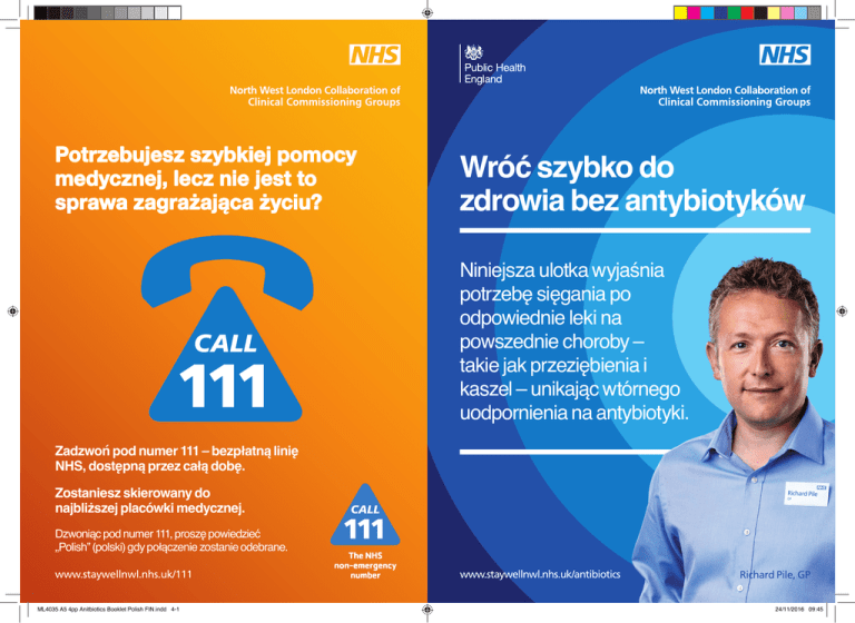 Potrzebujesz szybkiej pomocy medycznej, lecz nie jest to sprawa zagrażająca życiu? Wróć szybko do zdrowia bez antybiotyków Niniejsza ulotka wyjaśnia potrzebę sięgania po odpowiednie leki na powszednie choroby – takie jak przeziębienia i kaszel – unikając wtórnego uodpornienia na antybiotyki. Zadzwoń pod numer 111 – bezpłatną linię NHS, dostępną przez całą dobę. Zostaniesz skierowany do najbliższej placówki medycznej. Dzwoniąc pod numer 111, proszę powiedzieć „Polish” (polski) gdy połączenie zostanie odebrane. www.staywellnwl.nhs.uk/111 ML4035 A5 4pp Anitbiotics Booklet Polish FIN.indd 4-1 www.staywellnwl.nhs.uk/antibiotics Richard Pile, GP 24/11/2016 09:45 Dlaczego nie należy używać antybiotyków do leczenia przeziębień? Wszystkie przeziębienia oraz większość przypadków kaszlu i bólów gardła spowodowane są przez wirusy. Antybiotyki nie są skuteczne przeciw infekcjom takim jak przeziębienia, które są spowodowane przez wirusy. Infekcje wirusowe są dużo bardziej powszechne, niż infekcje bakteryjne. Jak należy leczyć przeziębienie? Najlepsza metoda leczenia większości przeziębień, kaszlu czy bólu gardła to przyjmowanie dużej ilości płynów i odpoczynek. Przeziębienie może trwać około dwóch tygodni i może zakończyć się kaszlem z flegmą. Wiele leków na takie objawy – na przykład paracetamol – dostępnych jest bez recepty. Poproś aptekarza o poradę. Pójdź do lekarza, jeśli przeziębienie trwa dłużej niż trzy tygodnie, lub jeśli dostajesz zadyszki czy masz bóle w klatce piersiowej, albo cierpisz na chorobę dróg oddechowych. A co z moimi dziećmi, które często się przeziębiają? Dzieci bardzo często łapią przeziębienia i kaszel, szczególnie gdy zaczną szkołę i stykają się z innymi dziećmi. Poproś aptekarza o poradę. Jeśli objawy nie ustępują i niepokoisz się, zaprowadź dzieci do lekarza, ale nie oczekuj, że otrzymasz receptę na antybiotyk. Co to są antybiotyki? Antybiotyki to ważne lekarstwa wykorzystywane do leczenia infekcji bakteryjnych. Bakterie mogą się adaptować, aby przetrwać efekty antybiotyku. Stają się ‘odporne na antybiotyk’ – antybiotyk przestaje wtedy działać. Im częściej używamy antybiotyki, tym bardziej prawdopodobne, że bakteria się na nie uodporni. Niektóre bakterie powodujące infekcje w szpitalach, takie jak MRSA, uodpornione są na szereg antybiotyków. ML4035 A5 4pp Anitbiotics Booklet Polish FIN.indd 2-3 Dlaczego nie można używać innych antybiotyków? Można, ale mogą być one mniej skuteczne, mogą też mieć więcej skutków ubocznych. A bakterie także się w końcu na nie uodpornią. Nie mamy pewności, że zawsze będziemy w stanie odkryć nowe antybiotyki, aby zastąpić stare. W ostatnich latach odkryto mniej antybiotyków. Jak można uniknąć uodpornienia na antybiotyki? Możemy zwolnić powstawanie uodpornienia poprzez rzadsze używanie antybiotyków. Zatrzymanie tego procesu nie jest możliwe, ale jego spowolnienie ogranicza rozpowszechnienie się odporności na antybiotyki, a także daje więcej czasu na rozwinięcie nowych rodzajów antybiotyków. Co mogę zrobić w kwestii uodpornienia na antybiotyki? Możesz zażywać antybiotyki tylko wtedy, gdy jest to konieczne. Wiemy już, że większość przeziębień równie szybko przechodzi bez użycia antybiotyków. Kiedy są przepisane należy zażyć całą dawkę w celu całkowitego pozbycia się bakterii. W przypadku nie ukończenia całego przepisanego leczenia, mogą pozostać w organizmie bakterie, które uodpornią się na dany antybiotyk. Kiedy więc mogę otrzymać receptę na antybiotyk? Lekarz przepisze antybiotyki tylko wtedy, gdy ich potrzebujesz, na przykład na zapalenie nerek czy zapalenie płuc. Antybiotyki mogą uratować życie w przypadku takich infekcji jak zapalenie opon mózgowych. Jeśli nie będziemy ich używać niepotrzebnie, będą mogły skuteczniej działać wtedy, kiedy ich będziemy potrzebować. Można znaleźć więcej informacji na stronie internetowej: www.staywellnwl.nhs.uk/antibiotics 24/11/2016 09:45