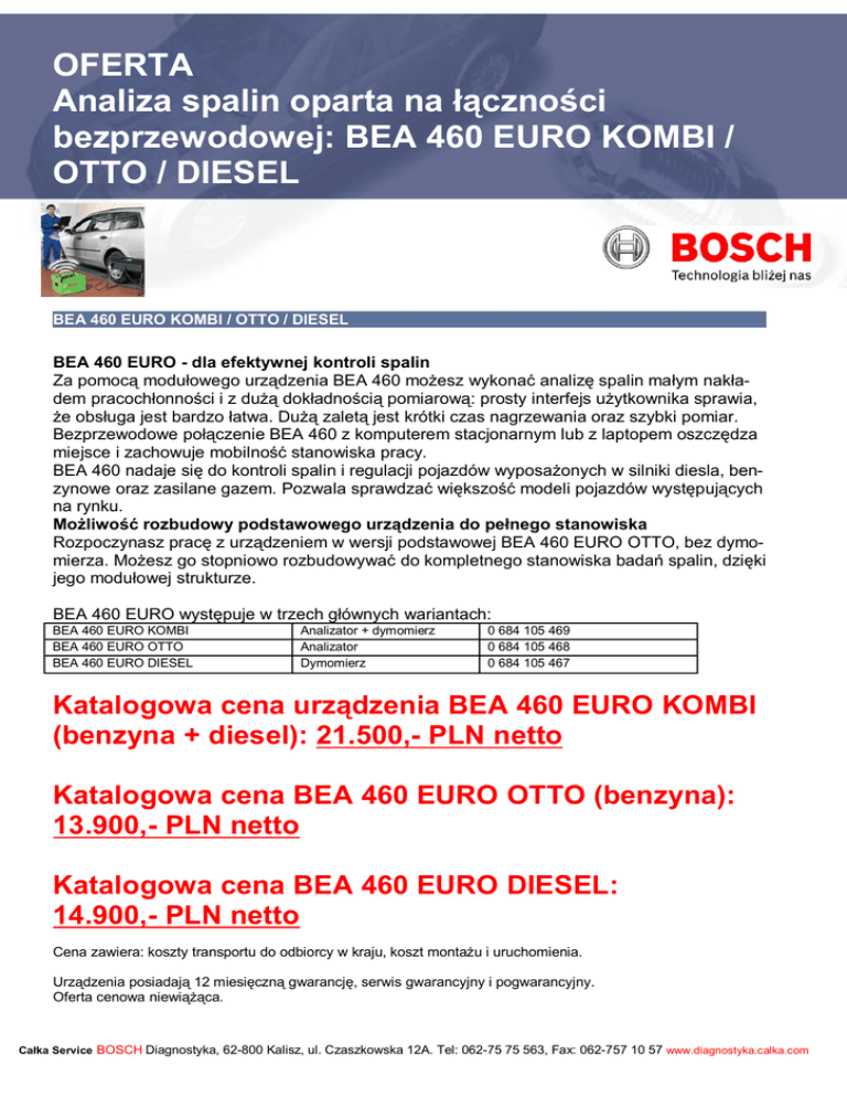 OFERTA Analiza spalin oparta na łączności bezprzewodowej: BEA 460 EURO KOMBI / OTTO / DIESEL BEA 460 EURO KOMBI / OTTO / DIESEL BEA 460 EURO - dla efektywnej kontroli spalin Za pomocą modułowego urządzenia BEA 460 możesz wykonać analizę spalin małym nakładem pracochłonności i z dużą dokładnością pomiarową: prosty interfejs użytkownika sprawia, że obsługa jest bardzo łatwa. Dużą zaletą jest krótki czas nagrzewania oraz szybki pomiar. Bezprzewodowe połączenie BEA 460 z komputerem stacjonarnym lub z laptopem oszczędza miejsce i zachowuje mobilność stanowiska pracy. BEA 460 nadaje się do kontroli spalin i regulacji pojazdów wyposażonych w silniki diesla, benzynowe oraz zasilane gazem. Pozwala sprawdzać większość modeli pojazdów występujących na rynku. Możliwość rozbudowy podstawowego urządzenia do pełnego stanowiska Rozpoczynasz pracę z urządzeniem w wersji podstawowej BEA 460 EURO OTTO, bez dymomierza. Możesz go stopniowo rozbudowywać do kompletnego stanowiska badań spalin, dzięki jego modułowej strukturze. BEA 460 EURO występuje w trzech głównych wariantach: BEA 460 EURO KOMBI BEA 460 EURO OTTO BEA 460 EURO DIESEL Analizator + dymomierz Analizator Dymomierz 0 684 105 469 0 684 105 468 0 684 105 467 Katalogowa cena urządzenia BEA 460 EURO KOMBI (benzyna + diesel): 21.500,- PLN netto Katalogowa cena BEA 460 EURO OTTO (benzyna): 13.900,- PLN netto Katalogowa cena BEA 460 EURO DIESEL: 14.900,- PLN netto Cena zawiera: koszty transportu do odbiorcy w kraju, koszt montażu i uruchomienia. Urządzenia posiadają 12 miesięczną gwarancję, serwis gwarancyjny i pogwarancyjny. Oferta cenowa niewiążąca. Całka Service BOSCH Diagnostyka, 62-800 Kalisz, ul. Czaszkowska 12A. Tel: 062-75 75 563, Fax: 062-757 10 57 www.diagnostyka.calka.com