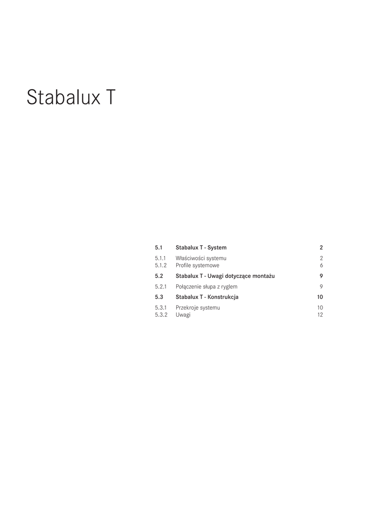 Stabalux T 5.0 Stabalux T 1 5.1 Stabalux T - System2 5.1.1 5.1.2 Właściwości systemu Profile systemowe 2 6 5.2 Stabalux T - Uwagi dotyczące montażu 9 5.2.1 Połączenie słupa z ryglem 9 5.3 Stabalux T - Konstrukcja 10 5.3.1 5.3.2 Przekroje systemu Uwagi 10 12 STABALUX Stabalux T System 5.1 1 Właściwości systemu System fasad stalowych Stabalux T Stosowanie z kanałem montażowym T_1.1_001.dwg Stabalux T System 17.06.14 2 STABALUX Stabalux T System 5.1 1 Właściwości systemu System fasad stalowych Stabalux T Stosowanie z listwą środkową T_1.1_001.dwg Stabalux T System 17.06.14 3 STABALUX Stabalux T System 5.1 1 Właściwości systemu Stablux AK-S – kanał montażowy na konstrukcji stalowej Opis systemu Stabalux T Profil teowy Stabalux w porównaniu do profili standardowych odznacza się ostrymi krawędziami i przejrzystą formą, uzyskaną dzięki niemal całkowicie prostokątnemu ułożeniu poszczególnych teowników względem siebie. Powierzchnie ścianek walcowanych na gorąco profili teowych Stabalux są prawie równoległe. Narożne zaokrąglenia są niewielkie. Powierzchnie mają charakter typowych stalowych kształtowników walcowanych. Możliwe jest stosowanie wszystkich powszechnie stosowanych metod powlekania materiałami organicznymi i metalami. Profile teowe Stabalux w wykonaniu ze stali nierdzewnej są spawane laserowo i charakteryzują się dokładną równoległością średników. System Stabalux AK-S oferuje w pełni dostosowany program dla przeszkleń pionowych i pochyłych, dla których przewidziano użycie szyb izolacyjnych. Kanał montażowy stosowany w fasadzie i w obszarze dachu jest identyczny i jest on mocowany za pomocą techniki wkrętowej bezpośrednio na stalowej konstrukcji nośnej. Technologia kanału montażowego oferuje znaczne zalety. Dalsze informacje dotyczące systemu i jego właściwości, uwagi na temat montażu oraz dane dotyczące konstrukcji i łączenia fasady z budynkiem zawiera rozdział Stabalux AK-S. Uzupełnieniem profili teowych są profile nakładane z prowadnicą uszczelki. Tworzą one razem doskonałe systemy przeszkleń na bazie stalowej konstrukcji nośnej. Zalecamy tu stosowanie systemu Stabalux ZL-S (listwa środkowa na profilach stalowych) i systemu AK-S (kanał montażowy na profilach stalowych). Oprócz znanych rozwiązań służących ochronie przed oślepianiem i zbyt mocnym promieniowaniem słonecznym oferujemy własny system z zewnętrznymi lamelami. Zadbaliśmy przy tym szczególnie o to, aby oprócz uwzględnienia wymogów architektonicznych i klimatycznych, mocowanie i montaż były dopasowane do systemów Stabalux. Szyby i listwy dociskowe nie są narażone na dodatkowe obciążenia ze strony systemu ochrony przeciwsłonecznej. Montaż i uszczelnienie są łatwe w wykonaniu i efektywne. Stabalux SOL Stablux ZL-S – listwa środkowa na konstrukcji stalowej Stabalux ZL-S jest prostym i niedrogim systemem nakładanym do przeszkleń pojedynczych i izolacyjnych, oferującym w pełni dostosowany program do wykonywania fasad i dachów ze stalową konstrukcją nośną. Dalsze informacje dotyczące systemu i jego właściwości, uwagi na temat montażu oraz dane dotyczące konstrukcji i łączenia fasady z budynkiem zawiera rozdział Stabalux ZL-S. T_1.1_002.dwg Stabalux T System 17.06.14 4 STABALUX Stabalux T System 5.1 1 Właściwości systemu Ochrona przeciwpożarowa w systemie Stabalux T Uszczelki ogniochronne Uszczelki Stabalux są wykonane z materiałów organicznych - z kauczuku na bazie EPDM i spełniają wymogi normy DIN 7863: Niekomórkowe elastomerowe profile uszczelniające do produkcji okien i fasad. Wykonawca fasady powinien sprawdzić kompatybilność materiału uszczelek z materiałami spoza palety produktów Stabalux, mającymi styczność z uszczelkami w miejscach połączeń z bryłą budynku. Uszczelki ogniochronne są produktem specjalnym. Dane i parametry tych uszczelek są zarejestrowane w Niemieckim Instytucie Techniki Budowlanej (DIBt). Jak wszystkie materiały organicznie, elastomery przy odpowiednio długim oddziaływaniu wysokiej temperatury i tlenu stają się palne. W celu obniżenia palności do uszczelek dodawane są substancje nieorganiczne. Zawartość substancji nieorganicznych wpływa pozytywne na poziom ognioodporności, powoduje jednak wzrost twardości i zmniejszenie wytrzymałości mechanicznej. Dlatego w przypadku uszczelek ogniochronnych należy zwrócić szczególną uwagę na płaskość konstrukcji i dokładne połączenie styków uszczelek. W zależności od geometrii uszczelki w przypadku uszczelek ogniochronnych konieczne może być rozciągnięcie uszczelek z rolki do postaci montażowej. Wyższe temperatury podnoszą elastyczność uszczelek i ułatwiają ich montaż. Niezależnie od systemów ZL-S i AK-S, dzięki bezpośredniemu montażowi uszczelek ogniochronnych na profilach teowych Stabalux i uzupełnieniu systemu o szyby ogniochronne uzyskujemy doskonałe parametry ochrony przeciwpożarowej. Profile teowe firmy Stabalux posiadają ogólne dopuszczenie niemieckiego Urzędu Nadzoru Budowlanego zgodnie z DIN 4102, część 13, dla klasy G 30 i F 30. Zasadę montażu uszczelek i mocowania wkrętowego realizuje się tak jak w przypadku systemu Stabalux ZL-S – jednak bez listwy środkowej. W przeszkleniach ogniochronnych obligatoryjnym wymogiem jest stosowanie listew zaciskowych ze stali nierdzewnej. Dopuszczalne jest stosowanie dolnych listew dociskowych dla osłoniętych połączeń wkrętowych oraz montaż listew dociskowych dla nieosłoniętych połączeń wkrętowych. Należy koniecznie przestrzegać wszystkich zaleceń określonych w dopuszczeniach. GD 6026 G30 / GD 6026 F30 Uszczelka wewnętrzna słupa Przeszklenie pionowe GD 6216 G30 Uszczelka wewnętrzna słupa Przeszklenie pochyłe GD 6218 G30 Uszczelka wewnętrzna rygla Przeszklenie pochyłe GD 6026 G30 / GD 6026 F30 z wypustem uszczelki rygla Z 0012, Z 0013 lub Z 0014 Uszczelka wewnętrzna rygla Przeszkl