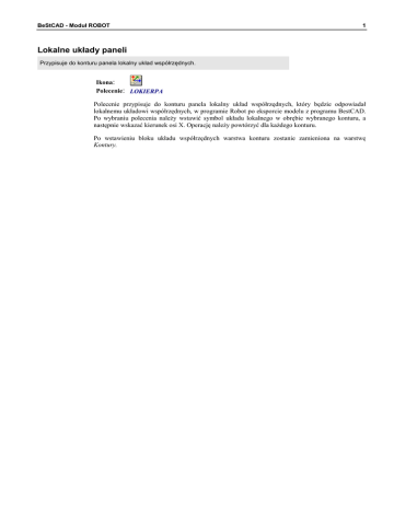 BeStCAD - Moduł ROBOT 1 Lokalne układy paneli Przypisuje do konturu panela lokalny układ współrzędnych. Ikona: Polecenie: LOKIERPA Polecenie przypisuje do konturu panela lokalny układ współrzędnych, który będzie odpowiadał lokalnemu układowi współrzędnych, w programie Robot po eksporcie modelu z programu BestCAD. Po wybraniu polecenia należy wstawić symbol układu lokalnego w obrębie wybranego konturu, a następnie wskazać kierunek osi X. Operację należy powtórzyć dla każdego konturu. Po wstawieniu bloku układu współrzędnych warstwa konturu zostanie zamieniona na warstwę Kontury.