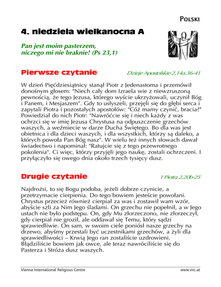 Polski Pan jest moim pasterzem, niczego mi nie braknie! (Ps 23,1) W dzień Pięćdziesiątnicy stanął Piotr z Jedenastoma i przemówił donośnym głosem: "Niech cały dom Izraela wie z niewzruszoną pewnością, że tego Jezusa, którego wyście ukrzyżowali, uczynił Bóg i Panem, i Mesjaszem". Gdy to usłyszeli, przejęli się do głębi serca i zapytali Piotra i pozostałych apostołów: "Cóż mamy czynić, bracia?" Powiedział do nich Piotr: "Nawróćcie się i niech każdy z was ochrzci się w imię Jezusa Chrystusa na odpuszczenie grzechów waszych, a weźmiecie w darze Ducha Świętego. Bo dla was jest obietnica i dla dzieci waszych, i dla wszystkich, którzy są daleko, a których powoła Pan Bóg nasz". W wielu też innych słowach dawał świadectwo i napominał: "Ratujcie się z tego przewrotnego pokolenia". Ci więc, którzy przyjęli jego naukę, zostali ochrzczeni. I przyłączyło się owego dnia około trzech tysięcy dusz. Najdrożsi, to się Bogu podoba, jeżeli dobrze czynicie, a przetrzymacie cierpienia. Do tego bowiem jesteście powołani. Chrystus przecież również cierpiał za was i zostawił wam wzór, abyście szli za Nim Jego śladami. On grzechu nie popełnił, a w Jego ustach nie było podstępu. On, gdy Mu złorzeczono, nie złorzeczył, gdy cierpiał nie groził, ale oddawał się Temu, który sądzi sprawiedliwie. On sam, w swoim ciele poniósł nasze grzechy na drzewo, abyśmy przestali być uczestnikami grzechów, a żyli dla sprawiedliwości – Krwią Jego ran zostaliście uzdrowieni. Błądziliście bowiem jak owce, ale teraz nawróciliście się do Pasterza i Stróża dusz waszych. Vienna International Religious Centre www.virc.at Jezus powiedział: "Zaprawdę, zaprawdę powiadam wam: Kto nie wchodzi do owczarni przez bramę, ale wdziera się inną drogą, ten jest złodziejem i rozbójnikiem. Kto jednak wchodzi przez bramę, jest pasterzem owiec. Temu otwiera odźwierny, a owce słuchają jego głosu; woła on swoje owce po imieniu i wyprowadza je. A kiedy wszystkie wyprowadzi, staje na ich czele, a owce postępują za nim, ponieważ głos jego znają. Natomiast za obcym nie pójdą, lecz będą uciekać od niego, bo nie znają głosu obcych". Tę przypowieść opowiedział im Jezus, lecz oni nie pojęli znaczenia tego, co im mówił. Powtórnie więc powiedział do nich Jezus: "Zaprawdę, zaprawdę powiadam wam: Ja jestem bramą owiec. Wszyscy, którzy przyszli przede Mną, są złodziejami i rozbójnikami, a nie posłuchały ich owce. Ja jestem bramą. Jeśli ktoś wejdzie przeze Mnie, będzie zbawiony – wejdzie i wyjdzie, i znajdzie paszę. Złodziej przychodzi tylko po to, aby kraść, zabijać i niszczyć. Ja przyszedłem po to, aby owce miały życie i miały je w obfitości". Obraz Dobrego Pasterza, przedstawiany w dzisiejszej Ewangelii wieloaspektowo, nie nosi na sobie śladów kiczu, czy jedynie czegoś sentymentalnego. Pasterze, w judaistycznym kręgu kulturowym, byli ważnymi osobistościami. Nosili cały ciężar odpowiedzialności za trzody, od których zależał dobrobyt narodu. Starali się o to, aby owce miały trawę i wodę także w suchych i niezagospodarowanych terenach. Chronili je przed dzikimi zwierzętami, przed złodziejami i rozbójnikami, a czasami płacili własnym życiem za swoje zaangażowanie. Jeżeli pasterze byli nieodpowiedzialni, ani zwierzęta, ani ich właściciele nie mogli żyć długo. W oparciu o takie doświadczenia i takie warunki życiowe jest zrozumiałe, że obraz pasterza był dla narodu w Starym Testamencie wyrazem działania Boga, który jako dobry pasterz ochraniał i utrzymywał w jedności trzodę Izraela. Dla młodego Kościoła zmartwychwstały Pan był najlepszym Pasterzem. On oddał swoje życie, aby stać się właściwym i pierwotnym źródłem życia dla swojego narodu. W obrazach dzisiejszego fragmentu pełni On funkcję podwójną: jest bramą, która chroni owce przed krzywdą a z drugiej strony pasterzem, który osłania je przed wszelkim złem. Zło, które prześladuje dzisiaj trzodę Chrystusa, ukazuje się w różnorodnych postaciach: zwyczajach, przesądach i zakazach, które same z siebie, a nie z miłości do Chrystusa są ważne. Zniewalają nas przywiązania do struktur i ideologii. Liczni guru i krzyczący propagandziści utrudniają nam słuchanie głosu pasterza. Jezus jest także dzisiaj Dobrym Pasterzem, który przynosi nam prawdziwe wyzwolenie, jeżeli łączymy się z Nim nie jako z ideologią, lecz jako z osobą. Jezus proponuje nam bycie pasterzem na drodze do Ojca. Z Nim możemy przejść przez życie w sposób bardziej dojrzały i odpowiedzialny. Mamy wśród nas Tego, którego głos możemy ciągle usłyszeć pośród gwaru wielu innych głosów. Chrystus wyzwolił nas przecież do wolności (por. Gal 5,1). Vienna International Religious Centre [email protected]