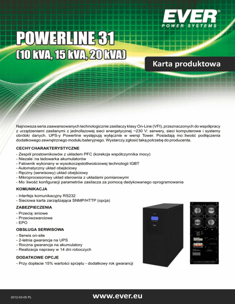 POWERLINE 31 (10 kVA, 15 kVA, 20 kVA) Karta produktowa Najnowsza seria zaawansowanych technologicznie zasilaczy klasy On-Line (VFI), przeznaczonych do współpracy z urządzeniami zasilanymi z jednofazowej sieci energetycznej ~230 V: serwery, sieci komputerowe i systemy obróbki danych. UPS-y Powerline występują wyłącznie w wersji Tower. Posiadają możliwość podłączenia dodatkowego zewnętrznego modułu bateryjnego. Wystarczy zgłosić taką potrzebę do producenta. CECHY CHARAKTERYSTYCZNE - Zespół prostownikowów z układem PFC (korekcja współczynnika mocy) - Niezależna ładowarka akumulatorów - Falownik wykonany w wysokoczęstotliwościowej technologii IGBT - Automatyczny układ obejściowy - Ręczny (serwisowy) układ obejściowy - Mikroprocesorowy układ sterownia z układami pomiarowymi - Możliwość konfiguracji parametrów zasilacza za pomocą dedykowanego oprogramowania KOMUNIKACJA - Interfejs komunikacyjny RS232 - Sieciowa karta zarządzająca SNMP/HTTP (opcja) ZABEZPIECZENIA - Przeciążeniowe - Przeciwzwarciowe - EPO OBSŁUGA SERWISOWA - Serwis on-site - 2-letnia gwarancja na UPS - Roczna gwarancja na akumulatory - Realizacja naprawy w 14 dni roboczych DODATKOWE OPCJE - Przy dopłacie 15% wartości sprzętu - dodatkowy rok gwarancji 2012-03-05 PL www.ever.eu POWERLINE 31 (10 kVA, 15 kVA, 20 kVA) PARAMETRY TECHNICZNE PARAMETR / MODEL Moc wyjściowa 1) Środowisko pracy POWERLINE 31 Model 10k Model 15k Model 20k 10 kVA / 7 kW 15 kVA / 10,5 kW 20 kVA / 14 kW Pomieszczenia biurowe lub przemysłowe o niskim poziomie zanieczyszczeń Temperatura pracy 2) 0 ÷ + 40 C Temperatura przechowywania 0 ÷ + 40 0C 0 Wilgotność względna w czasie pracy < 95 % (bez kondensacji) Wilgotność względna w czasie przechowywania < 95 % (bez kondensacji) Wysokość n.p.m. 3) Do 1000 m Maksymalna długość przewodów wyjściowych < 10 m PRACA SIECIOWA Napięcie wejściowe międzyfazowe ~304 V ÷ 478 V ± 2 % Częstotliwość napięcia wejściowego 46 - 54 Hz ± 1 Hz Napięcie wyjściowe ~230 V ± 1 % Progi przełączenia: sieć - UPS ~304 V / ~478 V ± 2 % Kształt napięcia wyjściowego Sinus Czas przełączenia na UPS 0 PRACA REZERWOWA (BATERYJNA) Napięcie wyjściowe (wartość skuteczna) ~230 V ± 1 % Kształt napięcia wyjściowego Sinus Uwaga! Producent zastrzega sobie prawo do zmiany w/w parametrów bez uprzedniego powiadamiania. Progi przełączania: UPS - sieć ~311 V / ~450 V ± 2 % Częstotliwość napięcia wyjściowego 50 Hz ± 1 Hz Filtracja napięcia wyjściowego LC Zabezpieczenie przeciwzwarciowe Elektroniczne Zabezpieczenie przeciążeniowe Elektroniczne Czas powrotu na pracę sieciową 0 ms Czas podtrzymania z baterii wewn. zasilacza (100 % / 80 % / 50 % Pmax) 12 / 15 / 34 min * 25 / 32 / 65 min ** 18 / 23 / 48 min *** Moduły dodatkowe 7 Ah 40 Ah 40 Ah Maksymalny czas ładowania 1 modułu (po rozładowaniu mocą 80 % Pmax) <2h <8h <8h PARAMETRY MECHANICZNE Wymiary (wys. x szer. x gł.) Masa zasilacza 39 kg 55 kg 55 kg Masa modułu bateryjnego [kg] 133 kg 321 kg 321 kg 717 x 260 x 570 mm WYPOSAŻENIE Gniazda wyjściowe Listwa zasilająca, terminale śrubowe Sygnalizacja Bezpiecznik Interfejs komunikacyjny Akustyczno-diodowa 3 x automatyczny D 50 A -zabezpieczenie od strony zasilania 3 x automatyczny D 100 A -zabezpieczenie od strony zasilania 3 x automatyczny D 100 A -zabezpieczenie od strony zasilania RS 232, sieciowa karta zarządzająca SNMP/HTTP-opcja * Czas dla przykładowego 1 modułu 2 x 20 x 7 Ah. Istnieje możliwość podłączenia innych dedykowanych modułów ** Czas dla przykładowego 1 modułu 1 x 20 x 40 Ah. Istnieje możliwość podłączenia innych dedykowanych modułów *** Czas dla przykładowego 1 modułu 1 x 20 x 40 Ah. Istnieje możliwość podłączenia innych dedykowanych modułów 1) Dla normalnej pracy zasilacza obciążenie dołączone na jego wyjście nie powinno przekraczać 80% wartości podanej w tabeli. Zapas mocy jest niezbędny dla zachowania ciągłości pracy dołączanych urządzeń w przypadku chwilowych skoków prądu obciążenia. 2) Stałe narażenie zasilacza na działanie temperatury otoczenia powyżej +25°C powoduje obniżenie żywotności baterii. 3) Wraz ze wzrostem wysokości nad poziomem morza powyżej podanego limitu obniża się dopuszczalna moc obciążenia zasilacza. 2012-03-05 PL www.ever.eu POWERLINE 31 (10 kVA, 15 kVA, 20 kVA) WYTYCZNE INSTALACYJNE TYP / PARAMETRY Moc wyjściowa POWERLINE 31 Model 10 k Model 15 k Model 20 k 10 kVA / 7 kW 15 kVA / 10,5 kW 20 kVA / 14 kW Parametry zasilania Topologia instalacji zasilającej 3P5W Znamionowe napięcie wejściowe ~400 V Znamionowy prąd wejściowy 9A Maksymalny prąd wejściowy 47 A Znamionowa częstotliwość wejściowa Uwaga! Producent zastrzega sobie prawo do zmiany w/w parametrów bez uprzedniego powiadamiania. Zabezpieczenia linii 16 A 69 A 90 A 50 Hz > 90 % Sprawność Minimalny przekrój kabli 12 A 2 10 mm 4 x 50 A (chk C) 16 mm2 25 mm2 4 x 80 A (chk C) 4 x 100 A (chk C) Parametry wyjściowe Topologia instalacji wyjściowej 1P3W Znamionowe napięcie wyjściowe 230 V Znamionowy prąd wyjściowy Maksymalny prąd wyjściowy Minimalny przekrój kabli Zabezpieczenia linii 31 A 46 A 43 A 65 A 2 61 A 86 A 2 10 mm 16 mm 25 mm2 2 x 50 A (chk B) 2 x 80 A (chk B) 2 x 100 A (chk B) Parametry środowiskowe Ilość wydzielanego ciepła dla nominalnych warunków pracy 2400 BTU 3600 BTU Temperatura pracy 0 - 400C Temperatura przechowywania 0 - 400C Wilgotność 3600 BTU < 95 % Do 1000 m Wysokość n.p.m. Parametry mechaniczne 717 x 260 x 570 mm Wymiary (wys. x szer. x gł.) Waga 55 kg 39 kg Front: > 200 mm Boki: > 100 mm Tył: > 300 mm Dystans eksploatacyjny MONTAŻ ZASILACZA Przy wyborze miejsca instalacji, należy wziąć pod uwagę masę urządzenia. Zasilacz powinien być używany tylko w pomieszczeniach, w których zapylenie, temperatura i wilgotność są zgodne ze specyfikacją urządzenia. Dla prawidłowej pracy zasilacza muszą być zapewnione odpowiednie warunki ch
