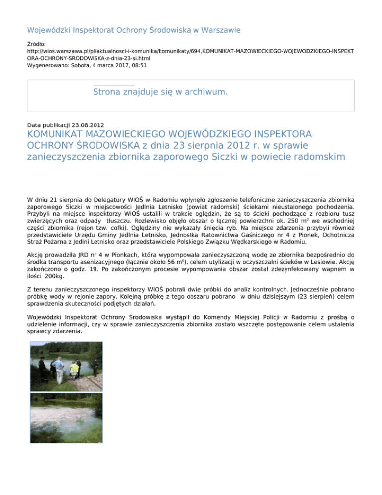 Wojewódzki Inspektorat Ochrony Środowiska w Warszawie Źródło: http://wios.warszawa.pl/pl/aktualnosci-i-komunika/komunikaty/694,KOMUNIKAT-MAZOWIECKIEGO-WOJEWODZKIEGO-INSPEKT ORA-OCHRONY-SRODOWISKA-z-dnia-23-si.html Wygenerowano: Sobota, 4 marca 2017, 08:51 Strona znajduje się w archiwum. Data publikacji 23.08.2012 KOMUNIKAT MAZOWIECKIEGO WOJEWÓDZKIEGO INSPEKTORA OCHRONY ŚRODOWISKA z dnia 23 sierpnia 2012 r. w sprawie zanieczyszczenia zbiornika zaporowego Siczki w powiecie radomskim W dniu 21 sierpnia do Delegatury WIOŚ w Radomiu wpłynęło zgłoszenie telefoniczne zanieczyszczenia zbiornika zaporowego Siczki w miejscowości Jedlnia Letnisko (powiat radomski) ściekami nieustalonego pochodzenia. Przybyli na miejsce inspektorzy WIOŚ ustalili w trakcie oględzin, że są to ścieki pochodzące z rozbioru tusz zwierzęcych oraz odpady tłuszczu. Rozlewisko objęło obszar o łącznej powierzchni ok. 250 m2 we wschodniej części zbiornika (rejon tzw. cofki). Oględziny nie wykazały śnięcia ryb. Na miejsce zdarzenia przybyli również przedstawiciele Urzędu Gminy Jedlnia Letnisko, Jednostka Ratownictwa Gaśniczego nr 4 z Pionek, Ochotnicza Straż Pożarna z Jedlni Letnisko oraz przedstawiciele Polskiego Związku Wędkarskiego w Radomiu. Akcję prowadziła JRD nr 4 w Pionkach, która wypompowała zanieczyszczoną wodę ze zbiornika bezpośrednio do środka transportu asenizacyjnego (łącznie około 56 m6), celem utylizacji w oczyszczalni ścieków w Lesiowie. Akcję zakończono o godz. 19. Po zakończonym procesie wypompowania obszar został zdezynfekowany wapnem w ilości 200kg. Z terenu zanieczyszczonego inspektorzy WIOŚ pobrali dwie próbki do analiz kontrolnych. Jednocześnie pobrano próbkę wody w rejonie zapory. Kolejną próbkę z tego obszaru pobrano w dniu dzisiejszym (23 sierpień) celem sprawdzenia skuteczności podjętych działań. Wojewódzki Inspektorat Ochrony Środowiska wystąpił do Komendy Miejskiej Policji w Radomiu z prośbą o udzielenie informacji, czy w sprawie zanieczyszczenia zbiornika zostało wszczęte postępowanie celem ustalenia sprawcy zdarzenia. Data publikacji 23.08.2012 Rejestr zmian Liczba wizyt: 626 Autor: Tomasz Klech Opublikowane przez Ewa Pacholska