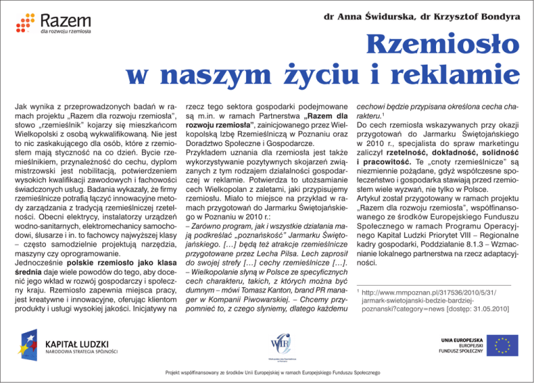 dr Anna Świdurska, dr Krzysztof Bondyra Rzemiosło w naszym życiu i reklamie Jak wynika z przeprowadzonych badań w ramach projektu „Razem dla rozwoju rzemiosła”, słowo „rzemieślnik” kojarzy się mieszkańcom Wielkopolski z osobą wykwalifikowaną. Nie jest to nic zaskakującego dla osób, które z rzemiosłem mają styczność na co dzień. Bycie rzemieślnikiem, przynależność do cechu, dyplom mistrzowski jest nobilitacją, potwierdzeniem wysokich kwalifikacji zawodowych i fachowości świadczonych usług. Badania wykazały, że firmy rzemieślnicze potrafią łączyć innowacyjne metody zarządzania z tradycją rzemieślniczej rzetelności. Obecni elektrycy, instalatorzy urządzeń wodno-sanitarnych, elektromechanicy samochodowi, ślusarze i in. to fachowcy najwyższej klasy – często samodzielnie projektują narzędzia, maszyny czy oprogramowanie. Jednocześnie polskie rzemiosło jako klasa średnia daje wiele powodów do tego, aby docenić jego wkład w rozwój gospodarczy i społeczny kraju. Rzemiosło zapewnia miejsca pracy, jest kreatywne i innowacyjne, oferując klientom produkty i usługi wysokiej jakości. Inicjatywy na rzecz tego sektora gospodarki podejmowane są m.in. w ramach Partnerstwa „Razem dla rozwoju rzemiosła”, zainicjowanego przez Wielkopolską Izbę Rzemieślniczą w Poznaniu oraz Doradztwo Społeczne i Gospodarcze. Przykładem uznania dla rzemiosła jest także wykorzystywanie pozytywnych skojarzeń związanych z tym rodzajem działalności gospodarczej w reklamie. Potwierdza to utożsamianie cech Wielkopolan z zaletami, jaki przypisujemy rzemiosłu. Miało to miejsce na przykład w ramach przygotowań do Jarmarku Świętojańskiego w Poznaniu w 2010 r.: – Zarówno program, jak i wszystkie działania mają podkreślać „poznańskość” Jarmarku Świętojańskiego. […] będą też atrakcje rzemieślnicze przygotowane przez Lecha Pilsa. Lech zaprosił do swojej strefy […] cechy rzemieślnicze […]. – Wielkopolanie słyną w Polsce ze specyficznych cech charakteru, takich, z których można być dumnym – mówi Tomasz Kanton, brand PR manager w Kompanii Piwowarskiej. – Chcemy przypomnieć to, z czego słyniemy, dlatego każdemu cechowi będzie przypisana określona cecha charakteru.1 Do cech rzemiosła wskazywanych przy okazji przygotowań do Jarmarku Świętojańskiego w 2010 r., specjalista do spraw marketingu zaliczył rzetelność, dokładność, solidność i pracowitość. Te „cnoty rzemieślnicze” są niezmiennie pożądane, gdyż współczesne społeczeństwo i gospodarka stawiają przed rzemiosłem wiele wyzwań, nie tylko w Polsce. Artykuł został przygotowany w ramach projektu „Razem dla rozwoju rzemiosła”, współfinansowanego ze środków Europejskiego Funduszu Spo łecz ne go w ra mach Pro gra mu Ope ra cyj ne go Kapitał Ludzki Priorytet VIII – Regionalne kadry gospodarki, Poddziałanie 8.1.3 – Wzmacnianie lokalnego partnerstwa na rzecz adaptacyjności. 1 http://www.mmpoznan.pl/317536/2010/5/31/ jarmark-swietojanski-bedzie-bardziejpoznanski?category=news [dostęp: 31.05.2010] Projekt współfinansowany ze środków Unii Europejskiej w ramach Europejskiego Funduszu Społecznego
