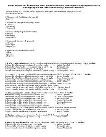 Medale zawodników Ścinawskiego Klubu Karate na zawodach karate sportowego przeprowadzonych według przepisów WKF (Światowa Federacja Karate) w 2007 roku. Uczestniczyliśmy w 22 zawodach rangi regionalnej, okręgowej, ogólnopolskiej, międzynarodowej. Zdobyliśmy 149 medali. W Mistrzostwach Polski Seniorów 1 medal 1 Brązowy W 6 zawodach Międzynarodowych 38 medali 9 Złotych 12 Srebrnych 17 Brązowych W 6 zawodach Ogólnopolskich 61 medali 21 Złotych 21 Srebrnych 19 Brązowych W 8 zawodach Okręgowych 41 medali 12 Złotych 17 Srebrnych 12 Brązowych W 1 zawodach Regionalnych 8 medali 2 Złote 3 Srebrne 3 Brązowe I. Środa Wielkopolska: 12.03.2007 r. Ogólnopolski Turniej Karate Dzieci i Młodzieży DRAGON CUP. 4 medale Złoty medal w kumite dziewcząt żaczek 12-13 lat -40 kg - Izabela Ogrodnik Złoty medal w kumite chłopców młodzików 14-15 lat +60 kg - Bartosz Sternik Srebrny medal w kumite mężczyzn +18 lat -65 kg - Artur Trubicki Brązowy medal w kumite chłopców młodzików 14-15 lat -60 kg - Żołądziejewski Oskar II. Legnica: 31.03.2007 r. Ogólnopolski Otwarty Puchar Dolnego Śląska w Karate „SILESIA CUP”. 7 medali Złoty medal w konkurencji kumite młodzików 14-15 lat -50 kg - Kacper Zawada Złoty medal w konkurencji kumite młodzików 14-15 lat -55 kg - Oskar Żołądziejewski Srebrny medal w konkurencji kumite żaczek 12-13 lat open - Izabela Ogrodnik Srebrny medal w konkurencji kumite mężczyzn +18 lat -70 kg - Artur Trubicki Srebrny medal w konkurencji kumite drużynowe open (1 młodzik, 1 kadet, 1 +18 lat) Skład drużyny; Oskar Żołądziejewski, Bartosz Sternik, Artur Trubicki Brązowy medal w konkurencji kumite młodzików 14-15 lat +60 kg - Bartosz Sternik Brązowy medal w konkurencji kumite kadetów 16-17 lat -60 kg - Paweł Bicz III. Prochowice: 13.04.2007 r. Okręgowy Wiosenny Turniej Karate Dzieci. 9 medali Złoty medal w shiaj kumite dziewcząt rocznik 1994 - Izabela Ogrodnik Złoty medal w shiaj kumite chłopców rocznik 1993 - Oskar Żołądziejewski Złoty medal w shiaj kumite chłopców rocznik 1992 - Bartosz Sternik Srebrny medal w shiaj kumite chłopców rocznik 1993 - Tomasz Wodziński Srebrny medal w shiaj kumite chłopców rocznik 1994 - Grzegorz Konieczny Srebrny medal w shiaj kumite chłopców rocznik 1991 - Paweł Bicz Srebrny medal w walce reżyserowanej chłopców od 12 lat Skład drużyny - Oskar Żołądziejewski, Bartosz Sternik, Tomasz Wodziński, Kacper Zawada Brązowy medal w kata ind. chłopców rocznik 1992 - Bartosz Sternik Brązowy medal w shiaj kumite chłopców rocznik 1992 - Marcin Poliwka IV. Kalisz: 14.04.2007 r. Mistrzostwa Polski w karate WKF Seniorów. 1 medal Brązowy medal w konkurencji kumite -60 kg - Artur Trubicki V. Oborniki Wielkopolskie: 21.04.2007 r. Okręgowy Turniej Karate OBORNIKI’ 2007. 3 medale Srebrny medal w kumite żaczek 12-13 lat -45 kg - Izabela Ogrodnik Srebrny medal w kumite młodzików 14-15 lat +55 kg - Bartosz Sternik Brązowy medal w kumite młodzików 14-15 lat -55 kg - Tomasz Wodziński VI. Lubin: 22.04.2007 r. Okręgowe zawody karate o Puchar Zagłębia Miedziowego. 10 medali Złoty medal w shiaj kumite dziewcząt rocznik 95-94 open - Izabela Ogrodnik Złoty medal w shiaj kumite chłopców rocznik 93-92 +55 kg - Oskar Żołądziejewski Złoty medal w shiaj kumite chłopców rocznik 93-92 -55 kg - Tomasz Wodziński Złoty medal w walce reżyserowanej open Skład drużyny - Oskar Żołądziejewski, Bartosz Sternik, Tomasz Wodziński, Kacper Zawada. Srebrny medal w shiaj kumite chłopców rocznik 93-92 +55 kg - Bartosz Sternik Srebrny medal w shiaj kumite chłopców rocznik 93-92 -55 kg - Tomasz Wodziński Srebrny medal w shiaj kumite chłopców rocznik 95-94 open - Bartosz Bicz Srebrny medal w shiaj kumite dziewcząt rocznik 95-94 open - Dagmara Stelmaczonek Brązowy medal w shiaj kumite chłopców rocznik 93-92 -55 kg - Kacper Zawada Brązowy medal w shiaj kumite chłopców rocznik 91-92 +60 kg - Daniel Huzarski VII. Środa Śląska: 13.05.2007 r. Ogólnopolski Turniej Karate „BUDOKAN CUP’ 2007”. 9 medali Złoty medal w kumite dziewcząt rocznik 95-94 +40 kg - Izabela Ogrodnik Złoty medal w kumite chłopców rocznik 93-92 -50 kg - Kacper Zawada Srebrny medal w kumite chłopców rocznik 95-94 -45 kg - Bartosz Bicz Srebrny medal w kumite chłopców rocznik 93-92 -50 kg - Tomasz Wodziński Srebrny medal w kumite chłopców rocznik 93-92 +50 kg - Oskar Żołądziejewski Srebrny medal w kumite chłopców rocznik 91-90 -60 kg - Paweł Bicz Brązowy medal w kumite chłopców rocznik 93-92 +50 kg - Michał Kasper Brązowy medal w kumite chłopców rocznik 91-90 -60 kg - Grzegorz Mierka Brązowy medal w kumite chłopców rocznik 93-92 +50 kg - Daniel Huzarski VIII. Brzeg-Dolny: 19.05.2007 r. Międzynarodowy Puchar Polski Karate Dzieci, Młodzików i Juniorów Młodszych oraz Mistrzostwa Polski Karate Seniorów Starszych „Dinozaurów”. 3 medale Złoty medal w kumite młodzików rocznik 1993-92 +55kg - Bartosz Sternik Srebrny medal w kata „Dinozaurów” wiek 35-39 lat - Maciej Sternik Brązowy medal w kumite młodzików rocznik 1993-92 +55kg - Oskar Żołądziejewski IX. Bielsko-Biała: 02.06.2007 r. Międzynarodowe Mistrzostwa Bielska-Białej w Karate. 9 medali Złoty medal w kumite juniorów i seniorów (+18 lat) -65 kg - Artur Trubicki Złoty medal w kumite młodzików 14-15 lat +60 kg - Bartosz Sternik Srebrny medal w kumite juniorów młodszych 16-17 lat -60 kg - Paweł Bicz Brązowy medal w kumite żaków 12-13 lat open - Izabela Ogrodnik Brązowy medal w kumite dzieci 10-11 lat -35 kg - Bartosz Bicz Brązowy medal w kumite młodzików 14-15 lat -55 kg - Kacper Zawada Brązowy medal w kumite młodzików 14-15 lat -60 kg - Oskar Żołądziejewski Brązowy medal w kumite młodzików 14-15 lat +60 kg - Daniel Huzarski Brązowy medal w kumite młodzików 14-15 lat -60 kg - Michał Kasper X. Leszno: 16.06.2007 r. Okręgowe Leszczyńskie Mistrzostwa Karate o Puchar Prezydenta Mias