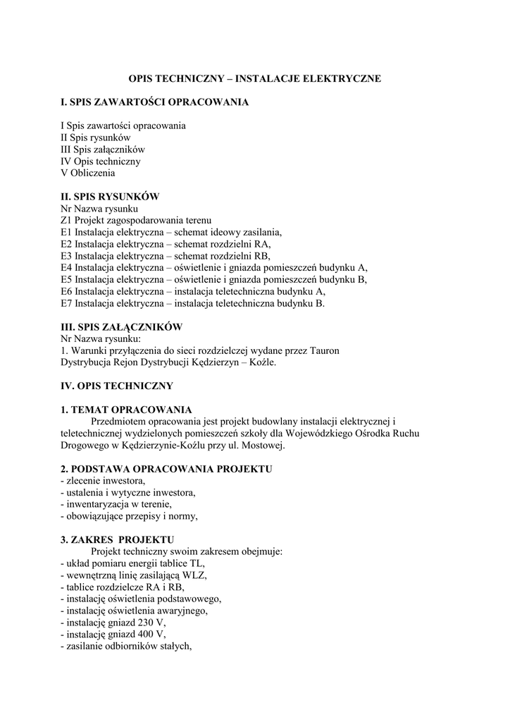 OPIS TECHNICZNY – INSTALACJE ELEKTRYCZNE I. SPIS ZAWARTOŚCI OPRACOWANIA I Spis zawartości opracowania II Spis rysunków III Spis załączników IV Opis techniczny V Obliczenia II. SPIS RYSUNKÓW Nr Nazwa rysunku Z1 Projekt zagospodarowania terenu E1 Instalacja elektryczna – schemat ideowy zasilania, E2 Instalacja elektryczna – schemat rozdzielni RA, E3 Instalacja elektryczna – schemat rozdzielni RB, E4 Instalacja elektryczna – oświetlenie i gniazda pomieszczeń budynku A, E5 Instalacja elektryczna – oświetlenie i gniazda pomieszczeń budynku B, E6 Instalacja elektryczna – instalacja teletechniczna budynku A, E7 Instalacja elektryczna – instalacja teletechniczna budynku B. III. SPIS ZAŁĄCZNIKÓW Nr Nazwa rysunku: 1. Warunki przyłączenia do sieci rozdzielczej wydane przez Tauron Dystrybucja Rejon Dystrybucji Kędzierzyn – Koźle. IV. OPIS TECHNICZNY 1. TEMAT OPRACOWANIA Przedmiotem opracowania jest projekt budowlany instalacji elektrycznej i teletechnicznej wydzielonych pomieszczeń szkoły dla Wojewódzkiego Ośrodka Ruchu Drogowego w Kędzierzynie-Koźlu przy ul. Mostowej. 2. PODSTAWA OPRACOWANIA PROJEKTU - zlecenie inwestora, - ustalenia i wytyczne inwestora, - inwentaryzacja w terenie, - obowiązujące przepisy i normy, 3. ZAKRES PROJEKTU Projekt techniczny swoim zakresem obejmuje: - układ pomiaru energii tablice TL, - wewnętrzną linię zasilającą WLZ, - tablice rozdzielcze RA i RB, - instalację oświetlenia podstawowego, - instalację oświetlenia awaryjnego, - instalację gniazd 230 V, - instalację gniazd 400 V, - zasilanie odbiorników stałych, - zasilanie urządzeń wentylacji, - instalację sygnalizacji włamania, - instalację telefoniczną, - instalację sieci komputerowej LAN, - instalację połączeń wyrównawczych, - instalacje oświetlenia zewnętrznego. 4. CHARAKTERYSTYKA ENERGETYCZNA OBIEKTU Parametry projektowe: Napięcie znamionowe: 230/400V Moc przyłączeniowa obiektu: 40 kW Pożądany współczynnik mocy: tg < 0,4 Układ sieci zasilającej: TN-C Układ sieci wewnętrznej: TN-S Ochrona od porażeń: samoczynne wyłączenia zasilania 5. ZASILANIE OBIEKTU. 5.1. Przyłącze energetyczne Budynek szkoły zlokalizowany przy ul. Mostowej w Kędzierzynie – Koźlu posiada istniejące zasilanie w energię elektryczną. Obiekt zasilany jest za pomocą przyłącza kablowego 0,4 kV typu YAKY 4x120 mm2 ze stacji transformatorowej 15/0,4 kV „Azoty Zacisze”. Kabel przyłącza doprowadzony jest do zlokalizowanego na frontowej ścianie budynku złącza kablowego nr ZK-4971. 5.2. Układ pomiaru energii Ze złącza kablowego wyprowadzić wewnętrzna linię zasilającą wyłącznik przeciwpożarowy prądu zabudowany w skrzynce IP65 z szybką nad złączem kablowym. Z projektowanego wyłącznika p-poż zasilić projektowaną tablicę licznikową pomieszczeń WORD oraz istniejąca tablicę pomiarową szkoły. Zgodnie z technicznymi warunkami przyłączenia wydanymi przez Tauron Dystrybucję układ pomiarowy zostanie zabudowany na zewnętrznej ścianie budynku. Tablica licznikowa wyposażona będzie w zabezpieczenie przelicznikowe, tablice licznikowa dla zabudowy trójfazowego bezpośredniego licznika energii elektrycznej, wyłączników zalicznikowych zabezpieczających tablice rozdzielcze RA i RB. Schemat ideowy zasilania pokazuje rysunek nr E-1. 5.3. Wewnętrzna linia zasilająca – zasilanie rozdzielnic RA i RB. W celu zasilenia tablic rozdzielczych wydzielonych pomieszczeń Wojewódzkiego Ośrodka Ruchu Drogowego należy z projektowanej tablicy licznikowej zabudowanej na zewnętrznej ścianie budynku wyprowadzić wewnętrzne linie zasilające tablice rozdzielcze RA i RB przewodami YKY 5x16mm prowadzonymi w rurach osłonowych RL 37mm korytarzem szkoły. Ze złącza kablowego wyprowadzić wlz przewodem YKY 5x70mm w rurze osłonowej Arot 75mm. 6. INSTALACJA WEWNĘTRZNA 6.1. Tablice rozdzielcze RA i RB Tablice rozdzielcze pomieszczeń WORD w budynku A i w budynku B wykonać jako podtynkowe. Jako obudowy rozdzielnic zastosować prefabrykowane szafki umożliwiające zabudowę 96 modułów, stopniu ochrony IP 43 i drugiej klasie izolacji zamykane na klucz. Rozdzielnie wyposażyć w aparaty i osprzęt elektroinstalacyjny niskiego napięcia zgodnie ze schematami ideowymi zasilania rys. nr. E-2 i E-3. Obwody jednofazowe wyprowadzone z rozdzielnicy należy rozdzielić równomiernie na wszystkie fazy. W celu zabezpieczenia rozdzielni przed dostępem osób nieuprawnionych drzwi rozdzielnicy wyposażyć w zamknięcie na klucz. Zastosowany system zamknięć powinien umożliwiać zamykanie wszystkich rozdzielni elektrycznych za pomocą jednego klucza. Na drzwiczkach rozdzielni nanieść numerację rozdzielni oraz umieścić wymagane tabliczki informacyjne i ostrzegawcze. 6.2. Instalacja oświetlenia Oświetlenie podstawowe poszczególnych pomieszczeń, w zależności od ich przeznaczenia i funkcji zaprojektowano przyjmując odpowiednie kryteria zgodne z PN-EN 12464 : 2012 - wartość eksploatacyjnego średniego natężenia oświetlenia Em w poszczególnych pomieszczeniach nie może być mniejsza niż podana w tabeli 1, - wartość oceny olśnienia przykrego UGR nie powinna przekraczać wartości podanej w tabeli 1, - wartość wskaźnika oddawania barw Ra nie powinna być mniejsza niż podana w tabeli 1, do obliczeń przyjęto współczynnik utrzymania = 1,3 TABELA 1 Rodzaj pomieszczenia, strefy strefy komunikacji, korytarze w ciągu dnia hall wejściowy biura szatnie umywalnie sala egzaminacyjna magazyny pomieszczenie techniczne Em (Lux) 100 UGR Ra 25 80 200 500 200 200 500 100 200 22 22 25 25 19 25 25 80 80 80 80 80 80 60 - równomierność oświetlenia na płaszczyźnie roboczej przy pracy ciągłej powinna wynosić co najmniej 0,6 a przy krótkotrwałej oraz w strefach komunikacyjnych co najmniej 0,4. 6.2.1. Oświetlenie podstawowe Obwody oświetlenia należy wyprowadzić bezpośrednio z tablic rozdzielczych RA i RB. Typy przewodów jakimi należy wykonać p