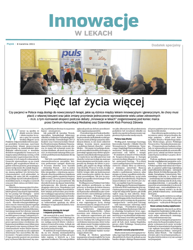Innowacje W LEKACH Piątek | 8 kwietnia 2011 MATERIAŁY PRASOWE Dodatek specjalny Pięć lat życia więcej Czy pacjenci w Polsce mają dostęp do nowoczesnych terapii, jakie są różnice między lekiem innowacyjnym i generycznym, ile chory musi płacić z własnej kieszeni oraz jakie zmiany przyniesie jednoczesne wprowadzenie wielu ustaw zdrowotnych – m.in. o tym rozmawiali eksperci podczas debaty „Innowacje w lekach” zorganizowanej pod koniec marca przez Centrum Komunikacji Medialnej oraz Dziennikarski Klub Promocji Zdrowia W szyscy są zgodni, że dzięki nowym lekom i skutecznemu leczeniu o pięć lat wzrosła średnia długość życia Polaków. Odpowiedniki referencyjnego produktu leczniczego, nazywane powszechnie lekami generycznymi (genetykami) są zamiennikami (produktami odtwórczymi) w stosunku do leków oryginalnych. Oznacza to, że mają tę samą substancję czynną, co lek innowacyjny i są przeznaczone do stosowania w tych samych wskazaniach. Generyki wprowadzane są na rynek dopiero, gdy oryginalnym lekom wygaśnie ochrona prawna, gwarantująca prawo wyłączności. By zostały dopuszczone do obrotu i mogły być stosowane, muszą spełniać tzw. kryteria biorównoważności, czyli udowodnić, że działają tak samo jak lek oryginalny. Nie poddaje się ich rozbudowanym testom klinicznym, w związku z czym ich cena jest dużo niższa niż leków innowacyjnych. – Rola leków innowacyjnych to kreowanie postępu w medycynie, rolą zaś leków generycznych jest zapewnienie, by ten postęp był dostępny – mówi Grzegorz Cessak, prezes Urzędu Rejestracji Produktów Leczniczych, Wyrobów Medycznych i Produktów Biobójczych. – Kwestie relacji produktów generycznych z innowacyjnymi reguluje okres wyłączności danych, czyli czas, po jakim od zarejestrowania leku innowacyjnego może być złożony wniosek o zarejestrowanie odpowiadającego mu leku generycznego. Leki generyczne są tańsze, a proces ich rejestracji jest znacznie mniej skomplikowany poprzez uproszczenia i zwolnienia z dokumentacji niekliniecznej i klinicznej. Leki generyczne muszą wykazać biorównoważność wobec leków innowacyjnych, co pozwala na ich zamienne stosowanie bez uszczerbku dla skuteczności i bezpieczeństwa leczenia. Z tego powodu pacjent nie powinien przy wyborze leku kierować się zasa- dą, że jeśli lek jest droższy to na pewno lepszy – uważa prezes. Jak pokreślił dr Jarosław Woroń, specjalista farmakologii klinicznej, adiunkt w Zakładzie Farmakologii Klinicznej Katedry Farmakologii CM UJ Kraków oraz Uniwersyteckim Ośrodku Monitorowania i Badania Niepożądanych Działań Leków, często się zdarza, że znany lek wykazuje nowe, korzystne działanie, ale może się też zdarzyć, że stosowanie tańszego leku o pozornie podobnym mechanizmie źle się kończy. – Tak było z powikłaniami po przeciwnowotworowym anvastinie, którym próbowano zastąpić skuteczny w leczeniu choroby oczu lucentis – stwierdza Woroń. – Jest to jeden z przykładów, w których zastosowanie leku niezgodnie z rejestracją spowodowało chorobę polekową (zapalenia gałki ocznej, jałowe zapalenia wnętrza gałki ocznej). Zresztą nawet dostępny bez recepty lek na przeziębienie dla dorosłych może się okazać śmiertelnie niebezpieczny dla dziecka poniżej drugiego roku życia. Niepokojący jest fakt, że na nieracjonalne stosowanie leków istnieje powszechne przyzwolenie wynikające najczęściej z niewiedzy na temat działań niepożądanych indukowanych przez leki. Co gorsza, na nieracjonalne podawanie leków poza wskazaniami zgadzają się także działające w szpitalach komitety terapeutyczne. Nierówny dostęp do terapii i niejasne procedury Jak zauważył dr n. med. Janusz Meder, prezes Polskiej Unii Onkologii, to, że żyjemy coraz dłużej, to w dużej mierze zasługa nowych leków i skuteczniejszych metod leczenia. Jednak nie wszyscy pacjenci mają łatwy dostęp do nowoczesnych terapii. W niektórych województwach zgodę na tzw. chemię niestandardową można uzyskać dość szybko, ale są też takie regiony, w których są z tym ogromne trudności. Ten sam problem zgłaszali podczas debaty przedstawiciele organizacji pacjentów. – Powodem tego jest brak jednolitego sytemu opartego, wzorem Austrii, na precedensie (jeśli płatnik wydał zgodę na leczenie jednego pacjenta określonym lekiem, to nie może odmówić takiego leczenia innym pacjentom o podobnej historii choroby) – mówi Meder. – Nie mamy też pełnego dostępu do wszystkich możliwych terapii, co powoduje ograniczony dobór opcji terapeutycznej dla konkretnego pacjenta. Często leczy się tylko pierwszy rzut choroby iwówczas wydaje się znaczące kwoty pieniężne nato leczenie, anie zapewnia się dostępu do leków w przypadku, gdy pojawi się drugi i kolejny rzut choroby. Przeczy to tezie, że raka traktujemy jako schorzenie przewlekłe. Gdyby terapie dało się kontynuować, wiele nowotworów stałoby się chorobami przewlekłymi. Tak jest na przykład w przypadku stosowanego w białaczkach imatinibu. Według prezesa Polskiej Unii Onkologii istotnym problemem są także przerwy w dostępie do leków innowacyjnych, które wynikają z nieczytelnych procedur administracyjno-systemowych lub z niewydolnego systemu organizacyjnego. – W kraju, gdzie raka diagnozuje się w większości przypadków w zaawansowanym stadium, a więc zagrażającym życiu, dostęp do innowacyjnych, ratujących życie leków powinien być zapewniony prawnie, budżetowo, organizacyjnie – stwierdza dr Janusz Meder. – Lekarz powinien móc dokonywać wyboru, czy większym zagrożeniem jest sam proces nowotworowy czy nie do końca jeszcze zbadany lek. Leki generyczne, czyli dawne innowacyjne, które wykazały skuteczność i bezpieczeństwo stosowania, powinny być ordynowane w każdym przypadku, w którym lekarz uzna, że ich działanie będzie wystarczająco skuteczne. Według dr. Medera sposobami na poprawę sytuacji m