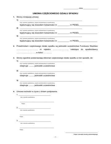 ______________, dnia ______________ UMOWA CZĘŚCIOWEGO DZIAŁU SPADKU 1. Strony niniejszej umowy: 1) ____________________________________________________________ imię i nazwisko spadkobiercy, stopień pokrewieństwa do spadkodawcy legitymujący się dowodem tożsamości nr __________, nr PESEL________________ 2) ____________________________________________________________ imię i nazwisko spadkobiercy, stopień pokrewieństwa do spadkodawcy legitymujący się dowodem tożsamości nr __________, nr PESEL________________ 3) ____________________________________________________________ imię i nazwisko spadkobiercy, stopień pokrewieństwa do spadkodawcy legitymujący się dowodem tożsamości nr __________, nr PESEL________________ 2. Przedmiotem częściowego działu spadku są jednostki uczestnictwa Funduszu Skarbiec …………………………, nr rejestru …………………., należące do spadkodawcy ………………………, w ilości: ………... 3. Strony zgodnie postanawiają dokonać częściowego działu spadku w ten sposób, że: 1) ____________________________________________________________ imię i nazwisko spadkobiercy, stopień pokrewieństwa do spadkodawcy obejmuje …….. jednostki uczestnictwa 2) ____________________________________________________________ imię i nazwisko spadkobiercy, stopień pokrewieństwa do spadkodawcy obejmuje …….. jednostki uczestnictwa 3) ____________________________________________________________ imię i nazwisko spadkobiercy, stopień pokrewieństwa do spadkodawcy obejmuje …….. jednostki uczestnictwa 4. Umowa wchodzi w życie z dniem podpisania. 1. _______________________________ imię i nazwisko spadkobiercy _________________________________ Podpis 2. _______________________________ imię i nazwisko spadkobiercy _________________________________ Podpis 3. _______________________________ imię i nazwisko spadkobiercy _________________________________ Podpis _______________________________ Podpis i pieczątka doradcy potwierdzającego -1-