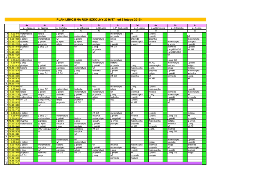 PLAN LEKCJI NA ROK SZKOLNY 2016/17 od 6 lutego 2017r. 4a p. I.Szczęch 4b p. Szajner 31 1 2 3 4 5 6 7 8 9 10 1 2 3 4 5 6 7 8 9 10 1 2 3 4 5 6 7 8 9 10 1 2 3 4 5 6 7 8 9 10 1 2 3 4 5 6 7 8 9 10 8.00-8.45 8.55-9.40 9.50-10.35 10.45-11.30 11.50-12.35 12.55-13.40 13.50-14.35 14.45-15.30 15.35-16.20 16.25-17.10 8.00-8.45 8.55-9.40 9.50-10.35 10.45-11.30 11.50-12.35 12.55-13.40 13.50-14.35 14.45-15.30 15.35-16.20 16.25-17.10 8.00-8.45 8.55-9.40 9.50-10.35 10.45-11.30 11.50-12.35 12.55-13.40 13.50-14.35 14.45-15.30 15.35-16.20 16.25-17.10 8.00-8.45 8.55-9.40 9.50-10.35 10.45-11.30 11.50-12.35 12.55-13.40 13.50-14.35 14.45-15.30 15.35-16.20 16.25-17.10 8.00-8.45 8.55-9.40 9.50-10.35 10.45-11.30 11.50-12.35 12.55-13.40 13.50-14.35 14.45-15.30 15.35-16.20 16.25-17.10 matematyka religia j, polski technika g. wych. przyroda wf matematyka j. ang. plastyka historia wf wf j. ang. religia j. polski matematyka inf. G2 j. polski przyroda wf muzyka matematyka f. 29 religia plastyka matematyka j. polski przyroda j. ang. G2 4c p. Osińska 24 j. polski matematyka wf g. wych. religia 10 matematyka f. j. polski g. wych. przyroda wf wf j. polski matematyka przyroda j. ang. inf. G1 j. polski religia wf matematyka j. ang. wdż j. ang. G2 j. polski religia matematyka j.angG1/infG2 historia wf matematyka f. j. polski technika j. ang. religia przyroda technika matematyka j. polski j. ang. przyroda inf. G2 j. ang. G1 matematyka przyroda g. wych. j. polski infG1/j.angG2 matematyka j. polski j. polski muzyka j. ang. wf wf j. polski j. polski matematyka j. ang. G1 wf j. polski j. polski matematyka j. ang. przyroda inf. G1 5a p. M.Soroka matematyka f. muzyka wf technika przyr matematyka wf historia plastyka przyroda inf. G2 historia j. ang. matematyka plastyka przyroda muzyka wf wf matematyka j. polski j. polski religia inf. G1 5b p. K.Luboń 10 matematyka f. religia plastyka j. ang. przyroda wf 5c p. P. Godlewski 26 matematyka f. przyroda religia wf j. polski inf. G1 5d p. A.Łaziuk 29 6a p. A.Kamińska 30 wf j. polski przyroda matematyka g. wych. j. polski j. polski plastyka historia wf j. ang. matematyka religia j. polski plastyka inf. G2 matematyka j. ang. przyroda religia wf inf. G1 historia matematyka j. polski wf technika j. ang. matematyka historia przyroda j. polski j. polski wf inf. G2 wdż j. polski matematyka przyroda religia wf matematyka religia wf j. ang. technika wdż j. ang. wf technika matematyka j. polski j. polski inf. G2 j. polski matematyka historia j. ang. wf inf. G2 muzyka matematyka g.wych. j. polski j. polski inf. G1 matematyka j. polski j. angielski g. wych. plastyka wf historia j. ang. matematyka przyroda inf. G1 j. polski j. polski g. wych. matematyka wf przyroda j. ang. wf j. polski matematyka przyroda j. ang. muzyka matematyka j. ang. j. polski wf przyroda matematyka religia j. polski wf przyroda muzyka religia technika przyroda matematyka j. polski muzyka 6b p. A.Borecka 25 matematyka g. wych. przyroda j.angG1/infG2 j.angG2/infG1 wf j. ang. G1 matematyka historia religia j. polski j. polski przyroda przyroda matematyka j. polski j. polski wf j. ang. G2 j. polski historia technika wf muzyka j. ang. G1 matematyka plastyka religia wf j. polski j. ang. G2 6c p. A.Łada 26 wf matematyka plastyka j. polski j. polski inf. G1 j. polski religia historia matematyka technika j. ang. wf j. polski matematyka wf przyroda j. ang. historia wf przyroda g. wych. j. ang. inf.G2 j. polski j. polski przyroda matematyka muzyka religia